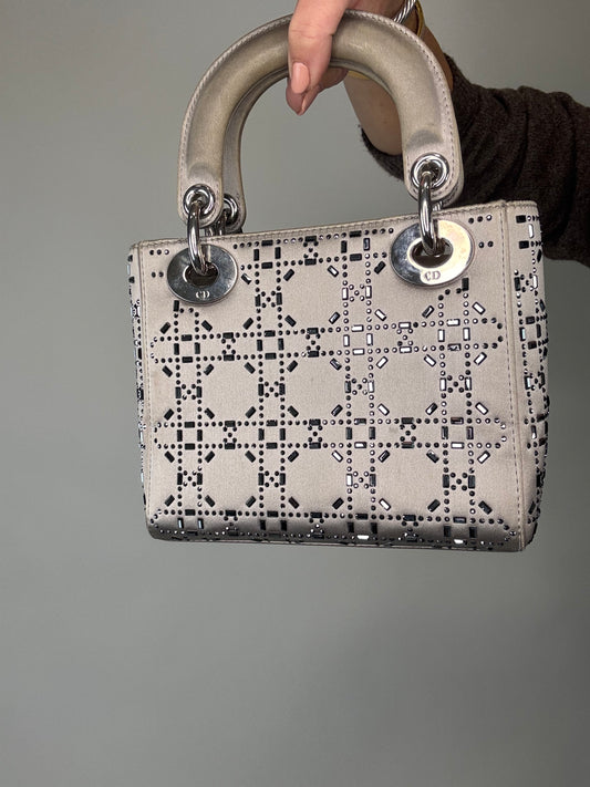 Christian Dior Mini Satin Cannage Crystal Embellished Lady Dior - Silver