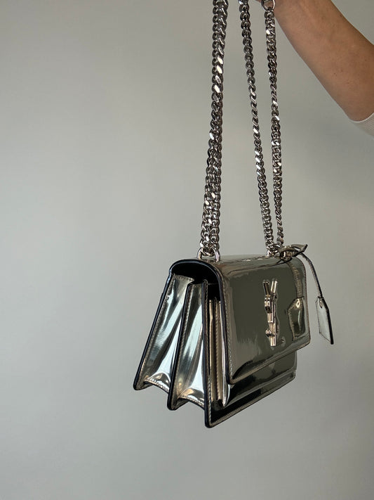 SAINT LAURENT PARIS Sunset Small Shoulder Bag Silver Patent Leather