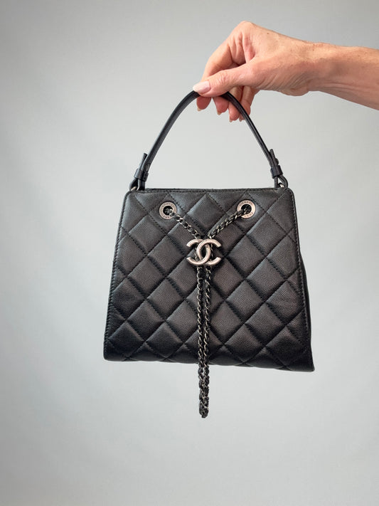 Chanel Small CC Bucket Bag – Black Caviar Leather & Silver Hardware