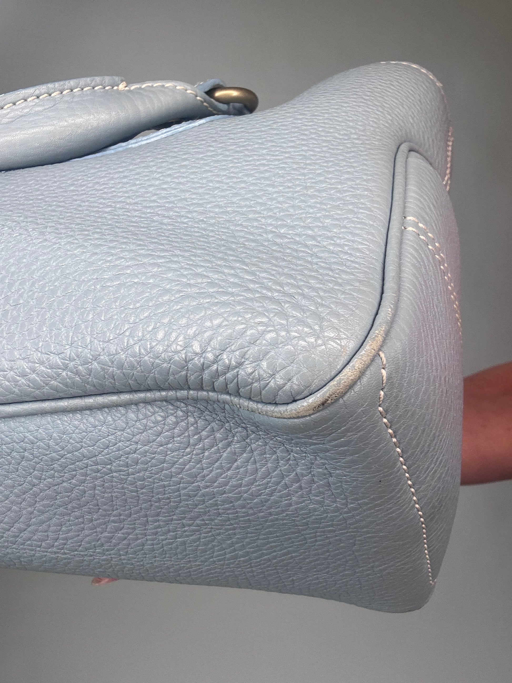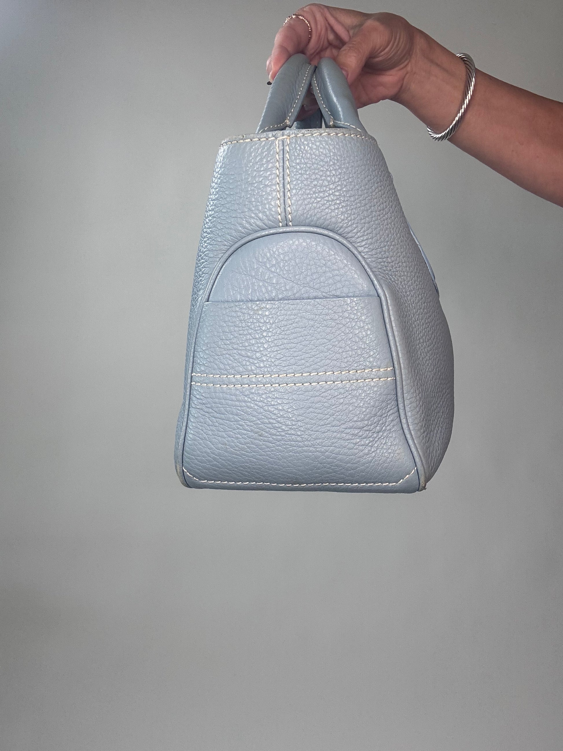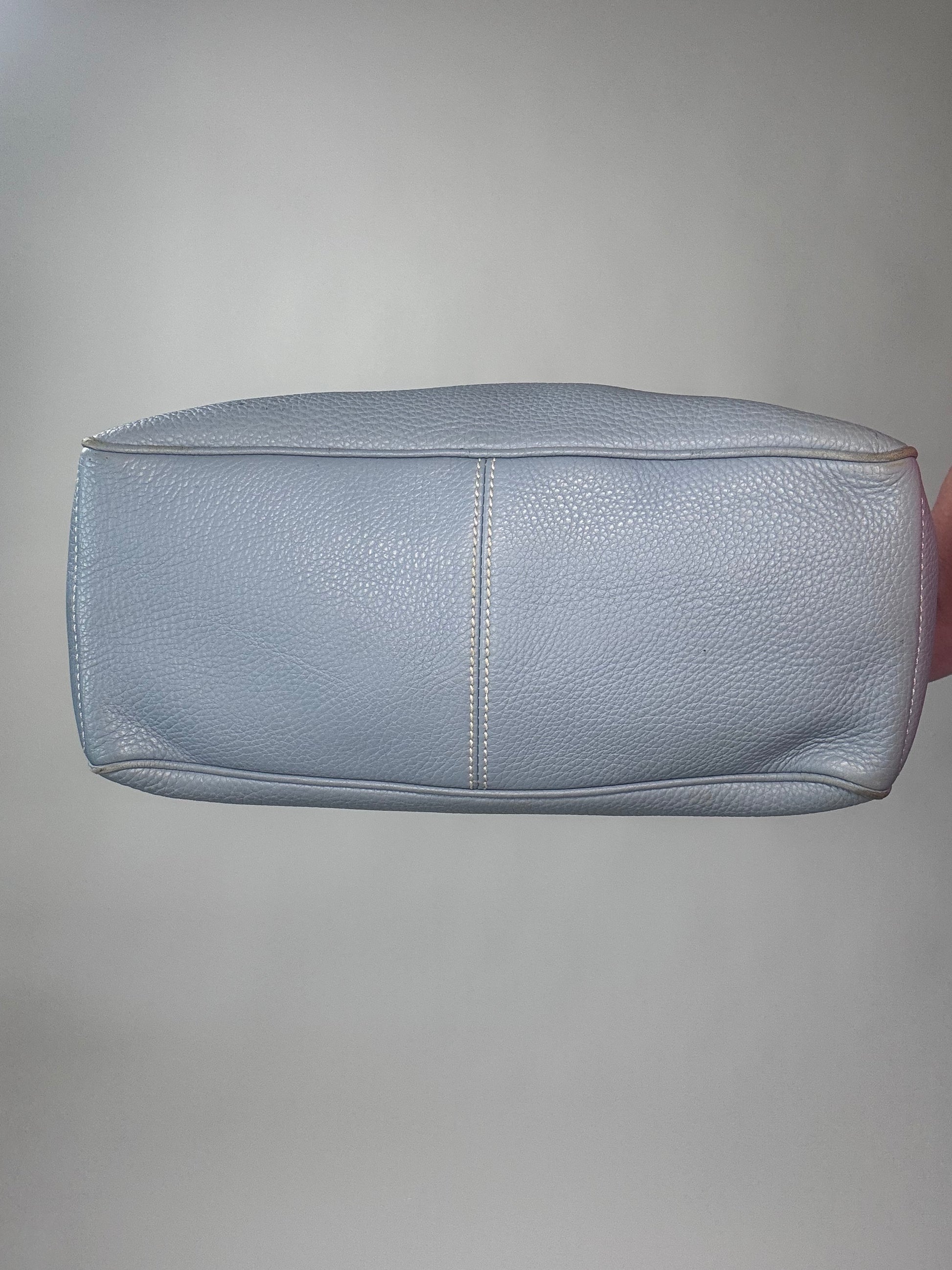 This preowned Celine Leather Boogie Bag is designed in light blue gorgeous grained leather. The fabric interior has several pockets and a zippered section, keeping all of your items organized. The outer side pockets are for easy storage. A beautiful bag perfect for all seasons!