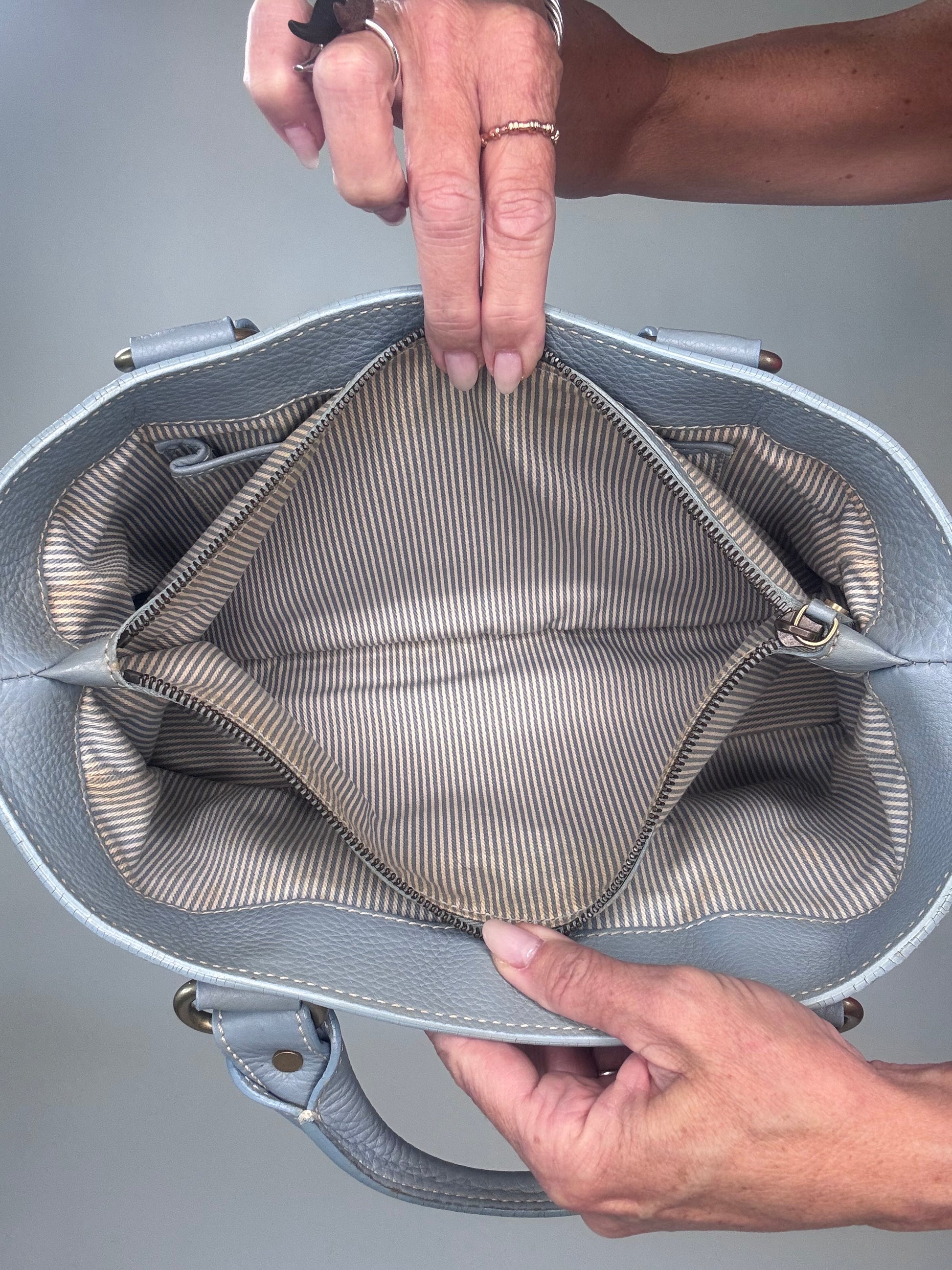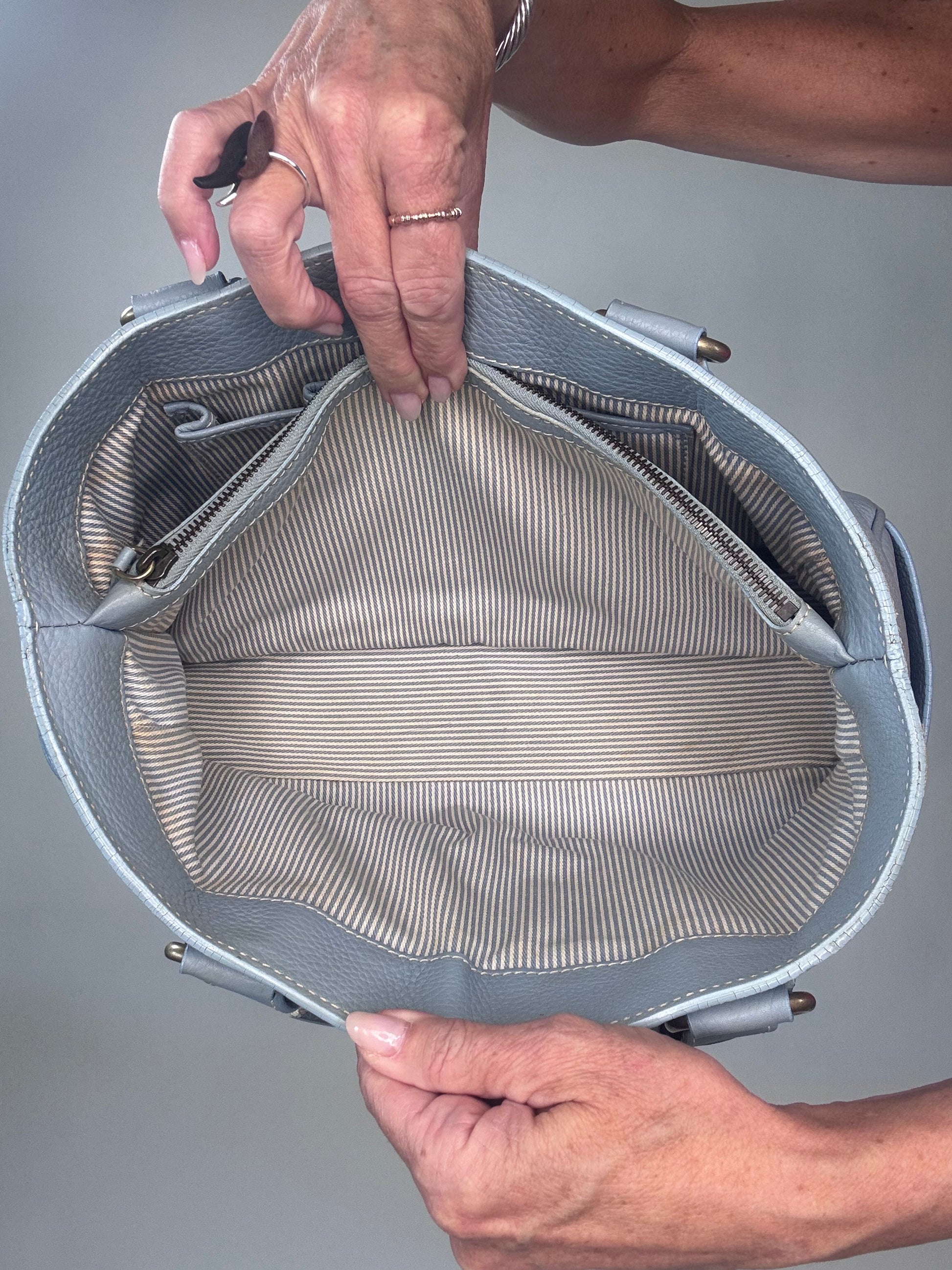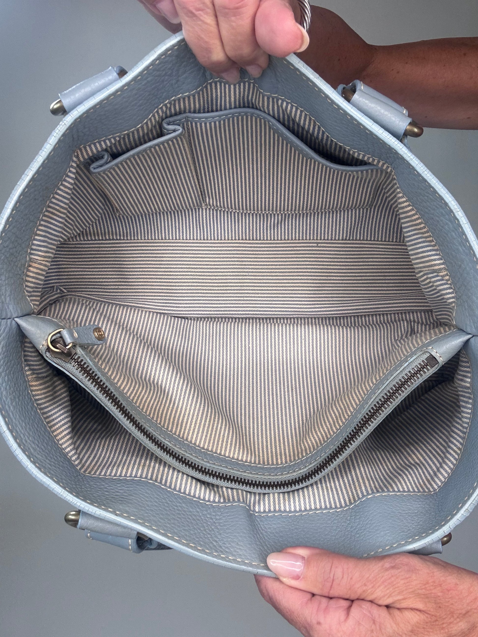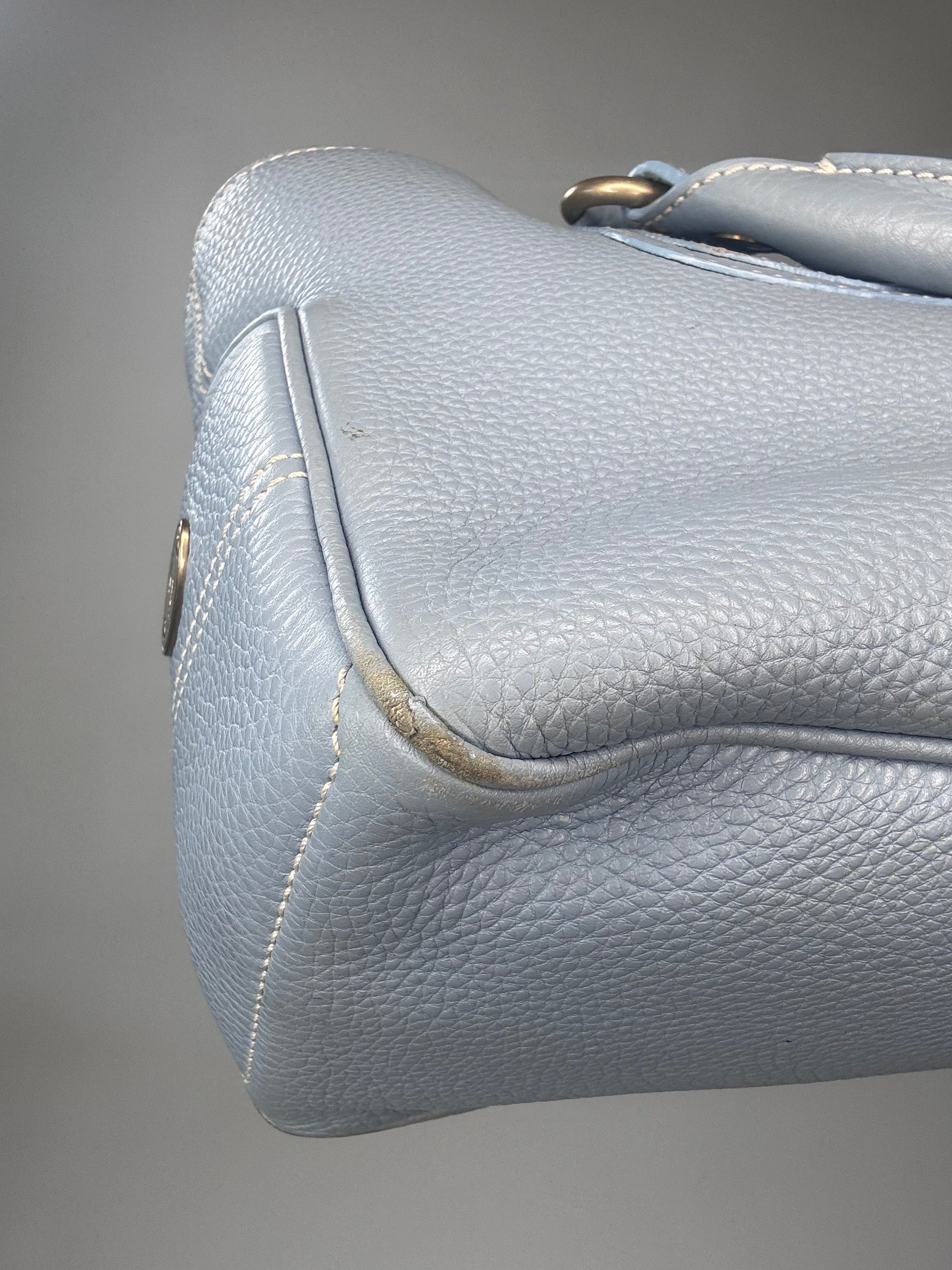 This preowned Celine Leather Boogie Bag is designed in light blue gorgeous grained leather. The fabric interior has several pockets and a zippered section, keeping all of your items organized. The outer side pockets are for easy storage. A beautiful bag perfect for all seasons!