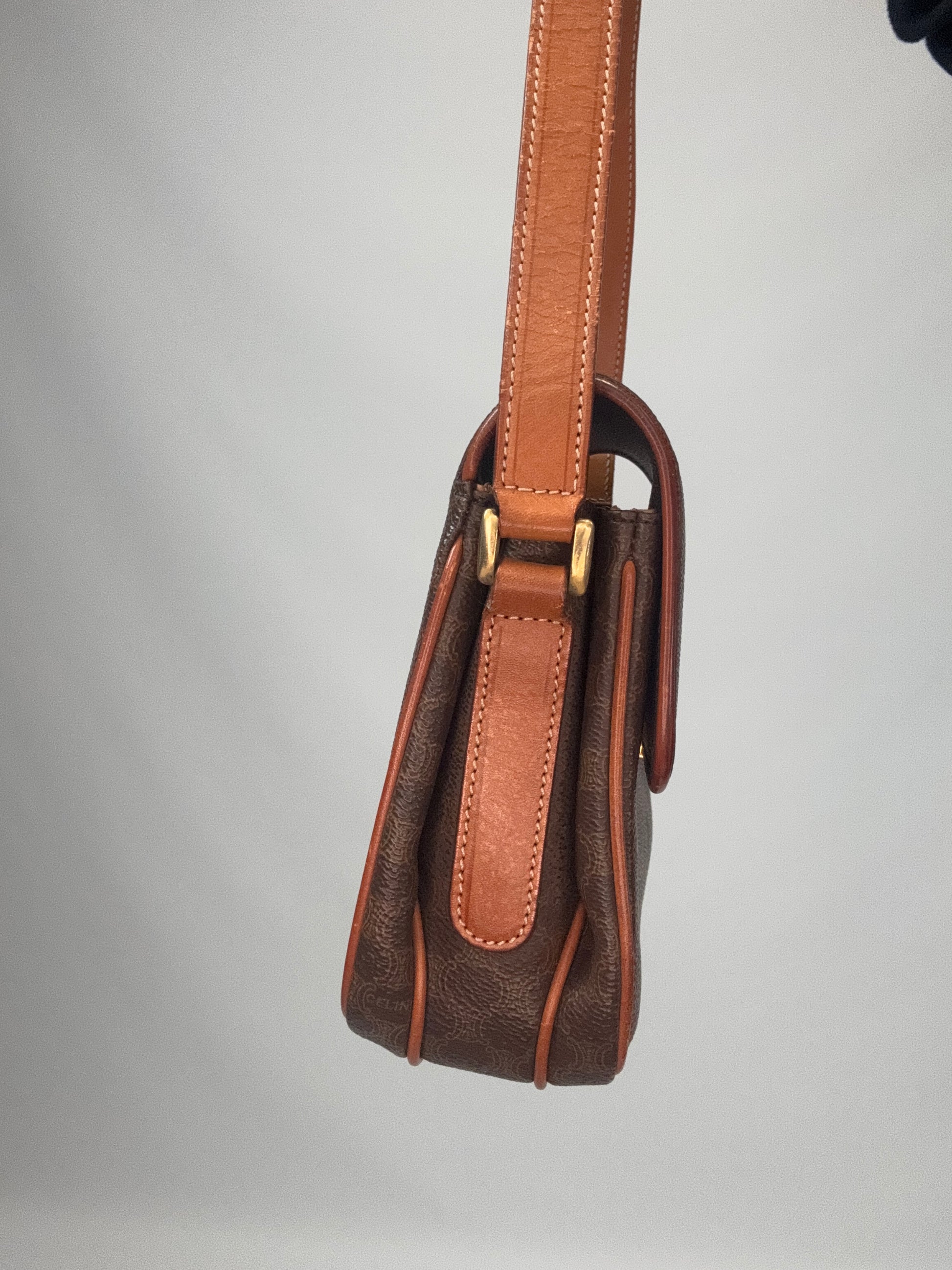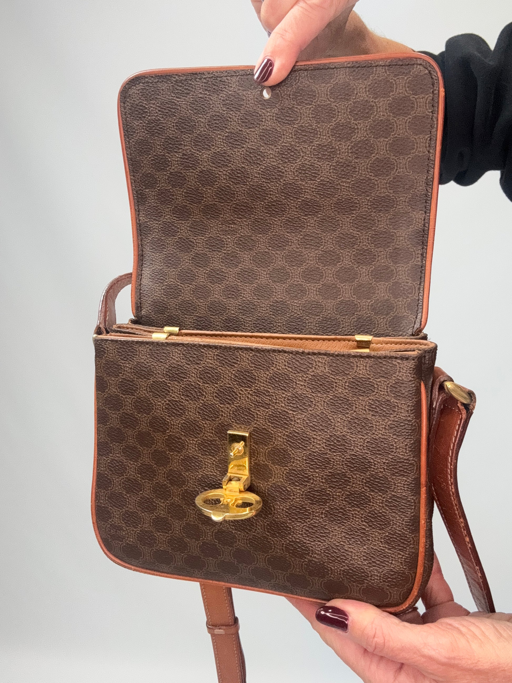The perfect classic Celine vintage style, features an adjustable leather strap to wear shoulder or crossbody. Three compartment for all your essentials. Gold Triomphe closure on front.