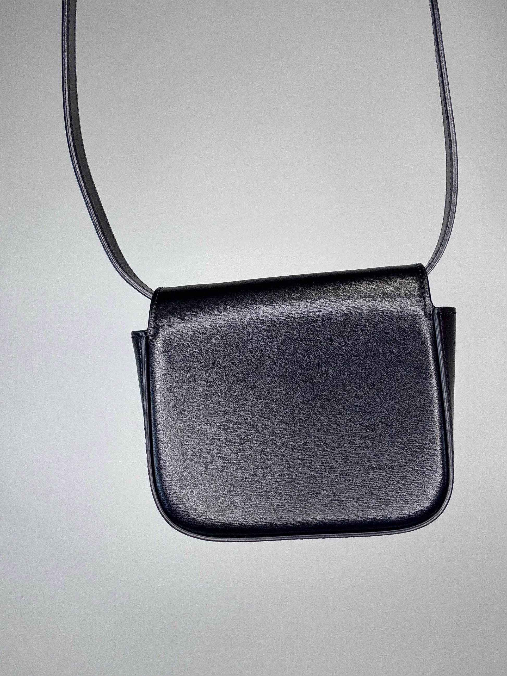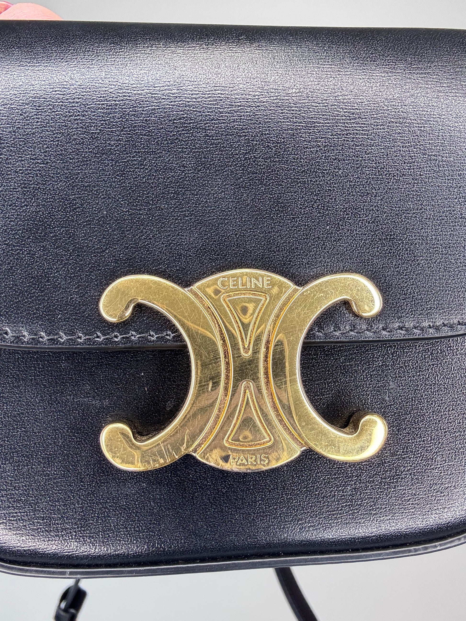 This chic preowned Celine Shiny Calfskin Mini Claude shoulder bag is crafted of calfskin leather in black. The bag features an adjustable leather shoulder strap with gold hardware and Celine's signature gold triomphe press lock on the crossover flap. The flap opens to a leather interior with a patch pocket. The strap is also removable adding to the versatility of this beautiful handbag.