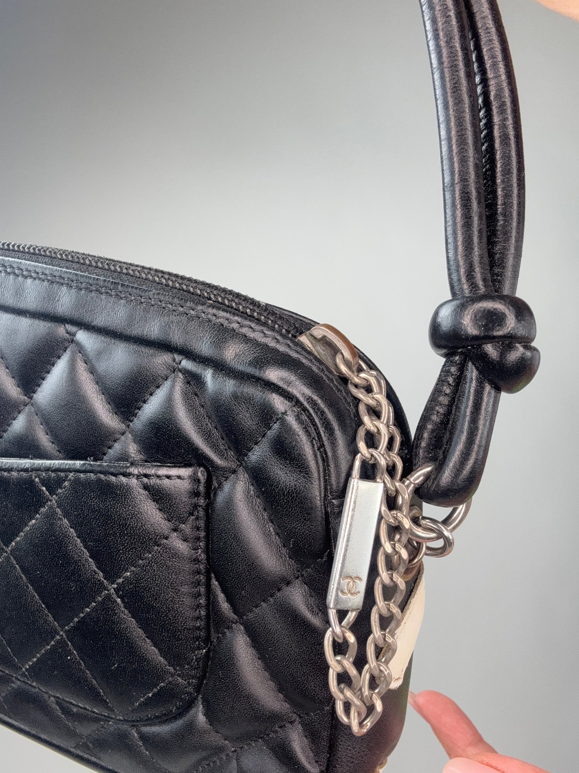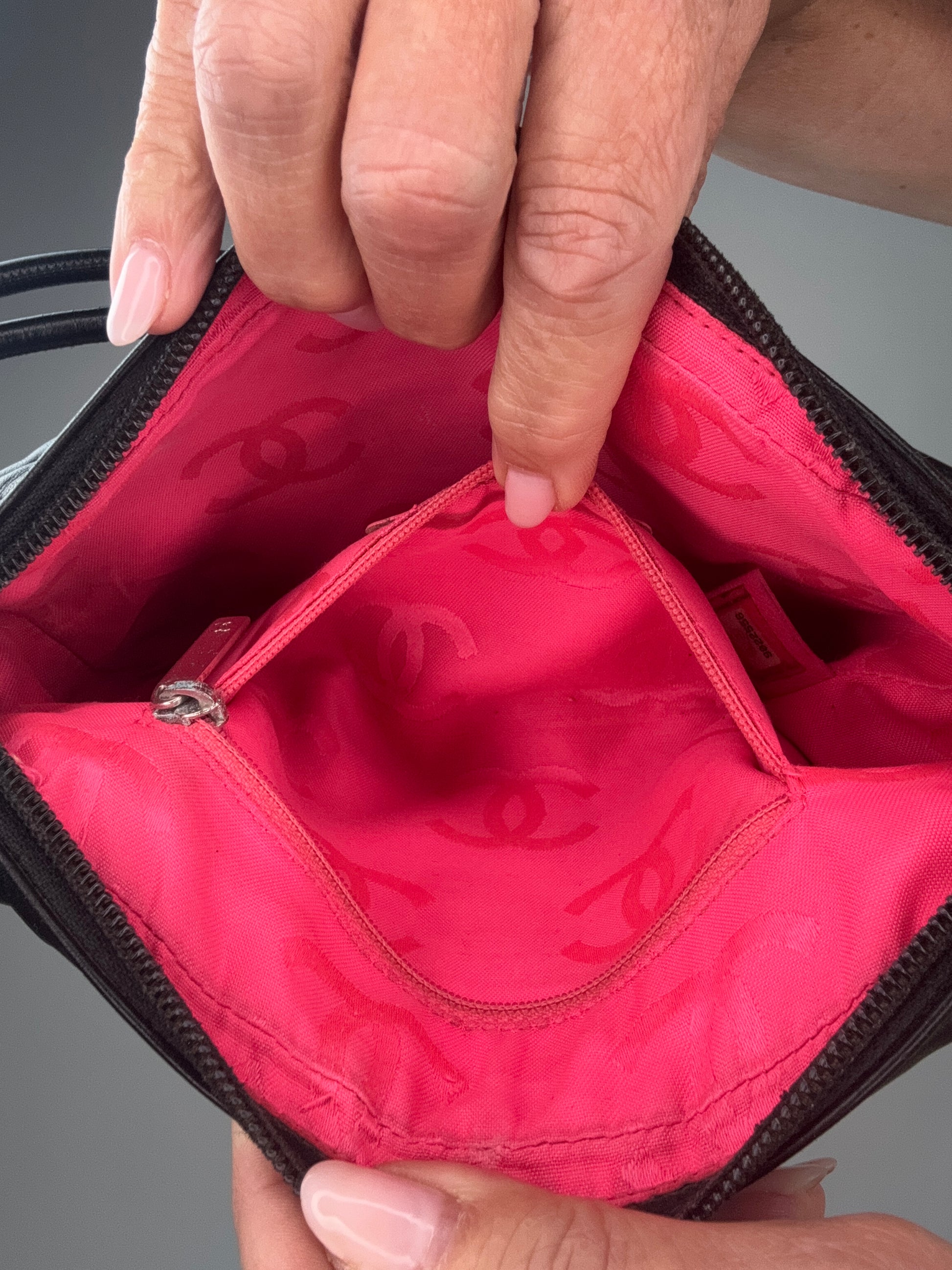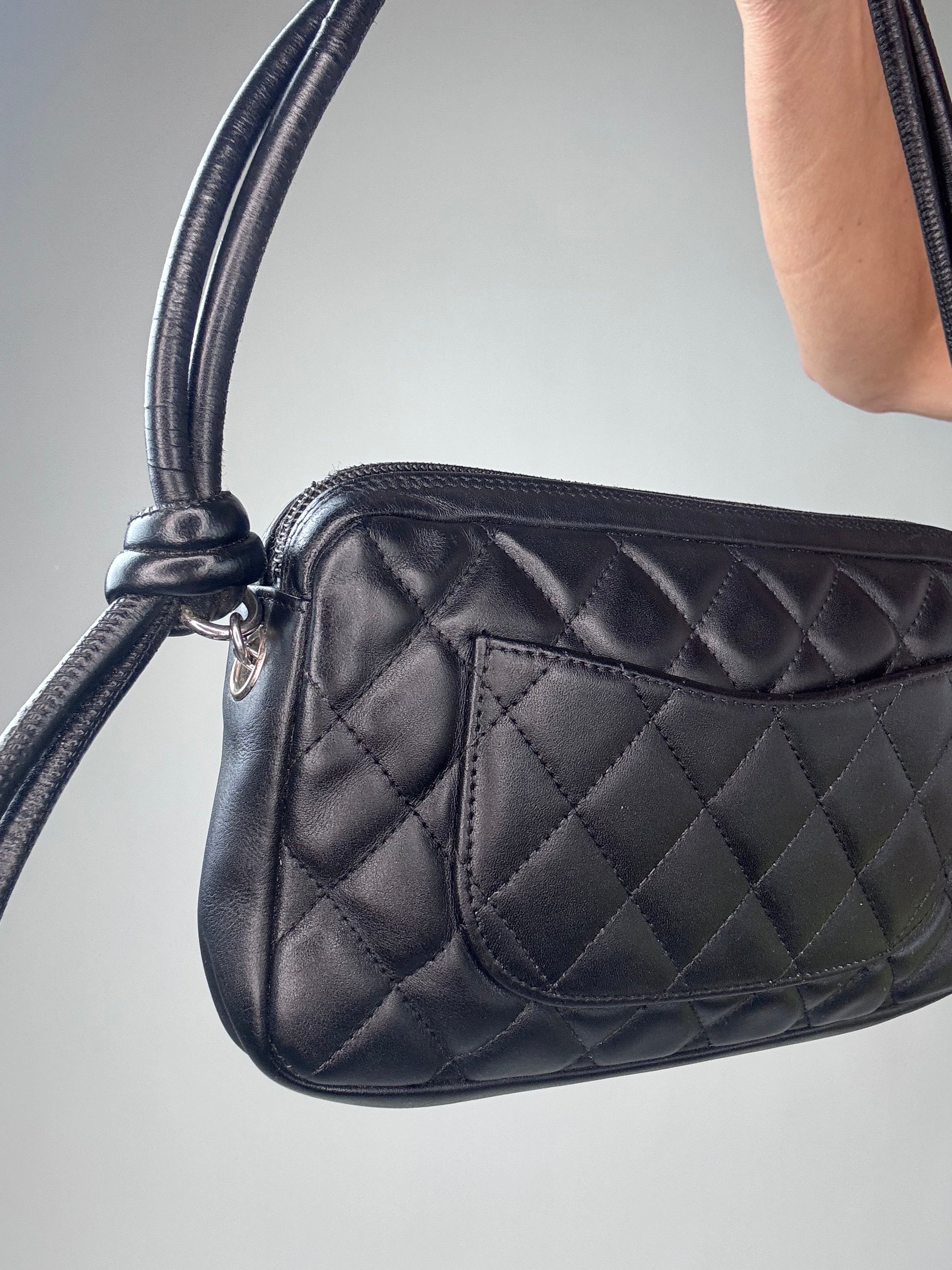 This preowned Chanel Calfskin Quilted Cambon Pochette shoulder bag is designed with calfskin diamond-quilted leather in black. Features a signature white leatherr Chanel CC logo patch and rolled leather straps. The top zipper opens to a bright pink Chanel logo fabric interior with a zipper pocket. This handbag also features a pocket at the back og the handbag. Silver hardware adds the right touch making this a statement handbag.