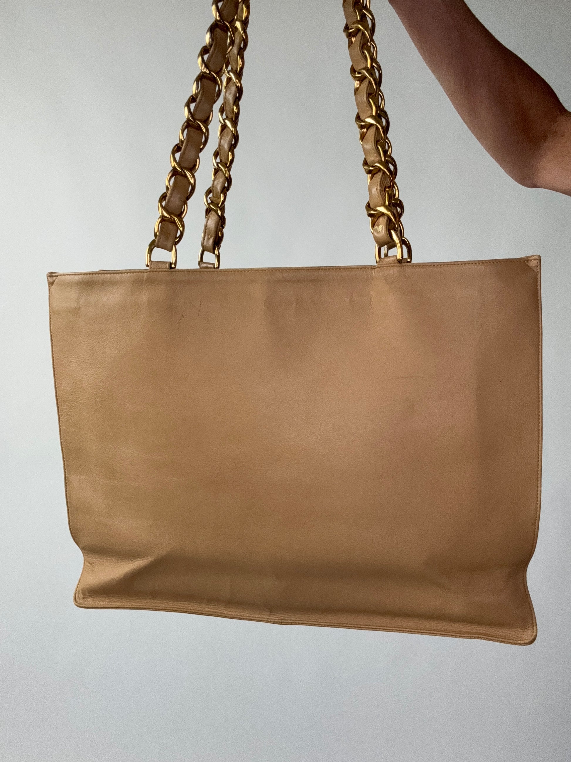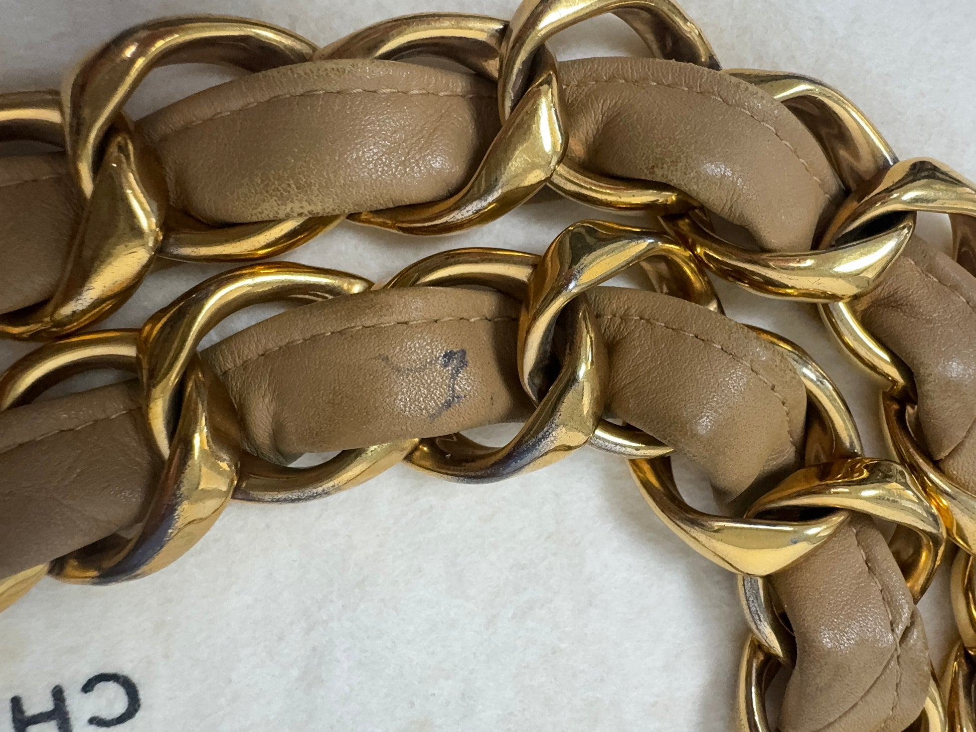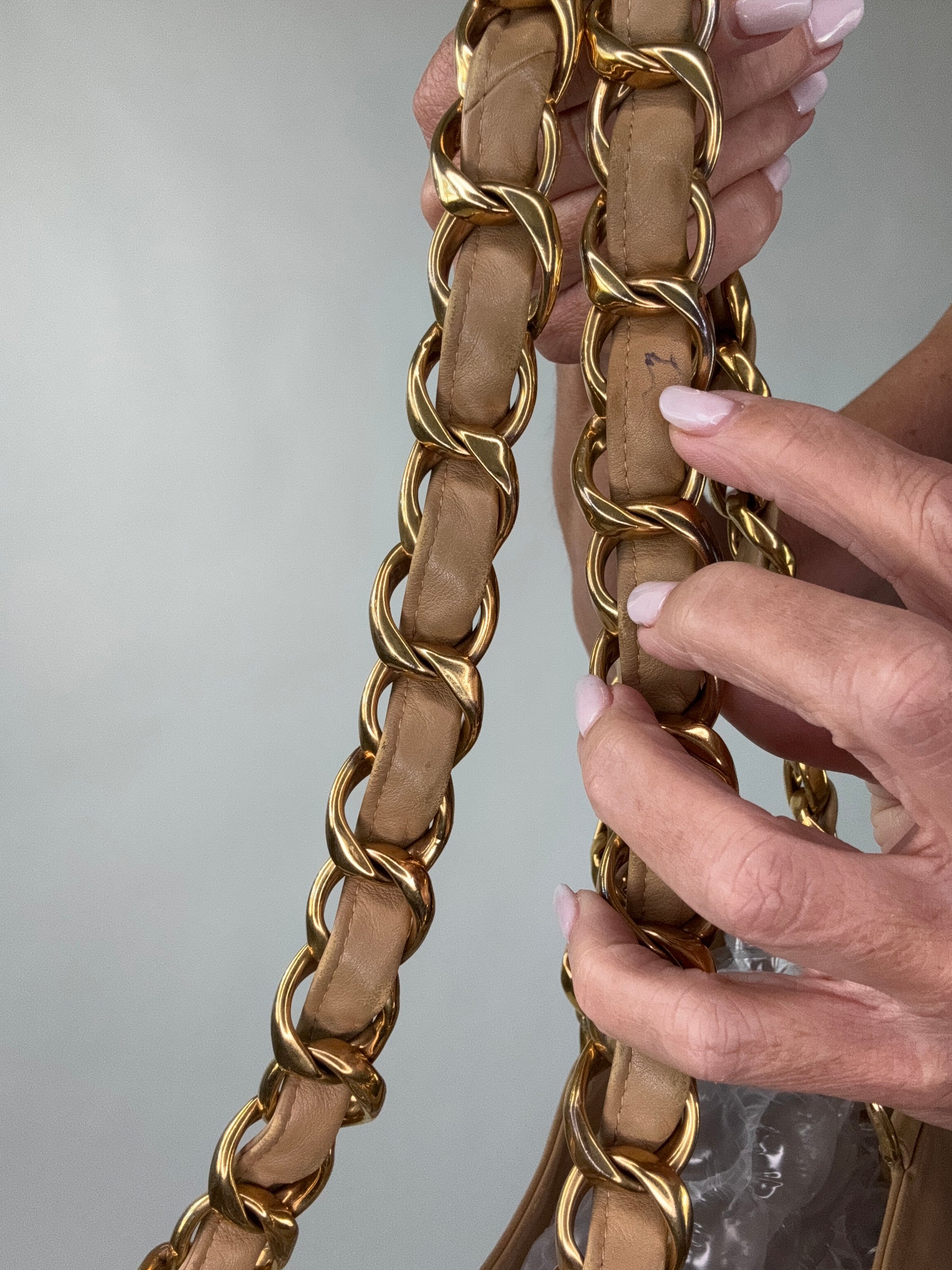 This vintage preowned Chanel Deca Coco Chain Tote designed in a beautiful tan calf leather with a chunky leather and gold chain strap which adds the perfect touch of elegance to any outfit. Absolutely perfect for everyday and travel.