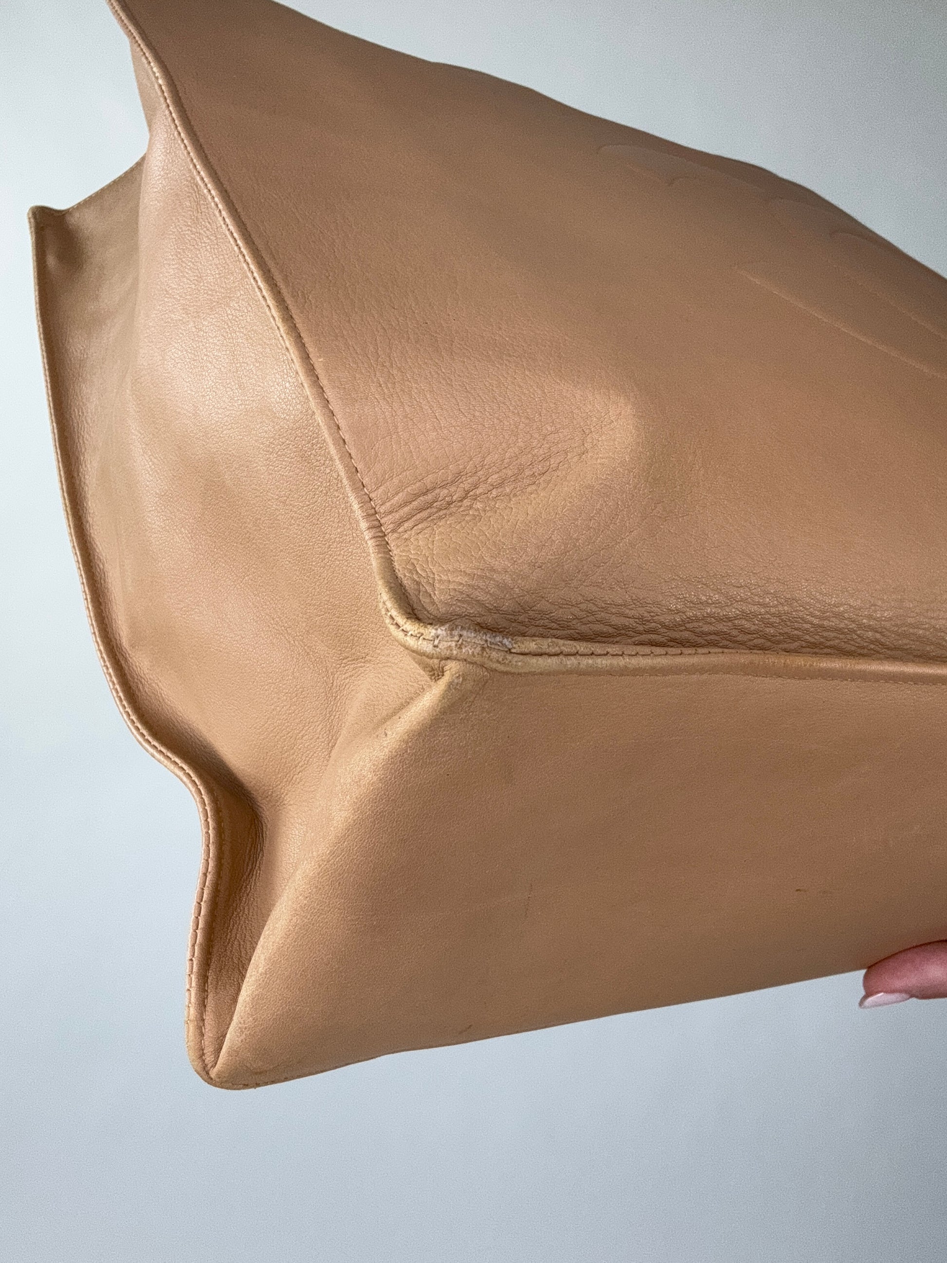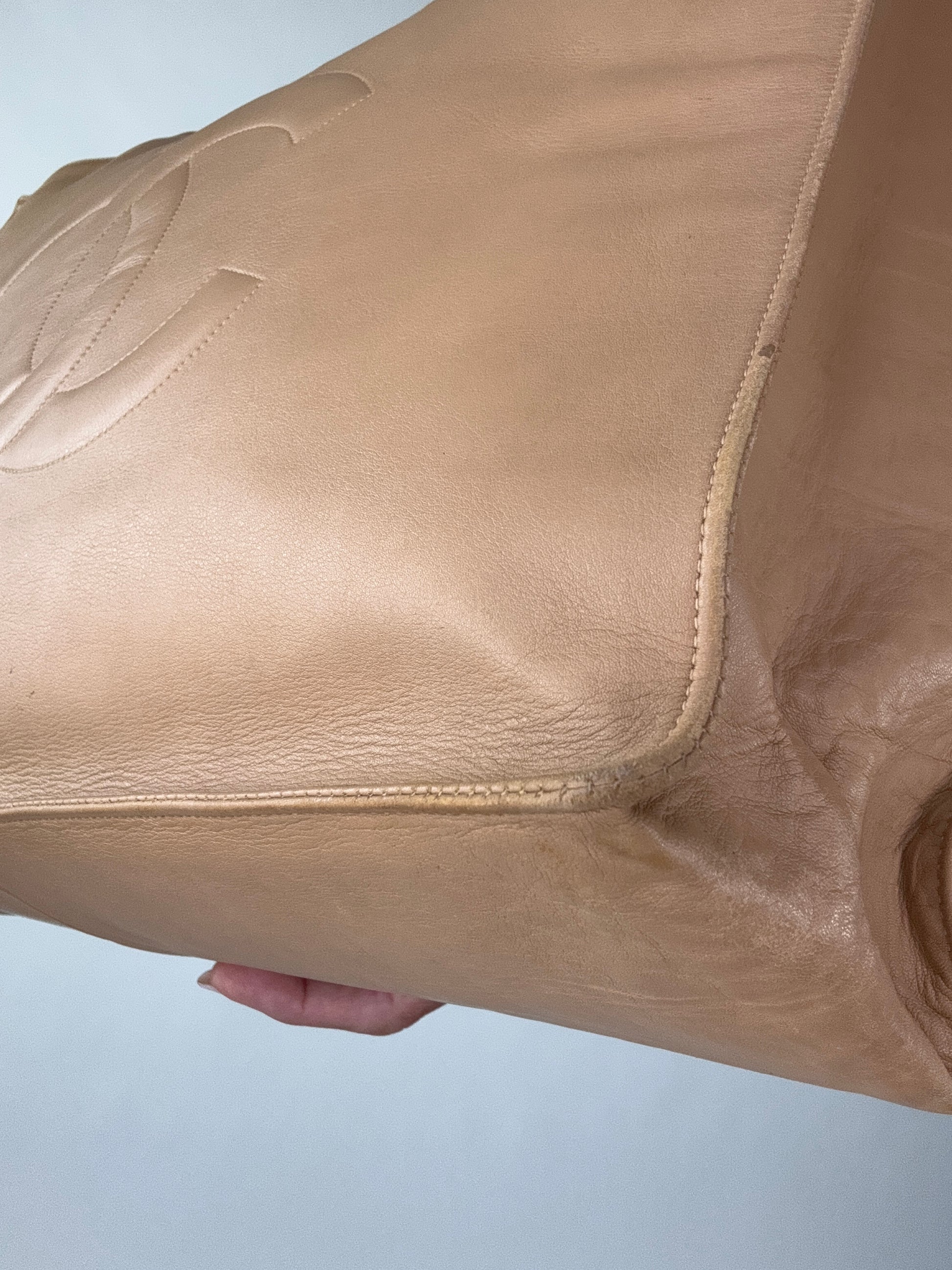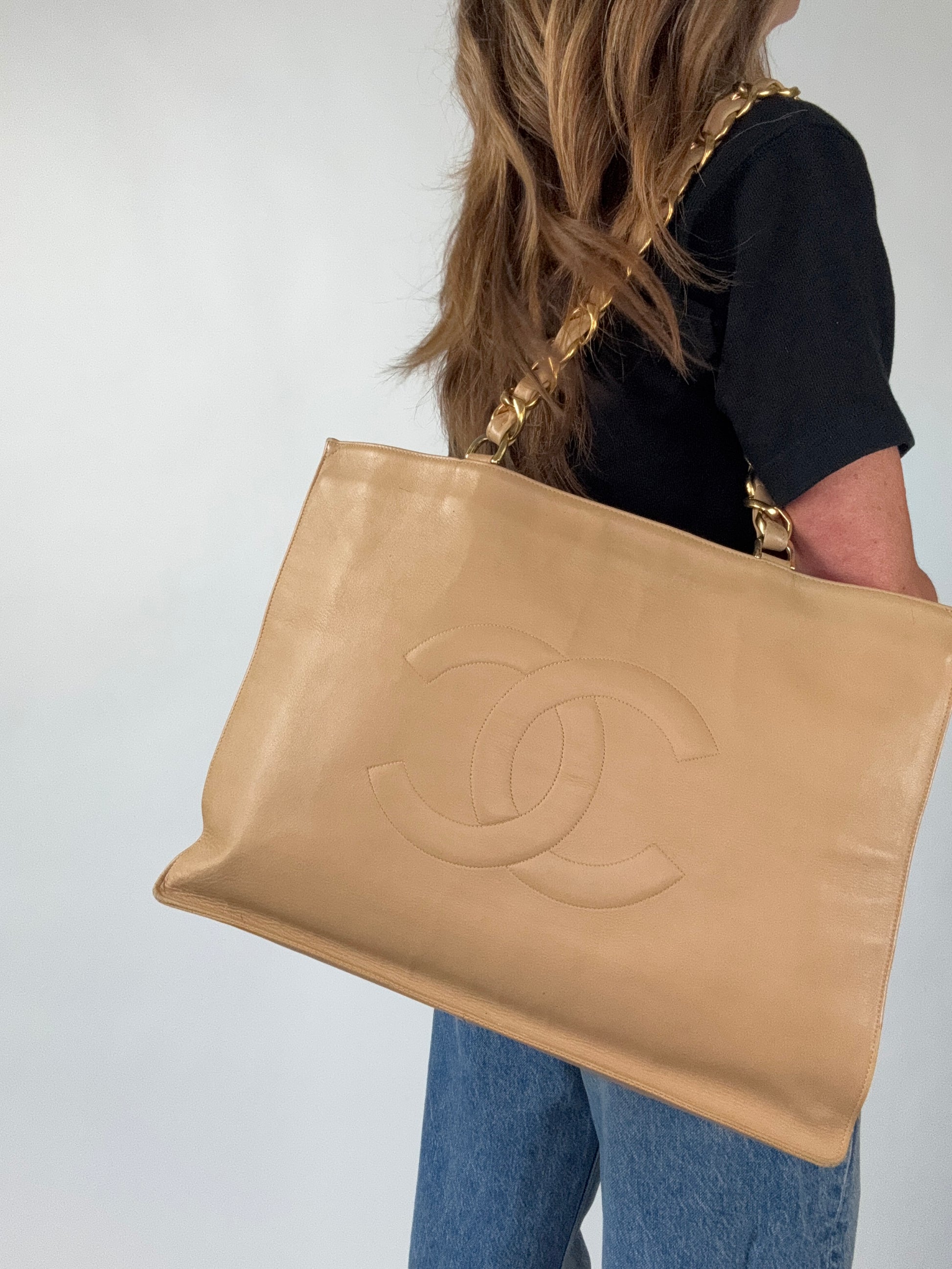 This vintage preowned Chanel Deca Coco Chain Tote designed in a beautiful tan calf leather with a chunky leather and gold chain strap which adds the perfect touch of elegance to any outfit. Absolutely perfect for everyday and travel.