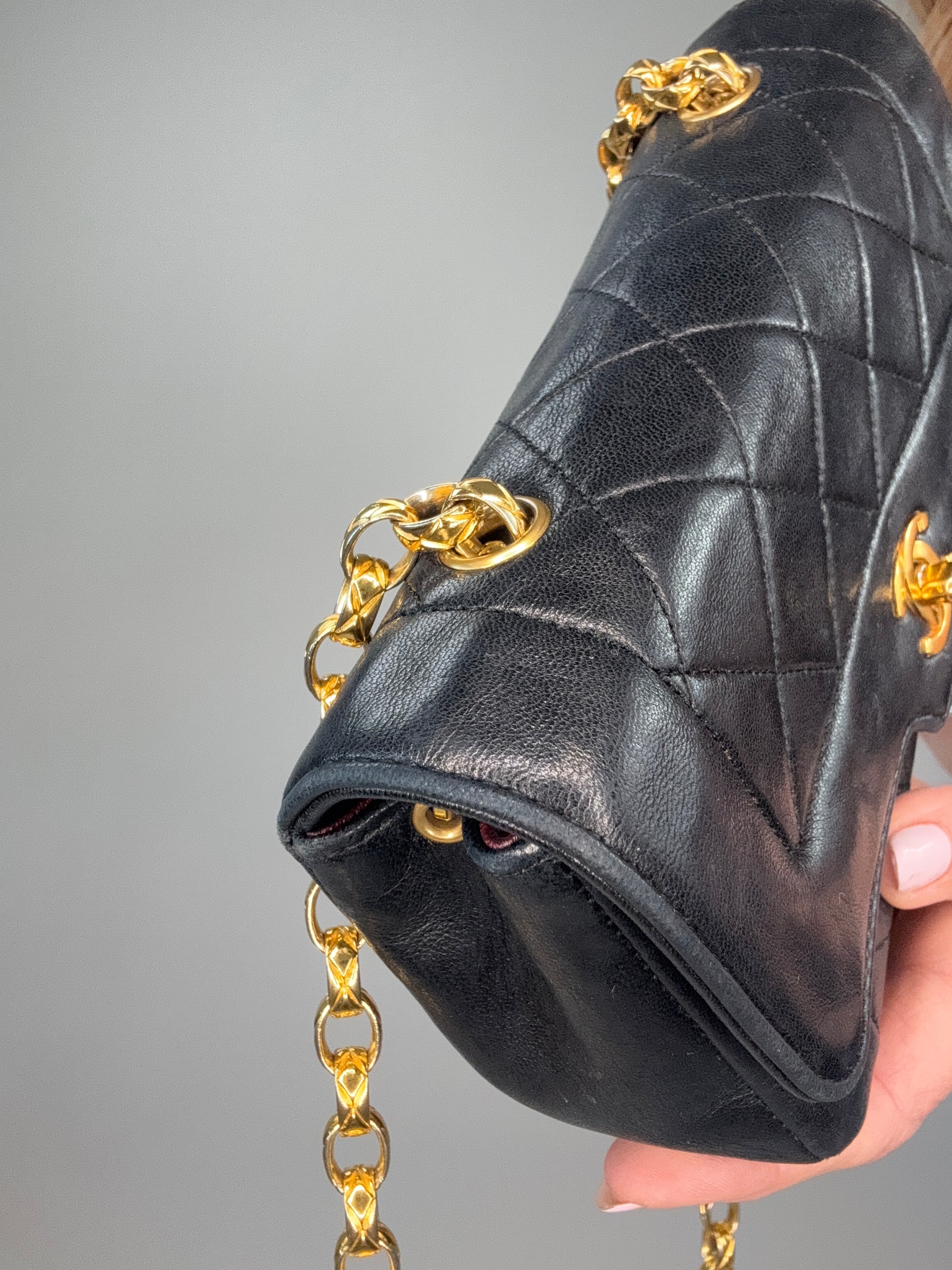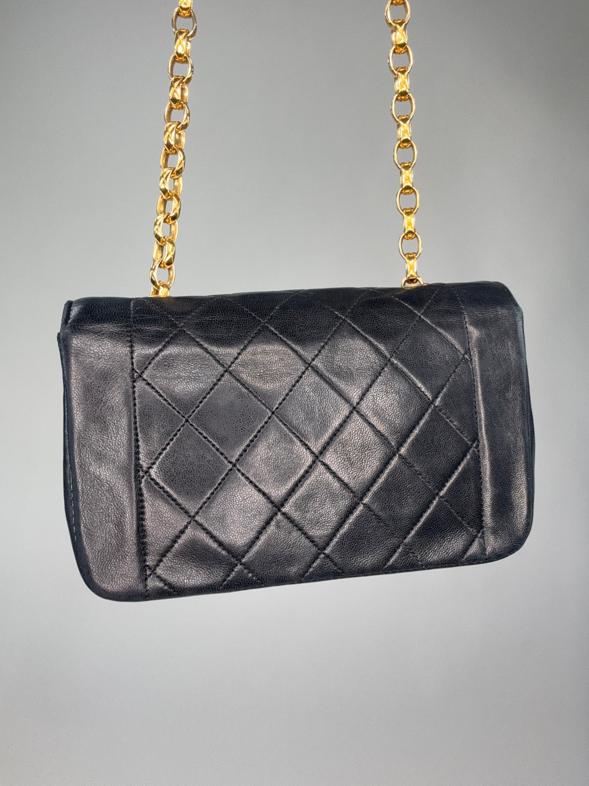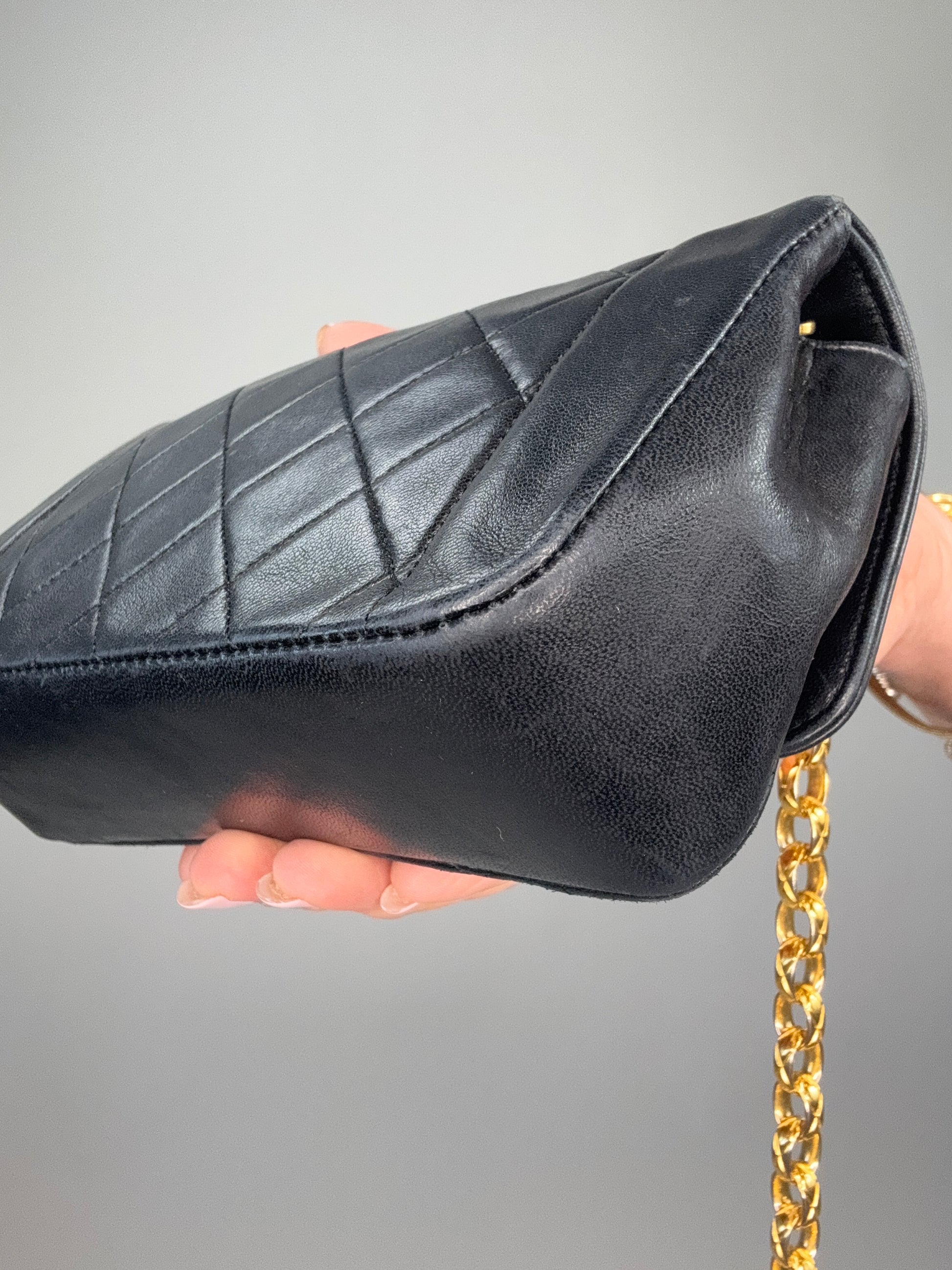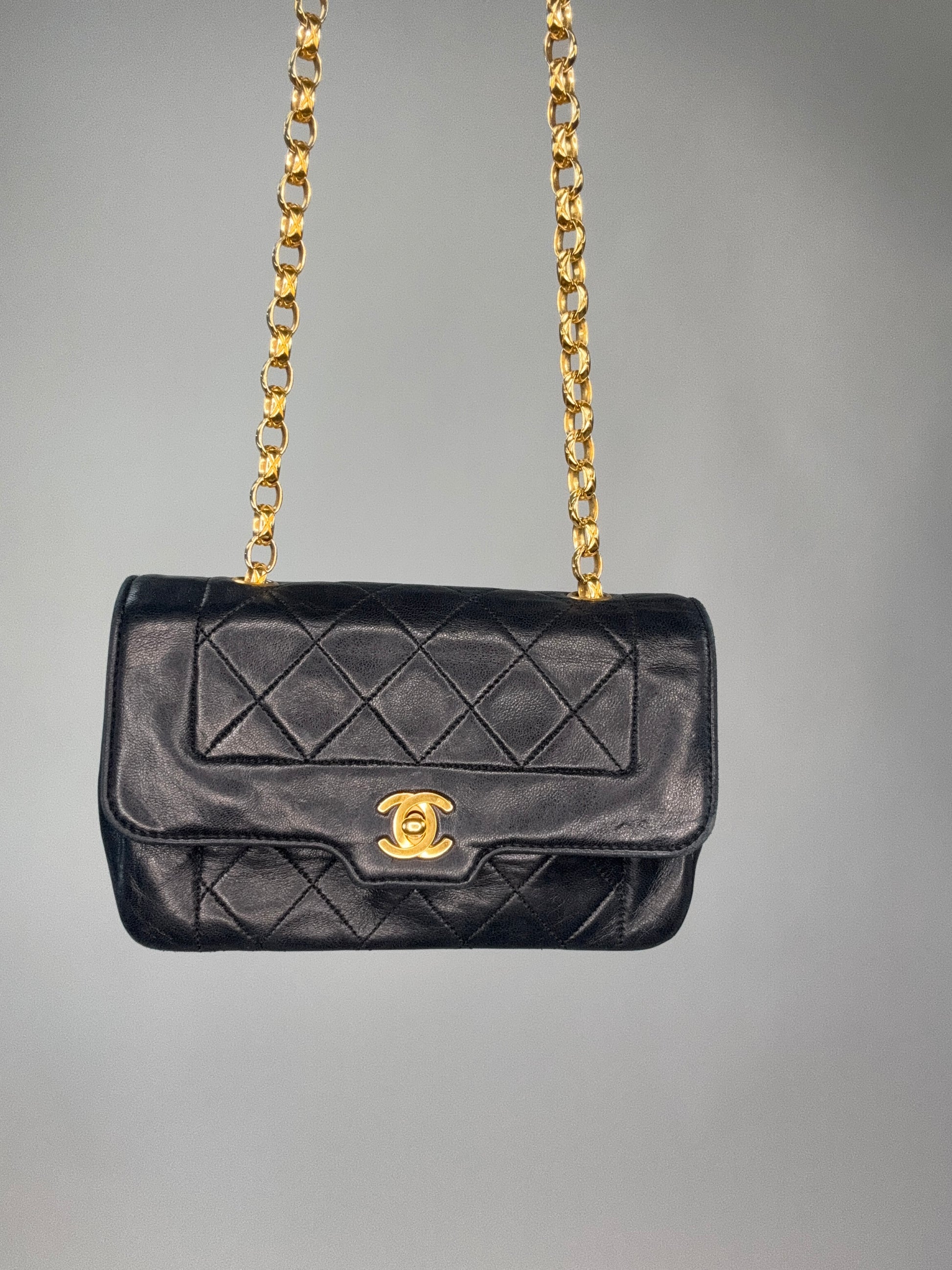 This vintage and rare preowned Chanel Diana Bijoux Chain Small Flap Bag was designed with quilted lambskin leather in black. Featuring gold plated hardware and the CC logo, the leather and gold chain also adjusts for versatile wear. The single flap opens to a leather burgundy interior with an interior zipper pocket. This classic handbag can be worn in several ways, making it a perfect addition to your collection.