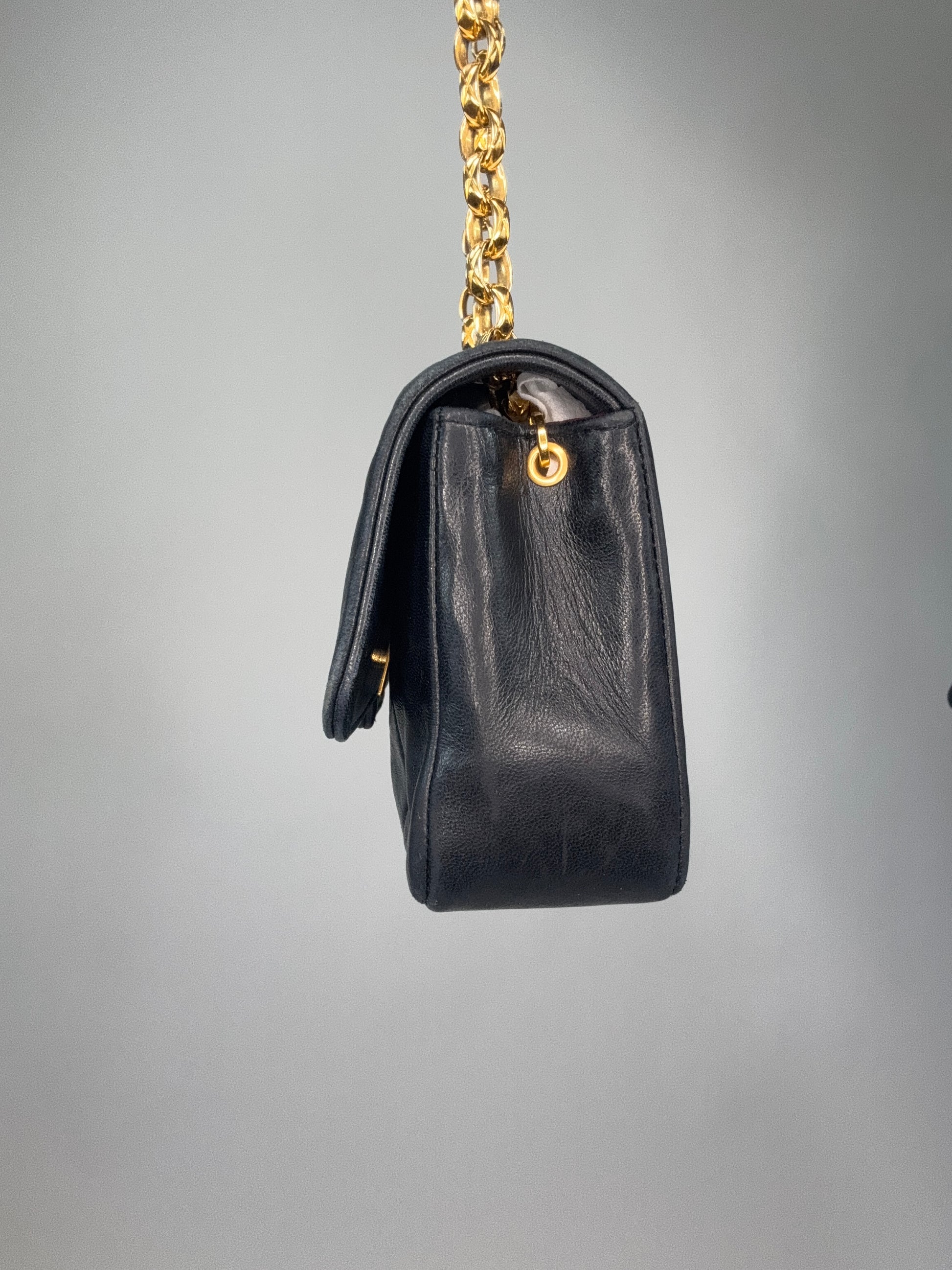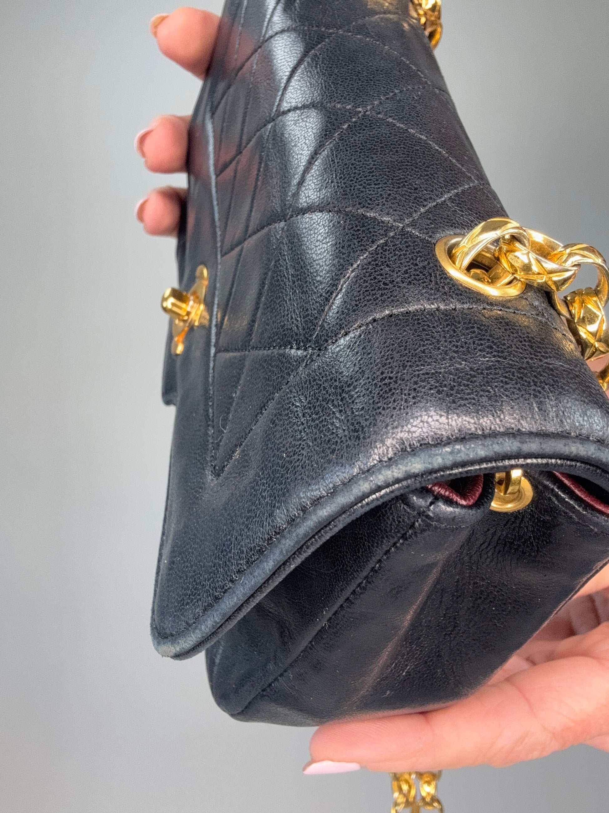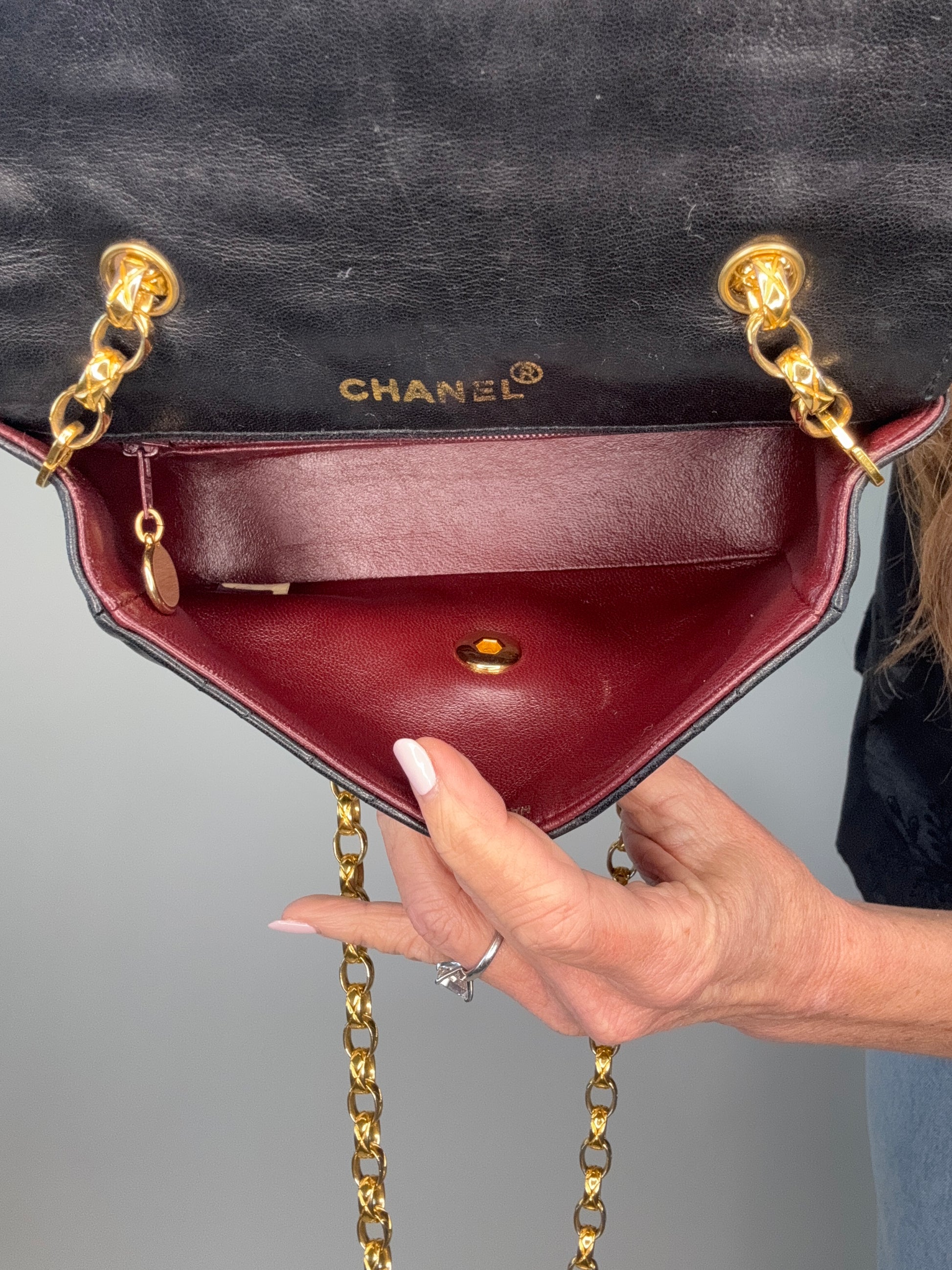 This vintage and rare preowned Chanel Diana Bijoux Chain Small Flap Bag was designed with quilted lambskin leather in black. Featuring gold plated hardware and the CC logo, the leather and gold chain also adjusts for versatile wear. The single flap opens to a leather burgundy interior with an interior zipper pocket. This classic handbag can be worn in several ways, making it a perfect addition to your collection.