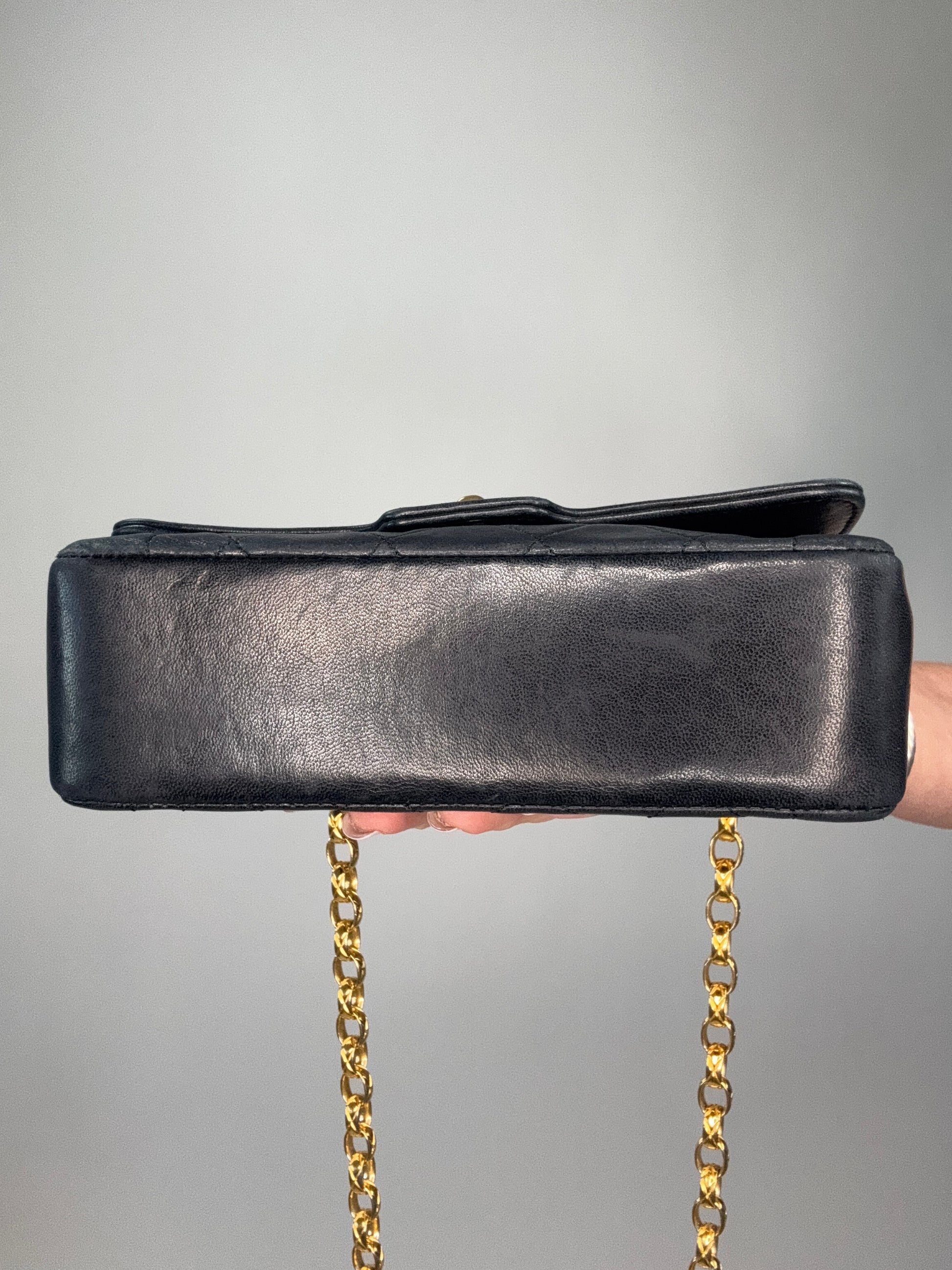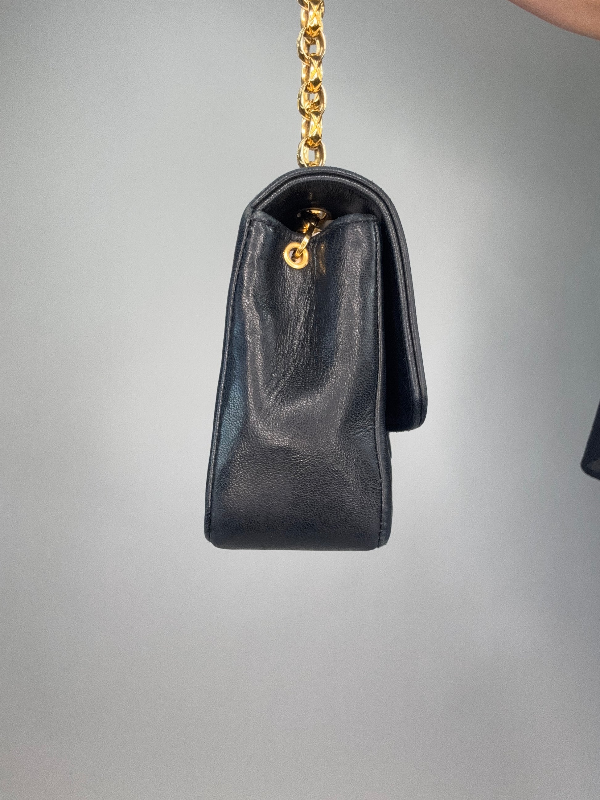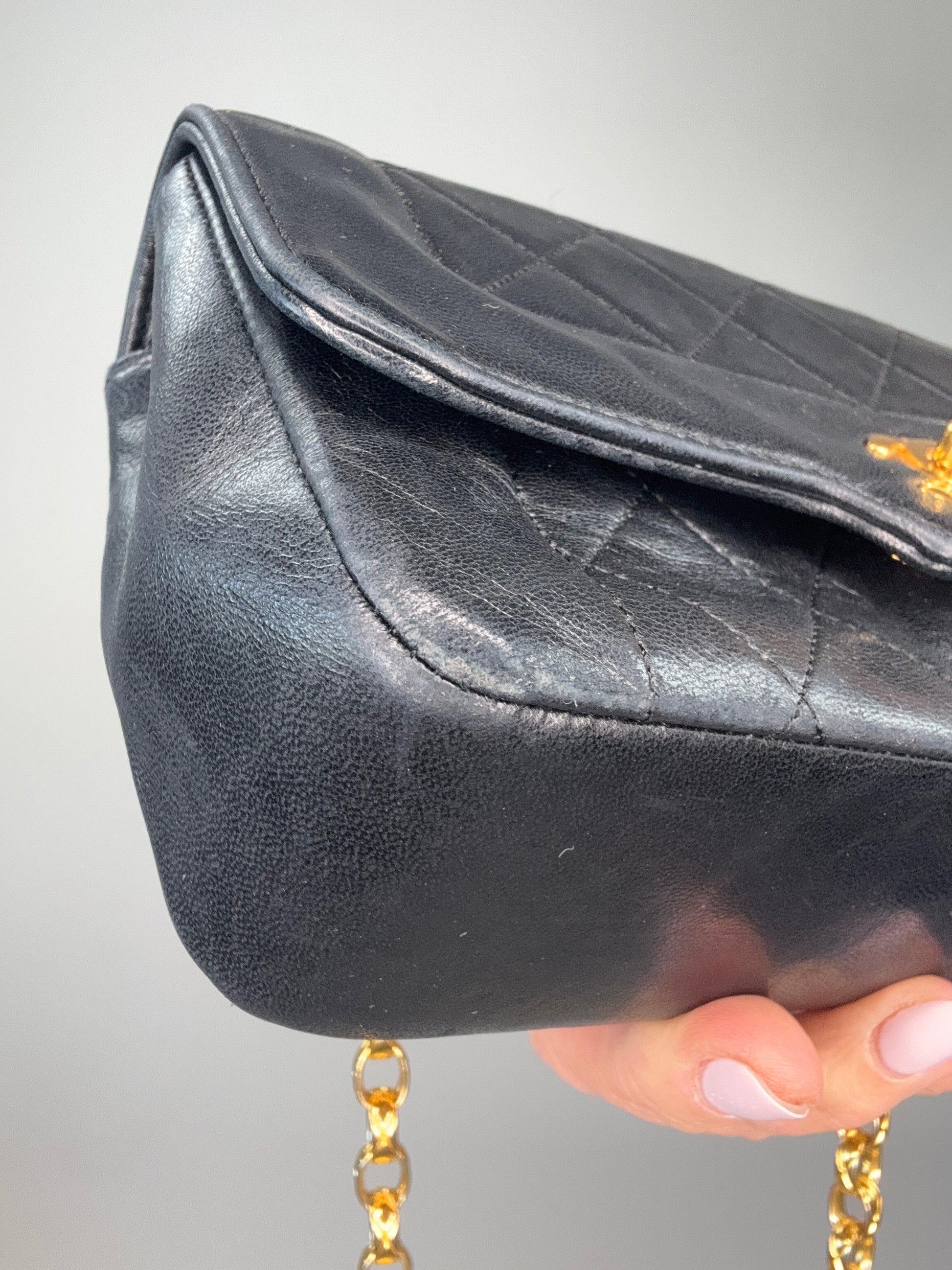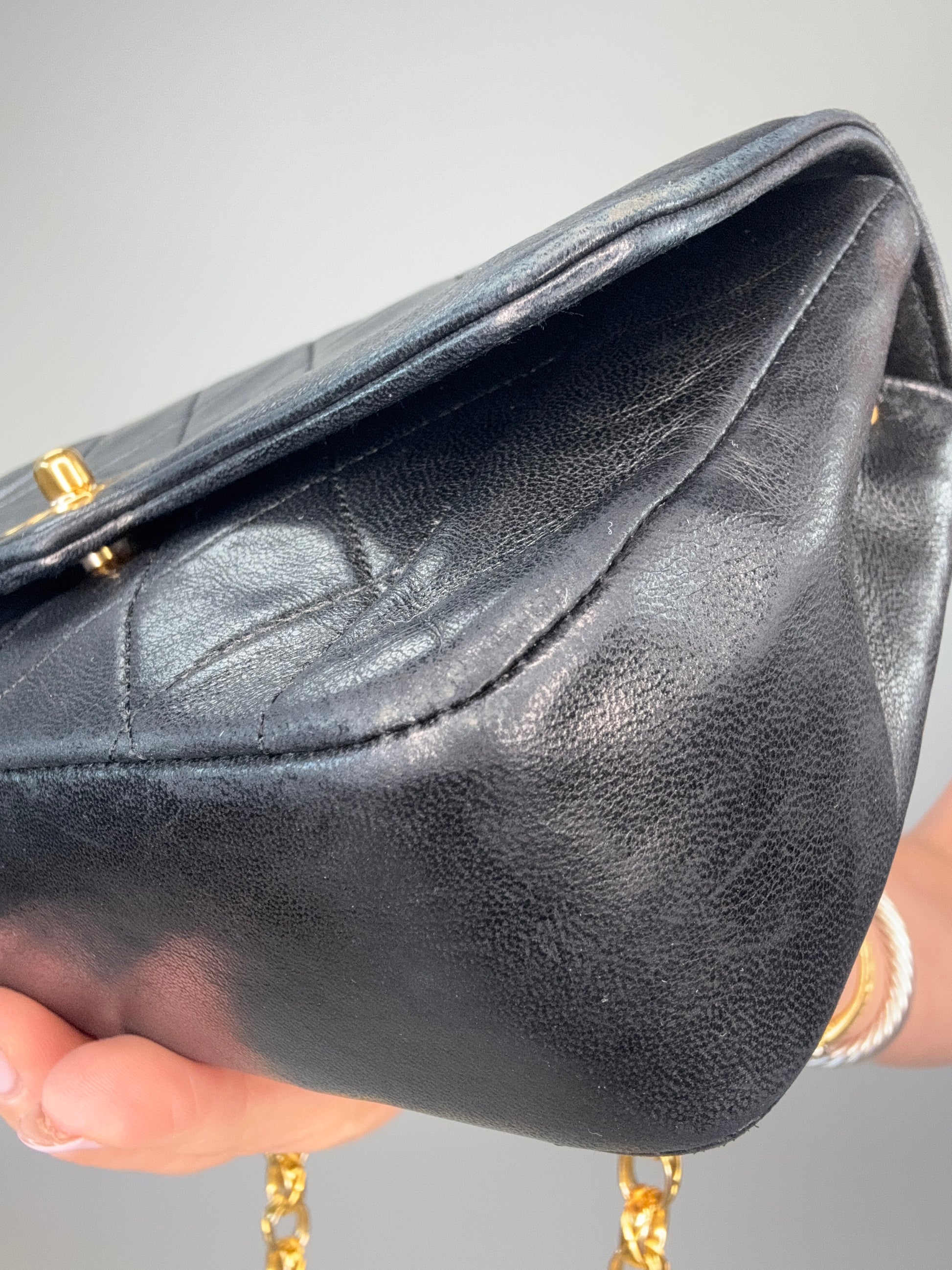 This vintage and rare preowned Chanel Diana Bijoux Chain Small Flap Bag was designed with quilted lambskin leather in black. Featuring gold plated hardware and the CC logo, the leather and gold chain also adjusts for versatile wear. The single flap opens to a leather burgundy interior with an interior zipper pocket. This classic handbag can be worn in several ways, making it a perfect addition to your collection.