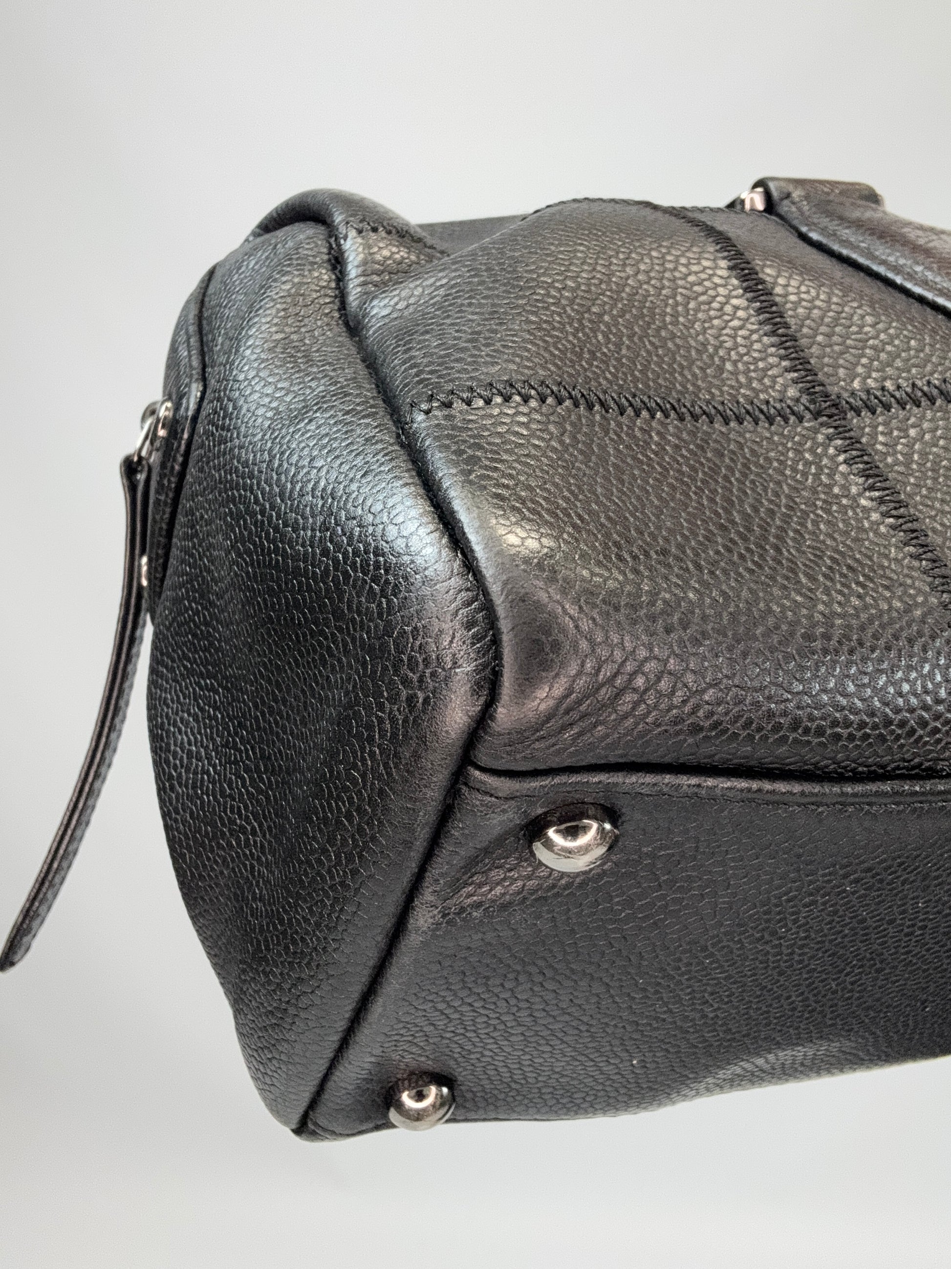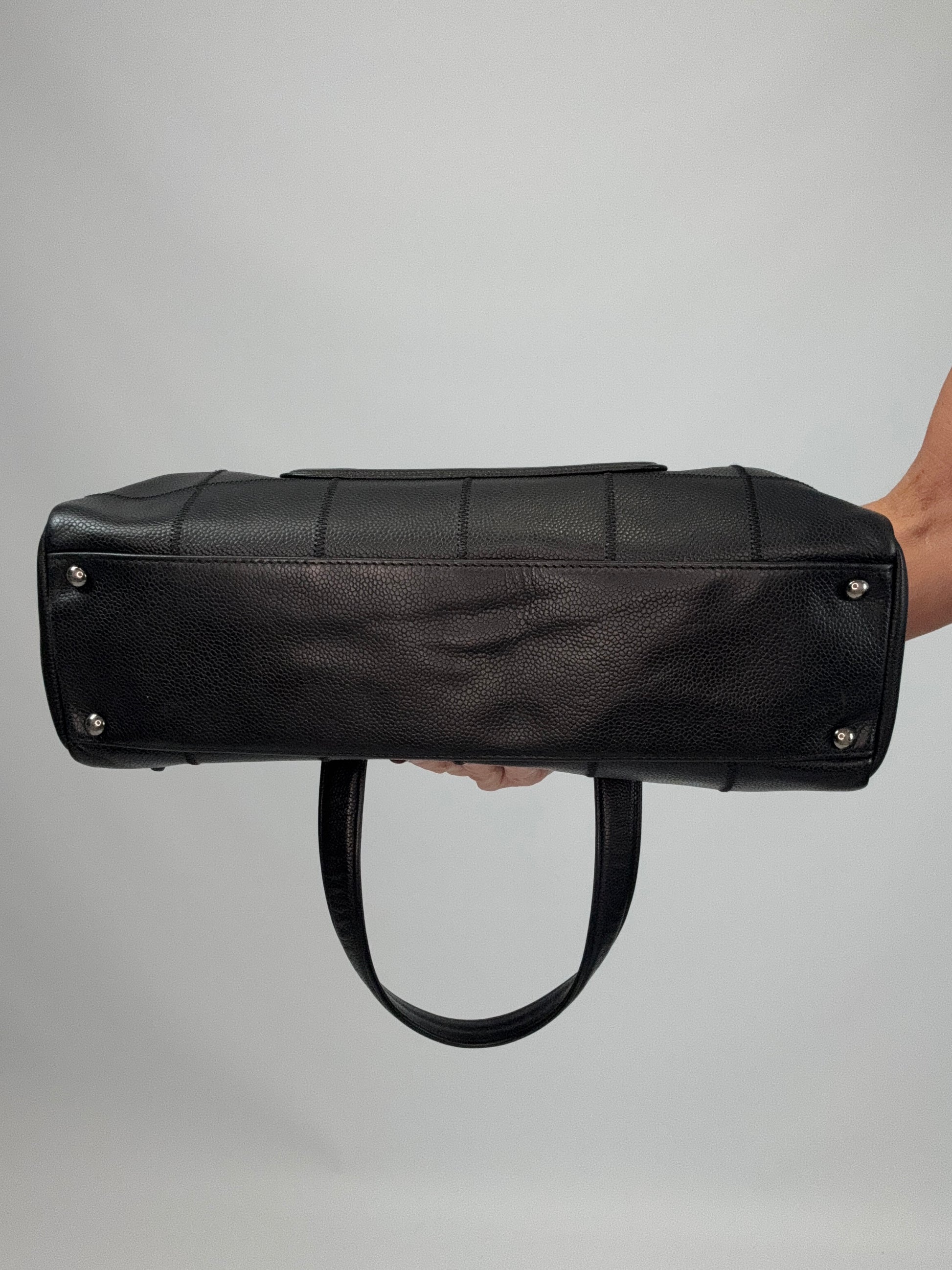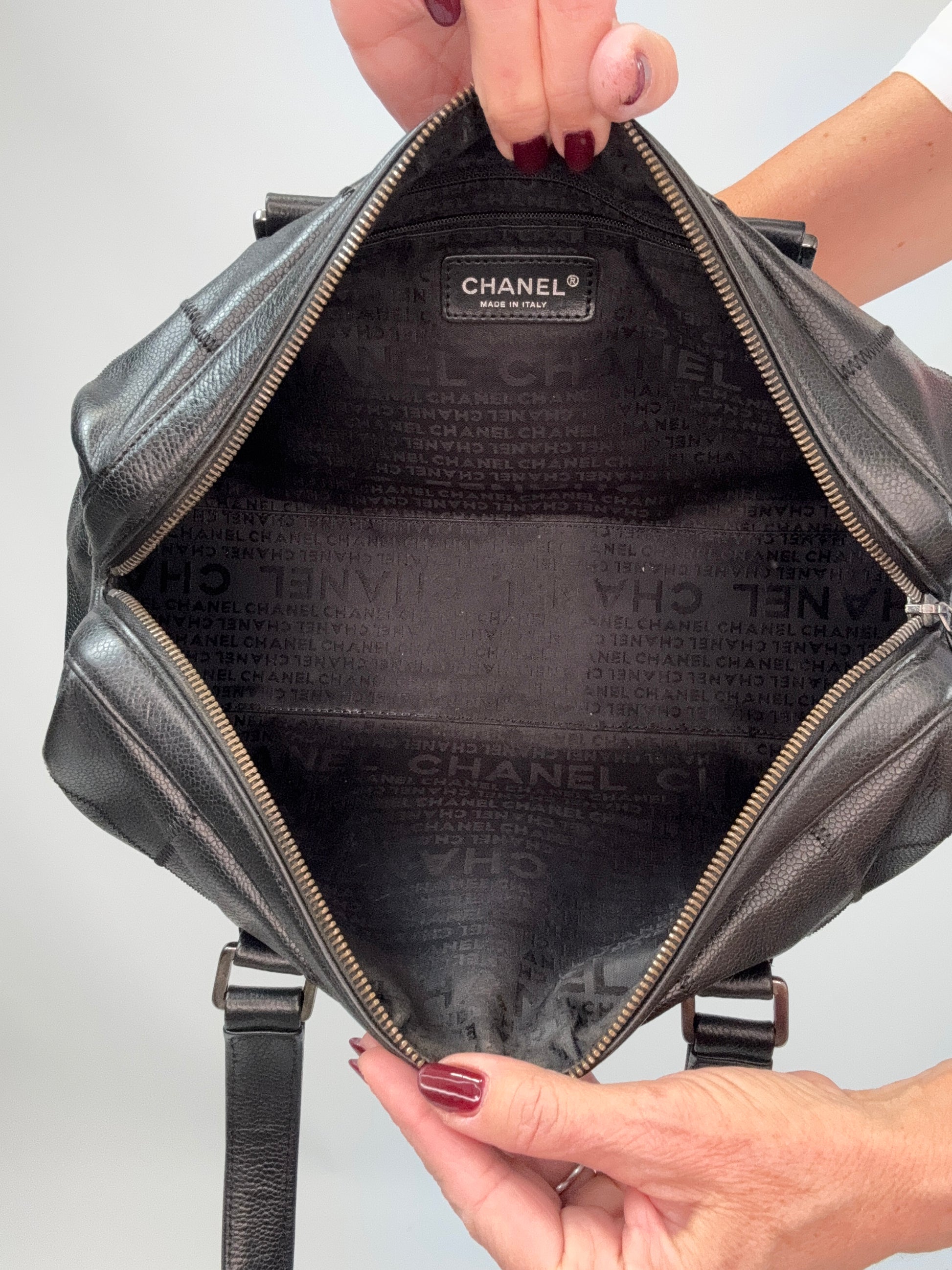Cool and classic, this east to west Boston bag features black caviar leather, Chanel logo with silver hardware. Roomy enough for everyday and can be worn with any look. Fits on the shoulder or wear as tote bag!
