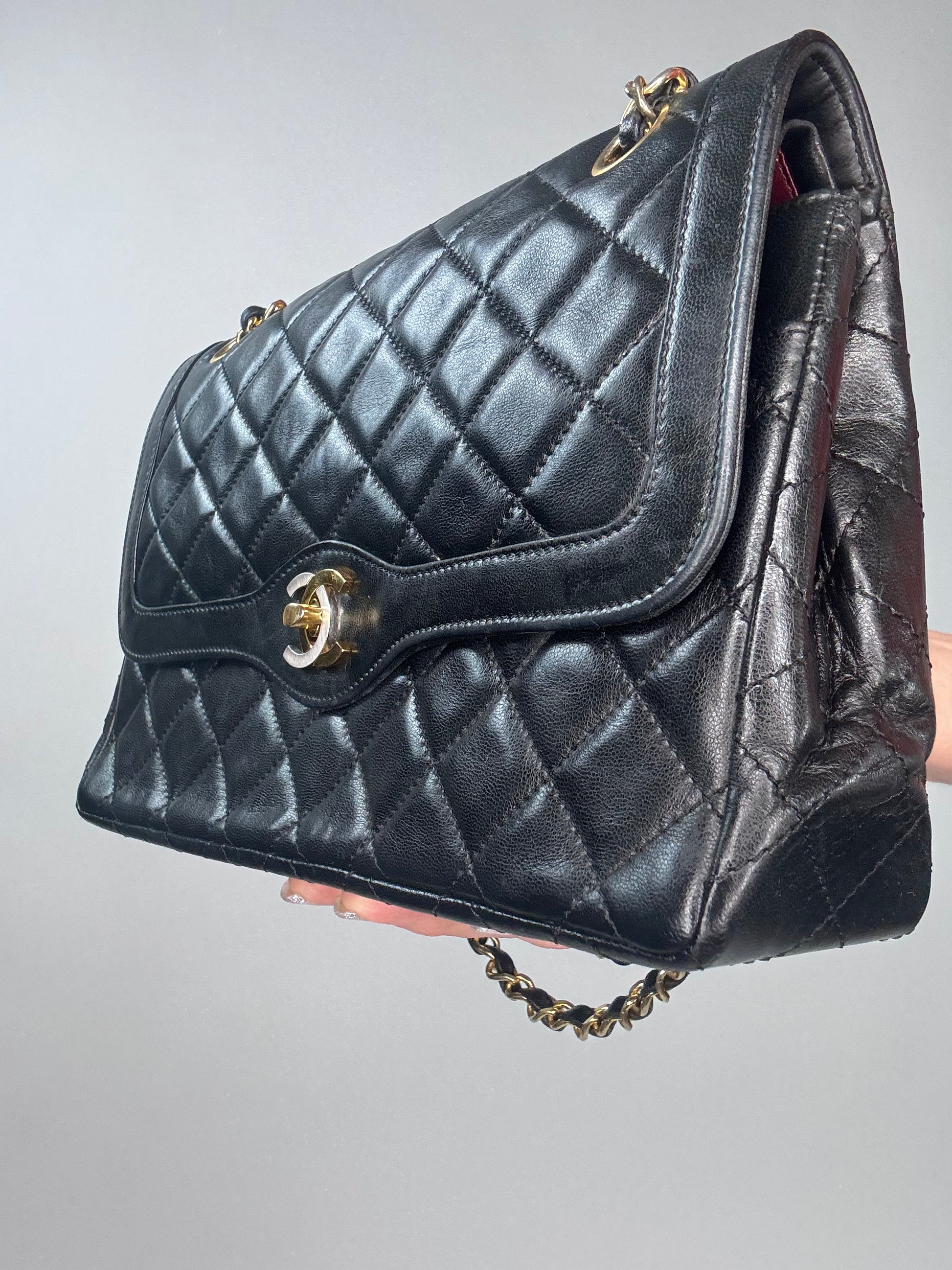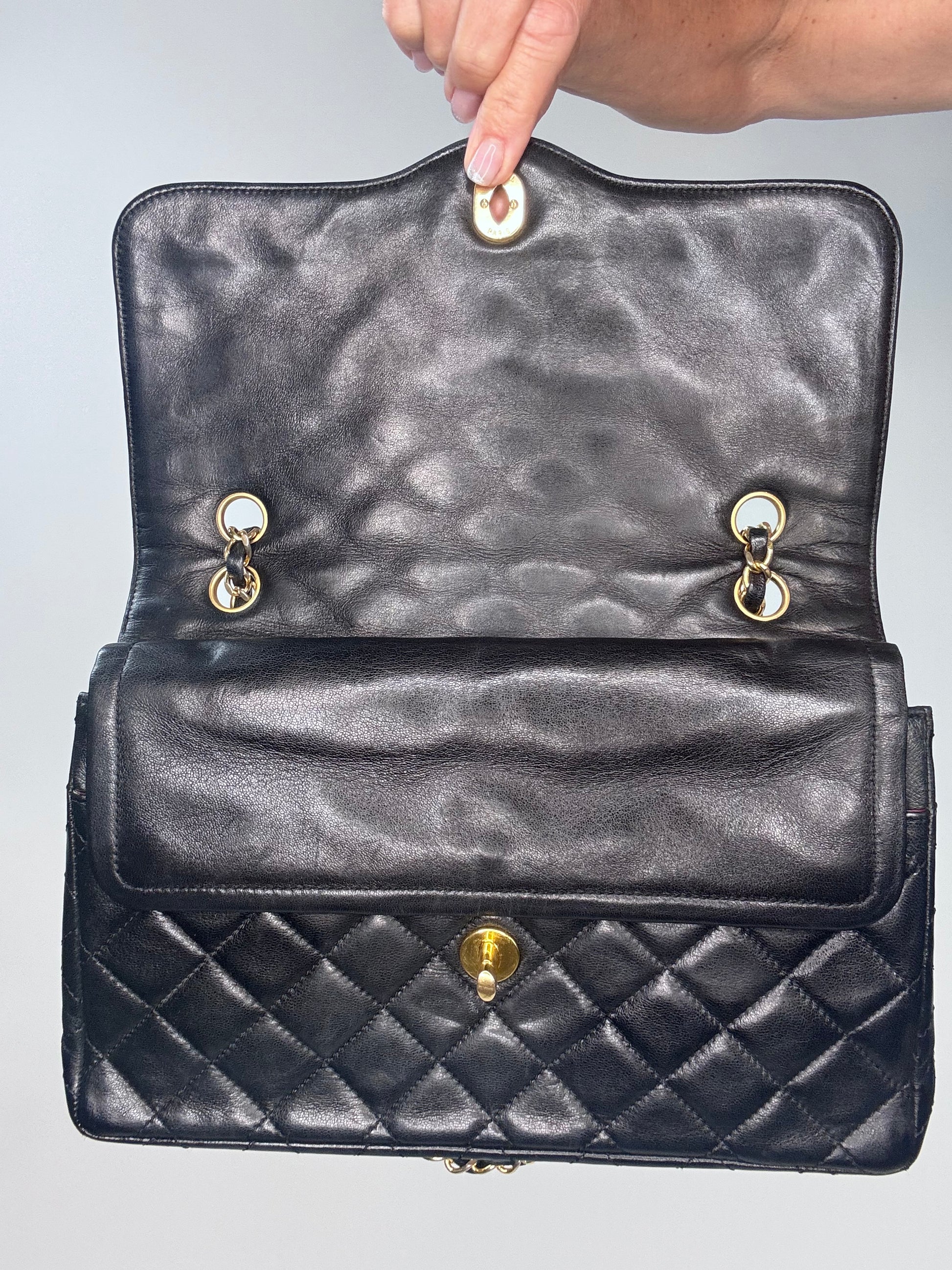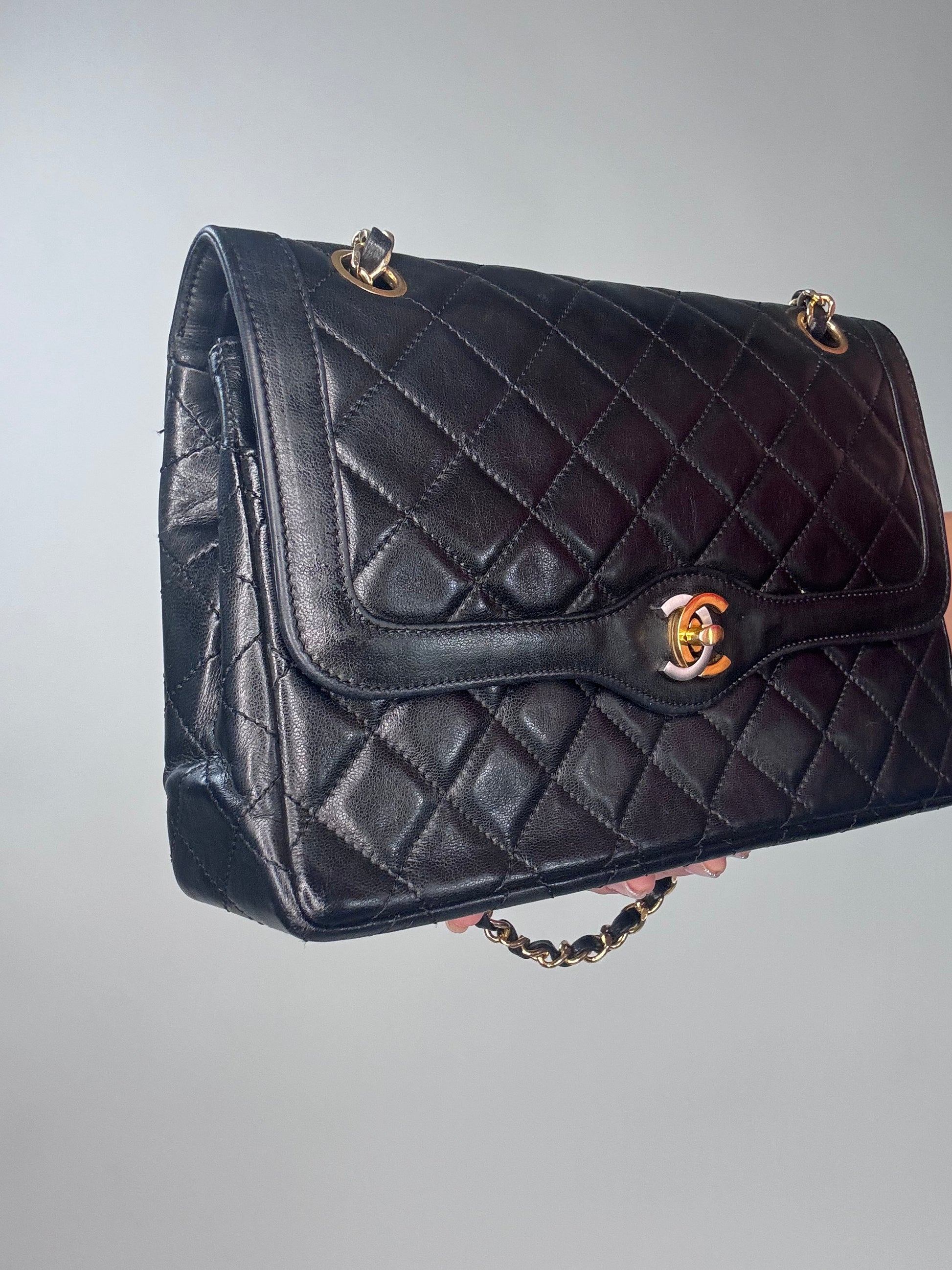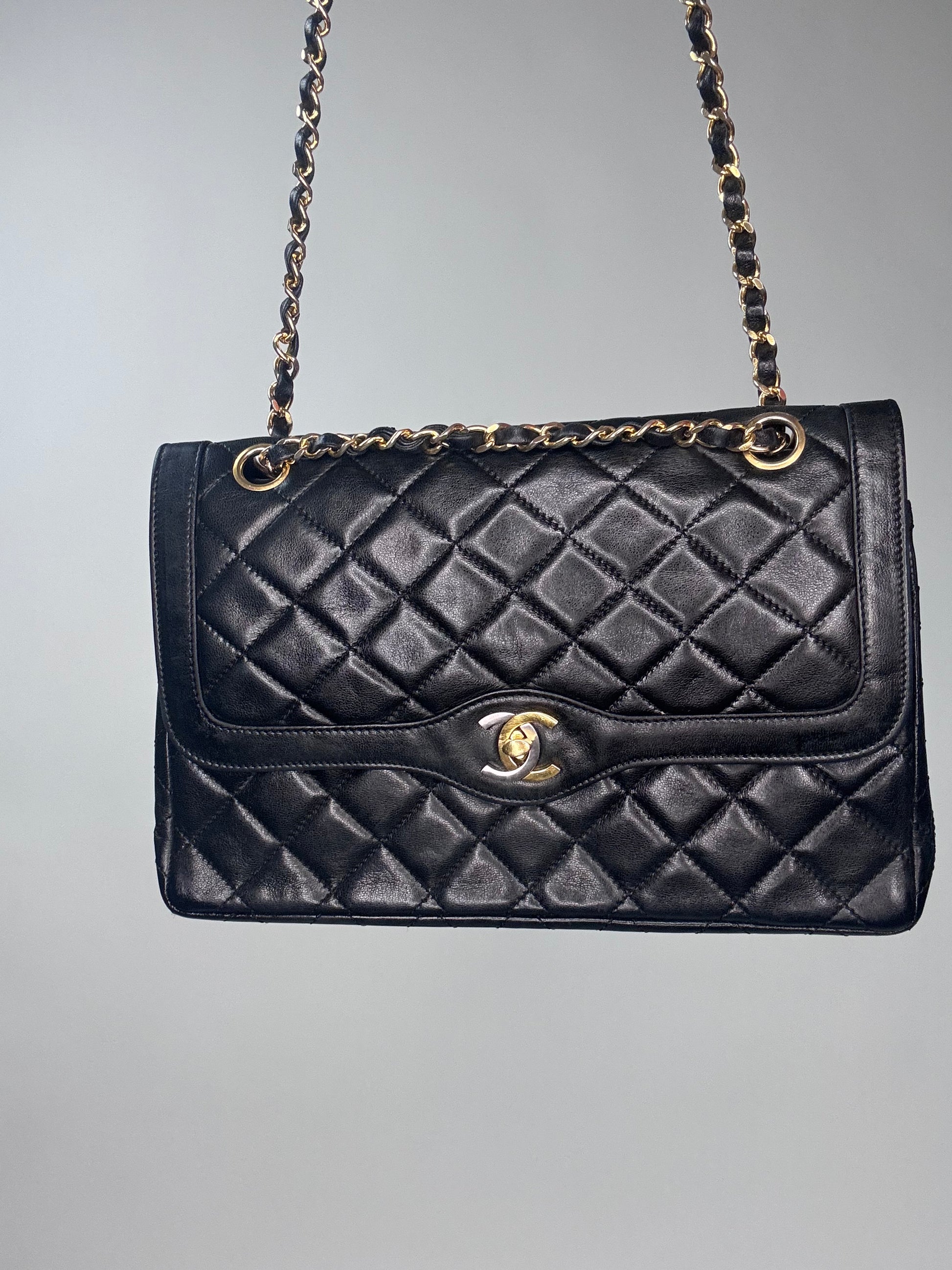 This vintage preowned Chanel Quilted Lambskin Paris Limited Edition Double Flap Bag was introduced in the early 1990's. Crafted in black quilted lambskin, this handbag has the double flap and the burgundy lambskin interior with 3 pockets and one that zips closed. There is an additional quilted pocket on the backside of this handbag. Chanel's classic logo is designed in silver and gold with a turn lock enclosure. The leather and gold chain strap is adjustable to also wear as a crossbody.
