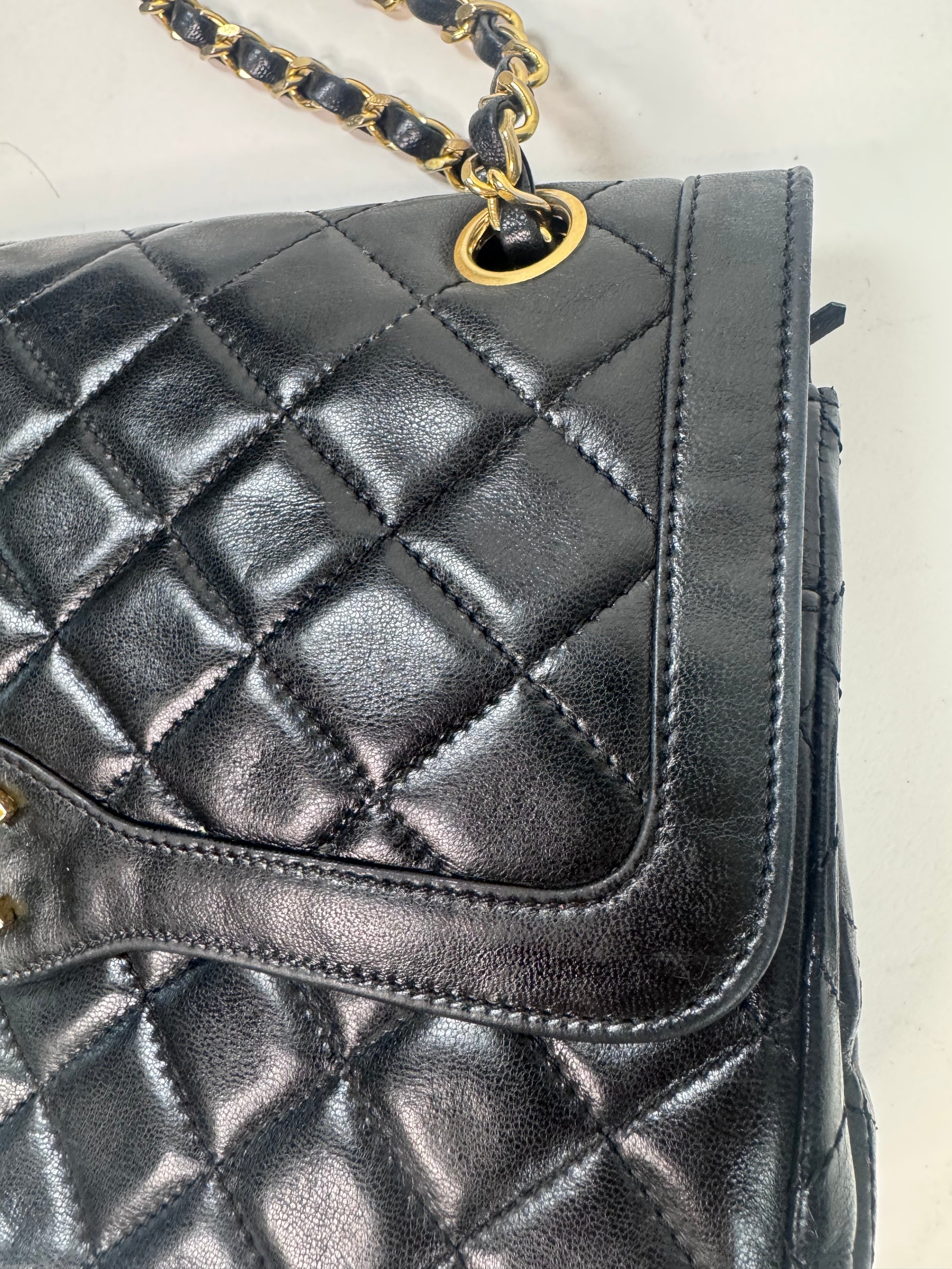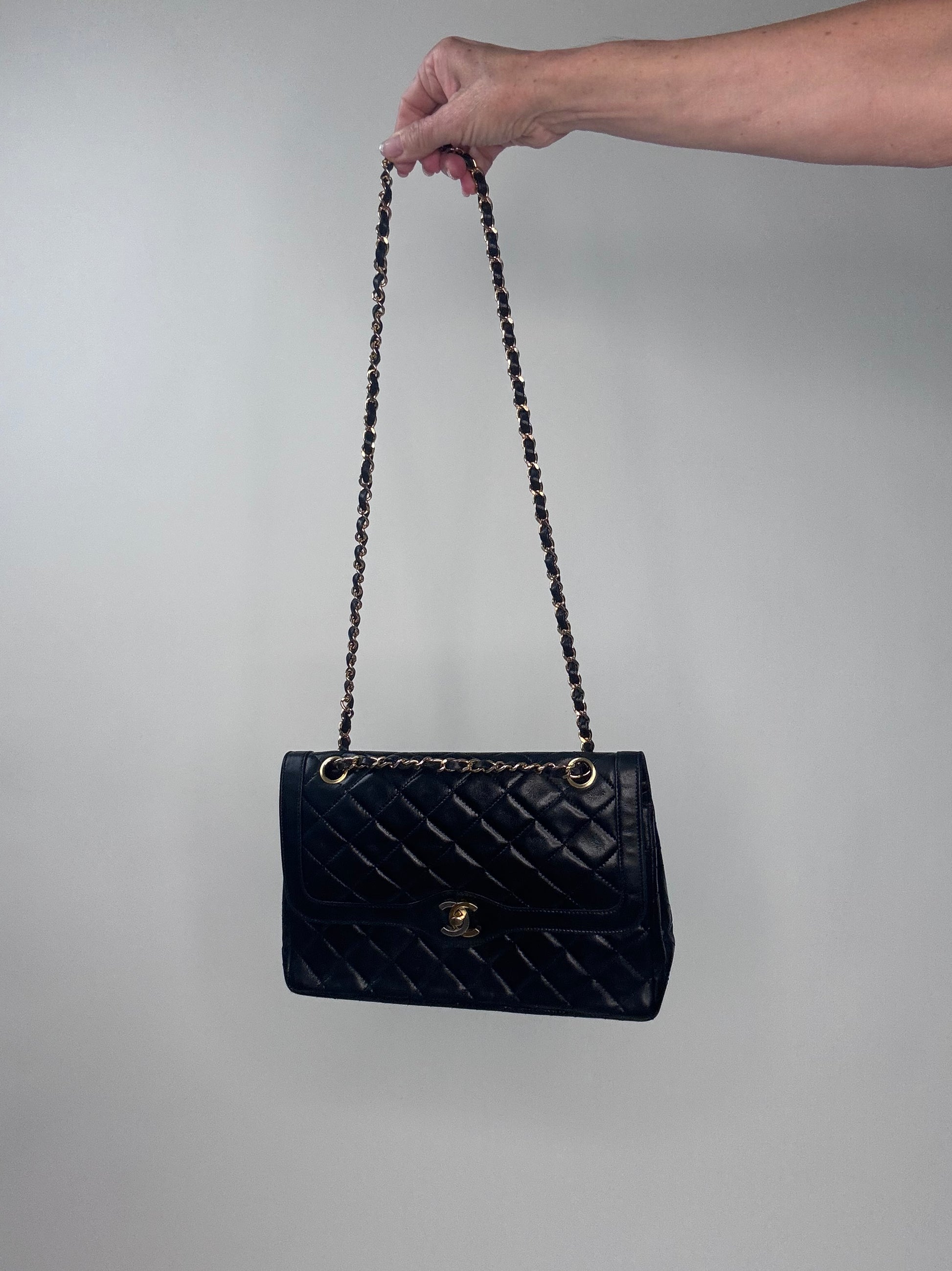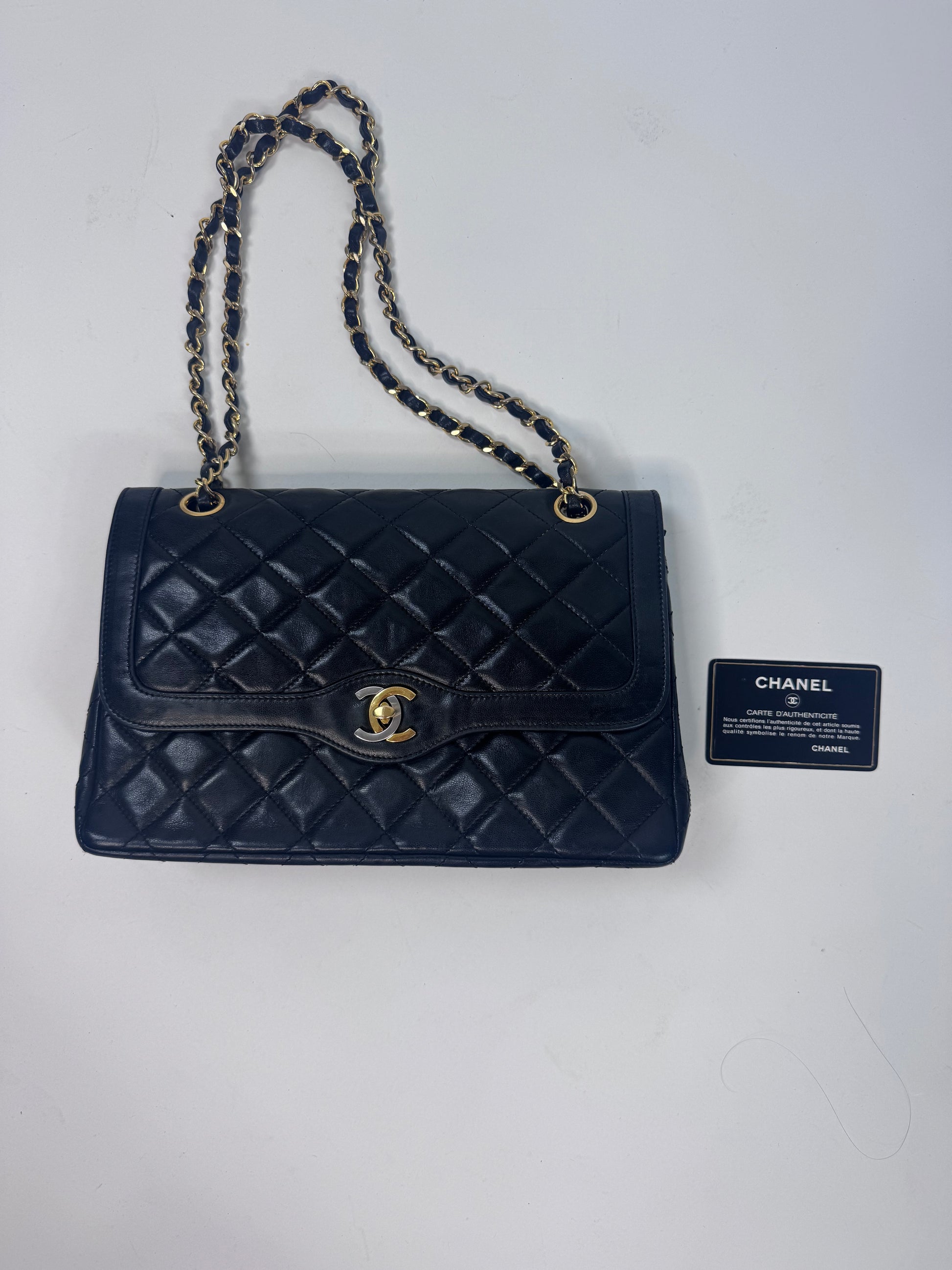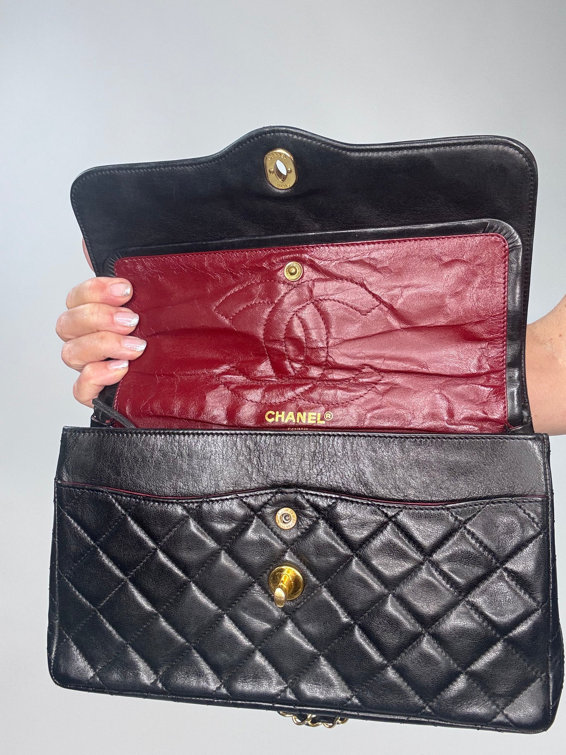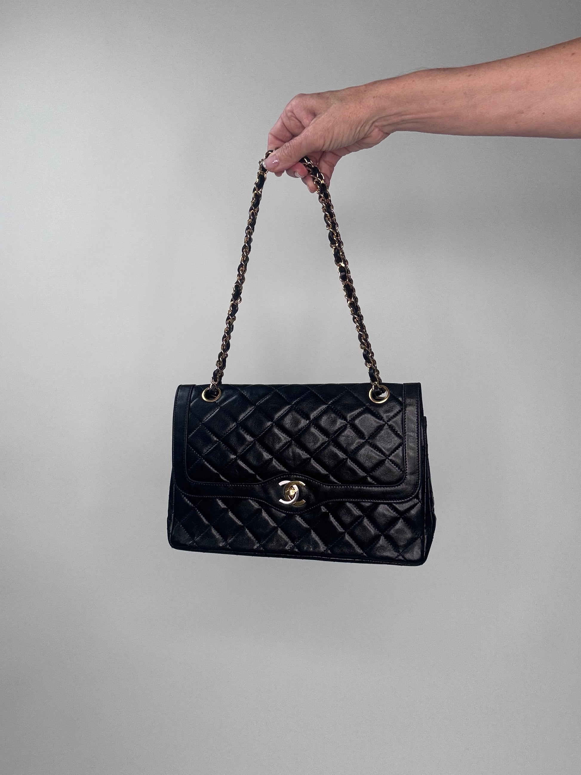 This vintage preowned Chanel Quilted Lambskin Paris Limited Edition Double Flap Bag was introduced in the early 1990's. Crafted in black quilted lambskin, this handbag has the double flap and the burgundy lambskin interior with 3 pockets and one that zips closed. There is an additional quilted pocket on the backside of this handbag. Chanel's classic logo is designed in silver and gold with a turn lock enclosure. The leather and gold chain strap is adjustable to also wear as a crossbody.