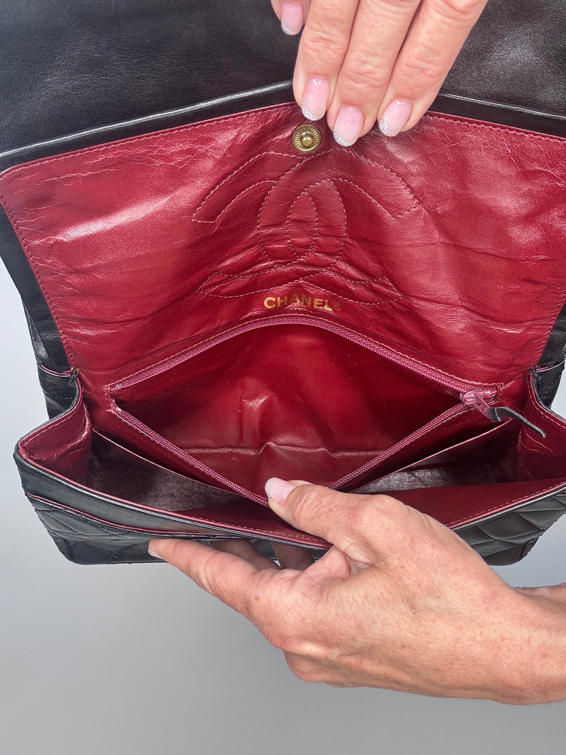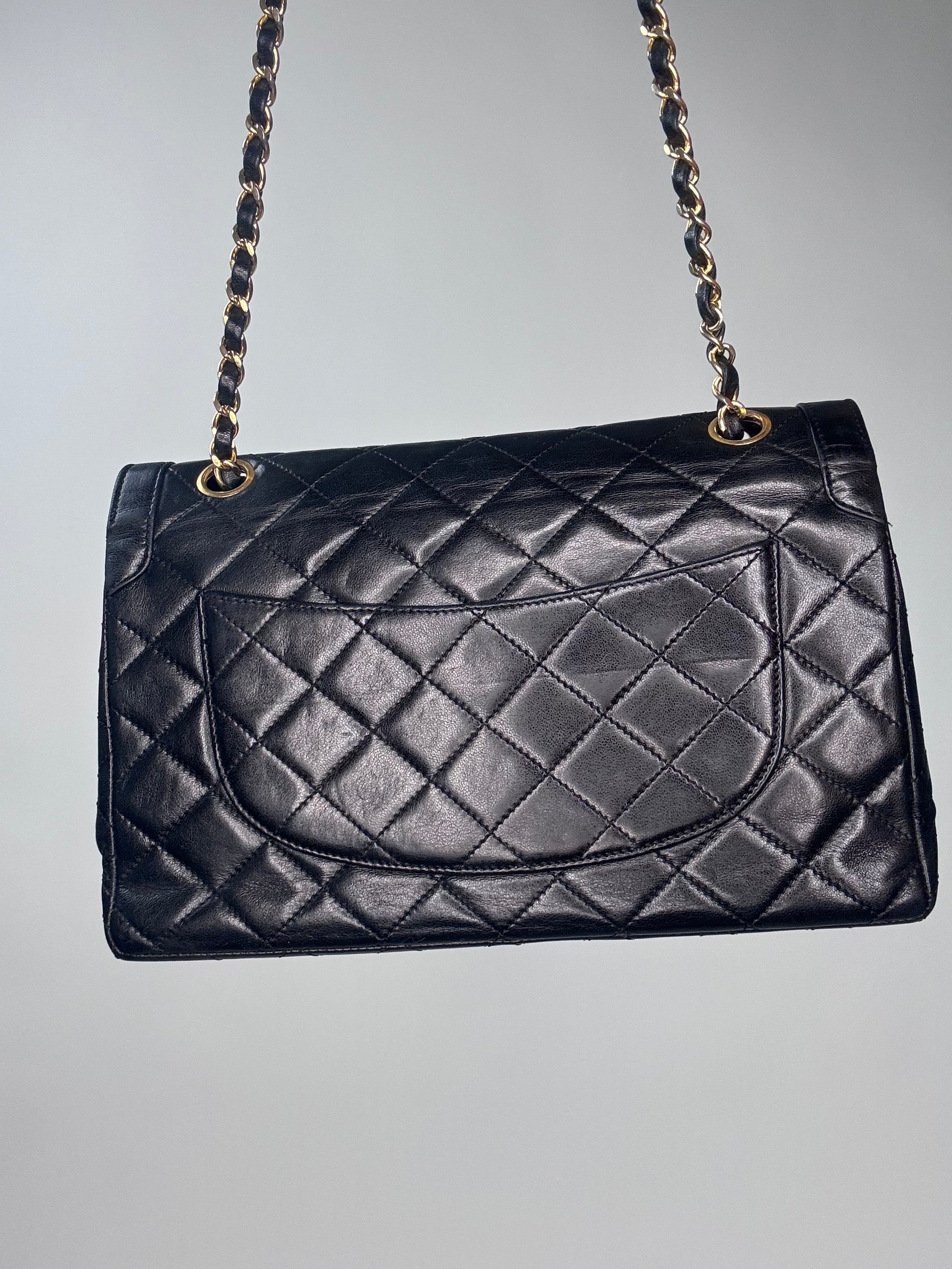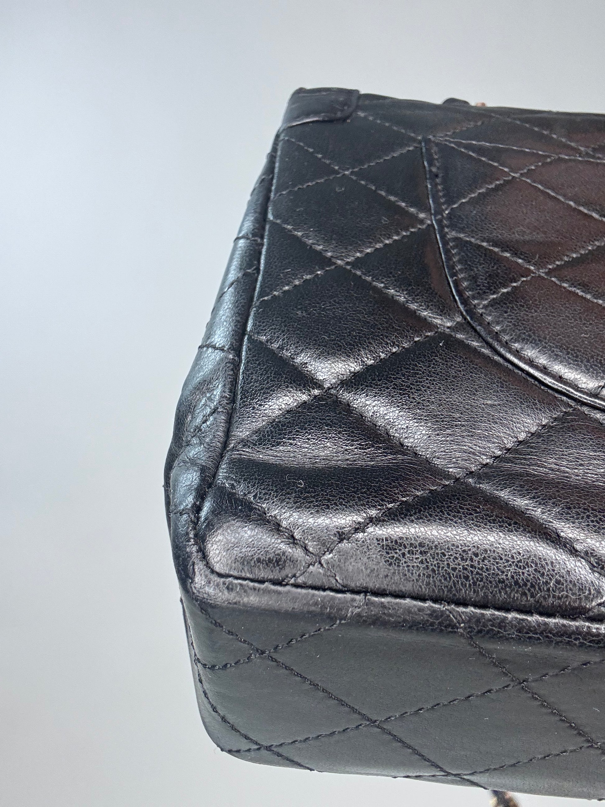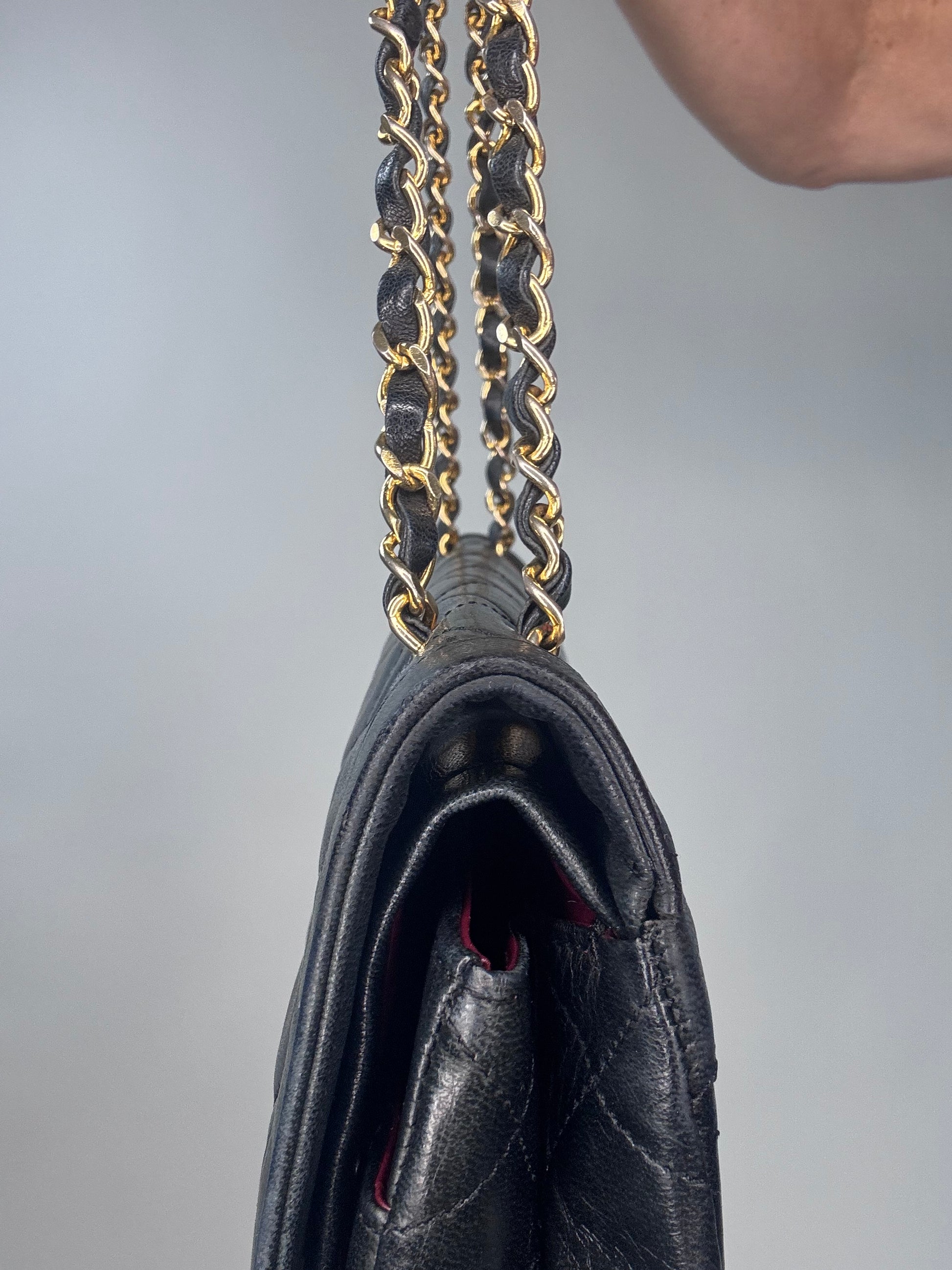 This vintage preowned Chanel Quilted Lambskin Paris Limited Edition Double Flap Bag was introduced in the early 1990's. Crafted in black quilted lambskin, this handbag has the double flap and the burgundy lambskin interior with 3 pockets and one that zips closed. There is an additional quilted pocket on the backside of this handbag. Chanel's classic logo is designed in silver and gold with a turn lock enclosure. The leather and gold chain strap is adjustable to also wear as a crossbody.