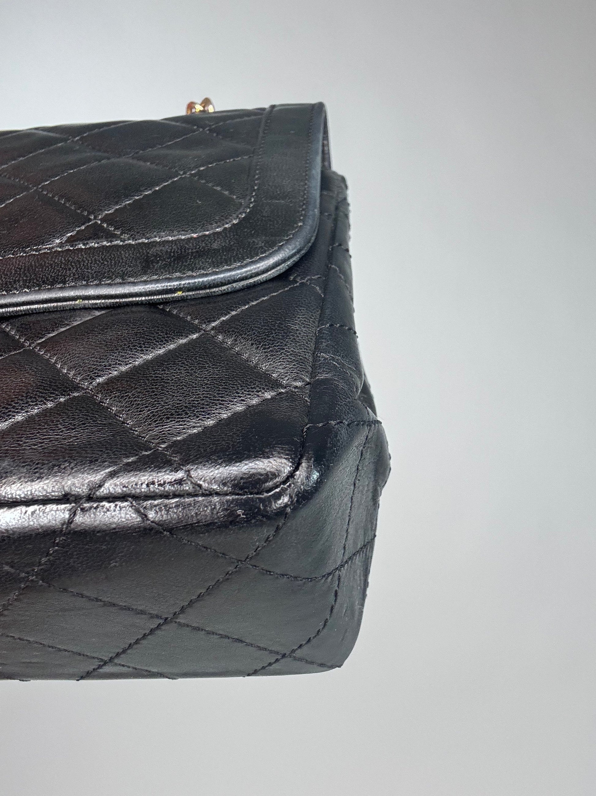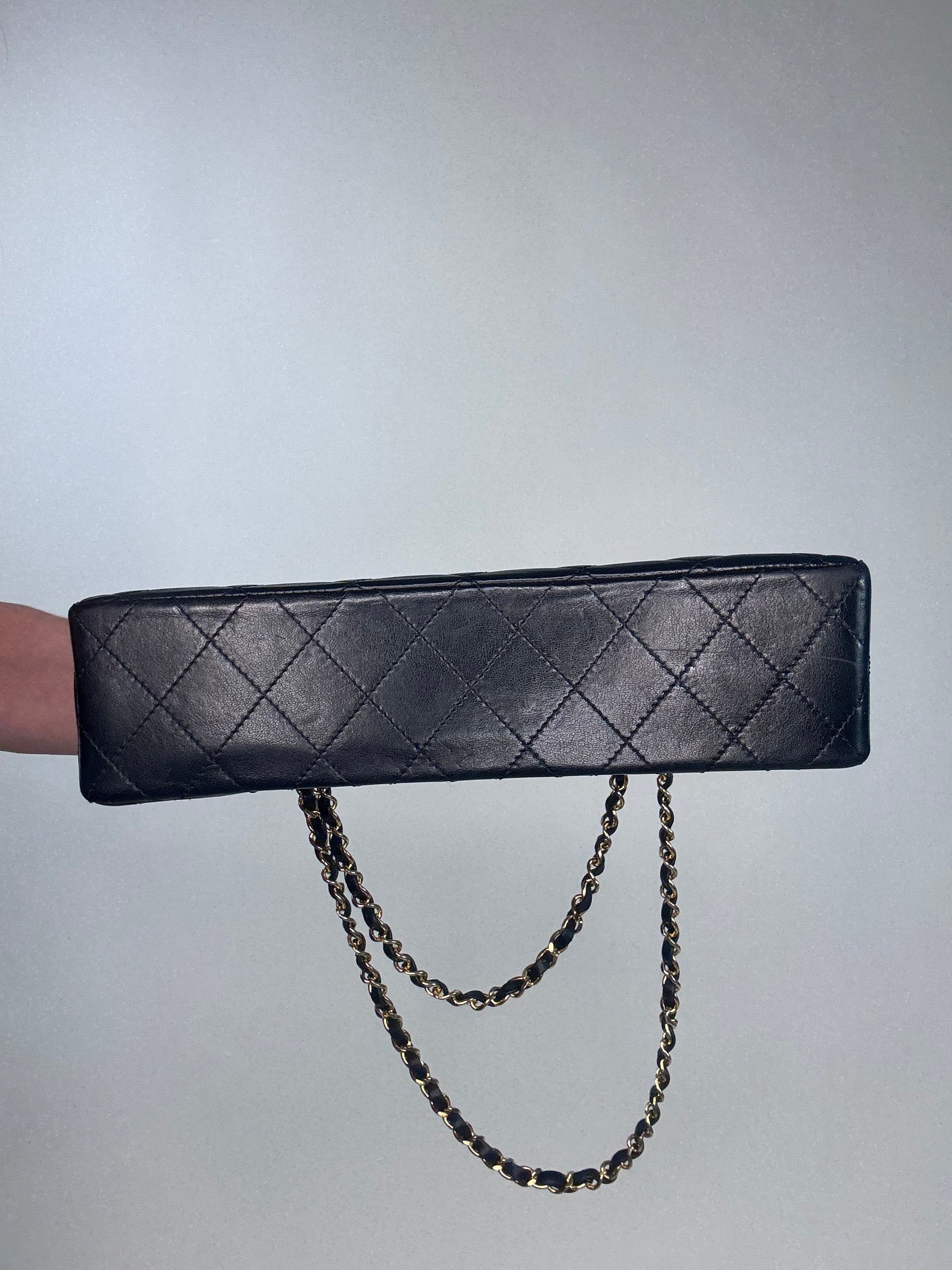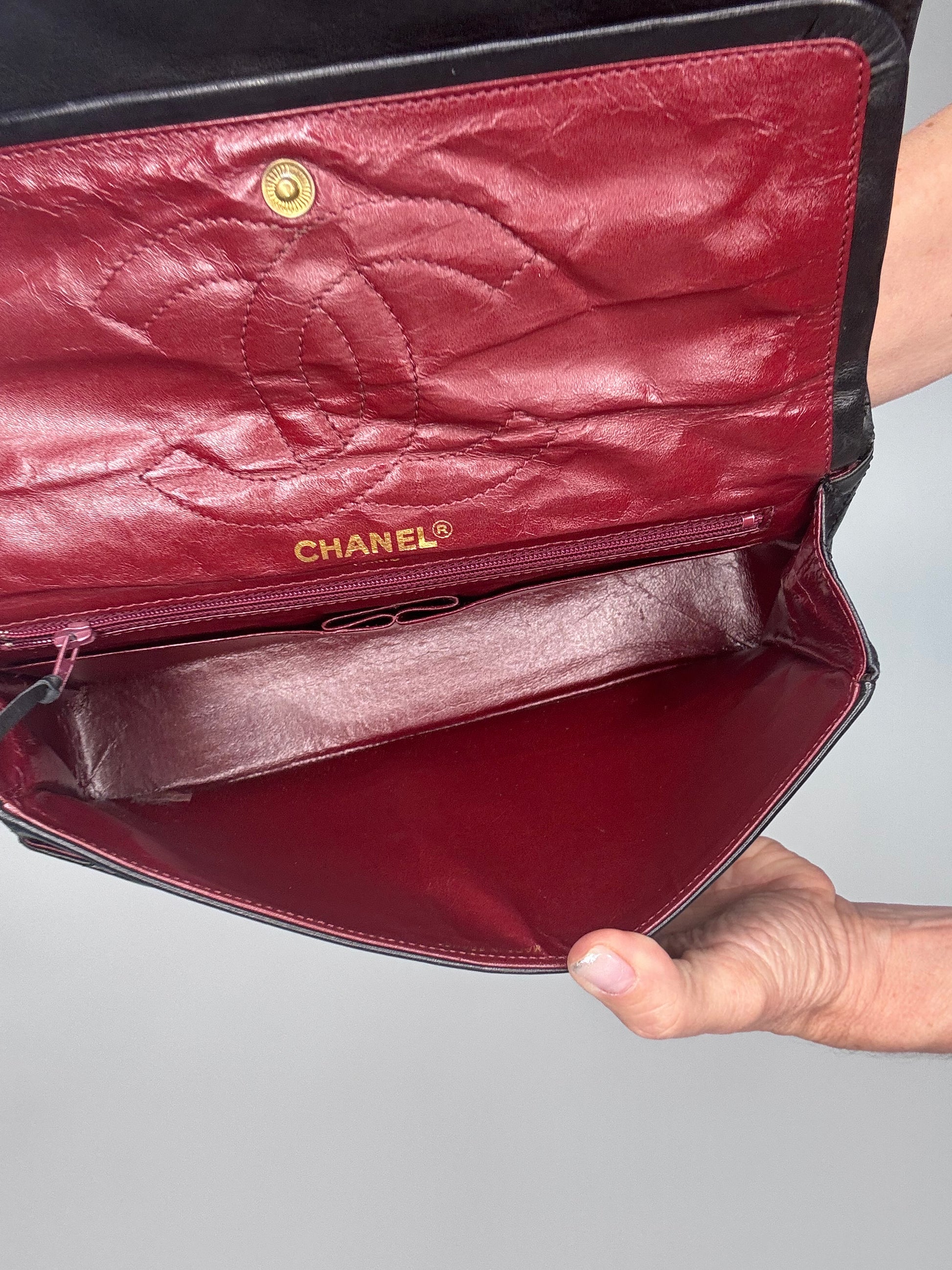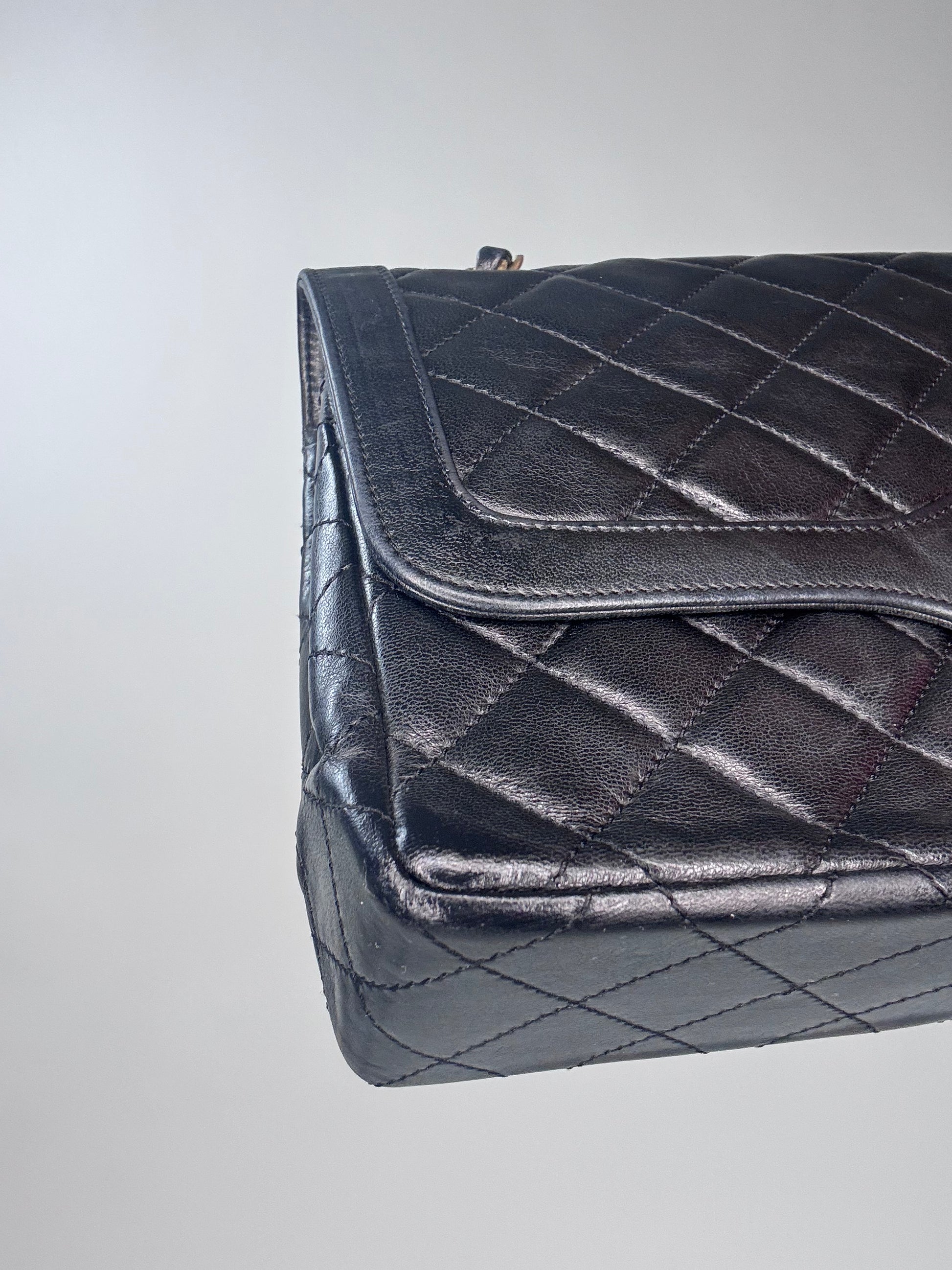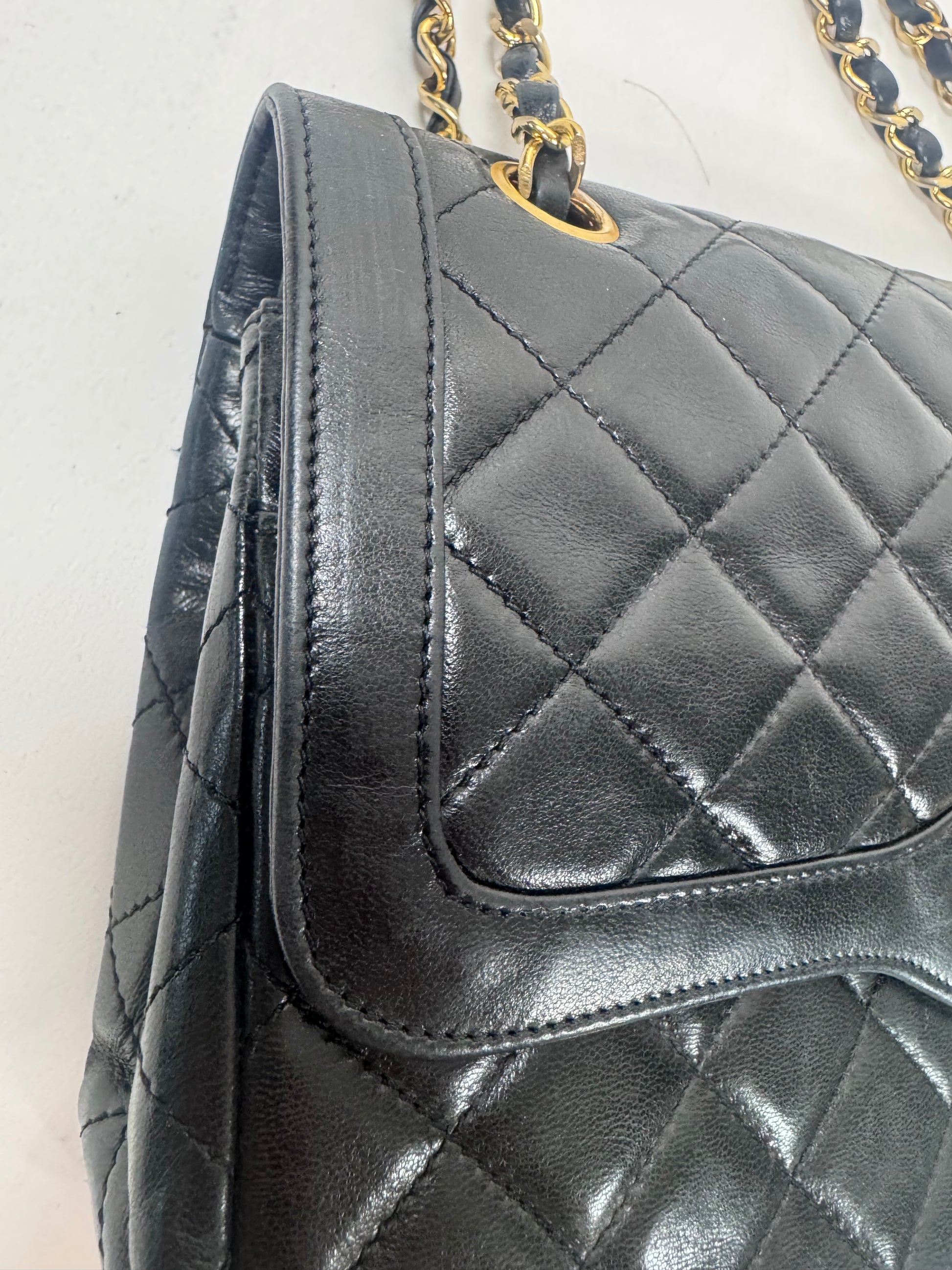This vintage preowned Chanel Quilted Lambskin Paris Limited Edition Double Flap Bag was introduced in the early 1990's. Crafted in black quilted lambskin, this handbag has the double flap and the burgundy lambskin interior with 3 pockets and one that zips closed. There is an additional quilted pocket on the backside of this handbag. Chanel's classic logo is designed in silver and gold with a turn lock enclosure. The leather and gold chain strap is adjustable to also wear as a crossbody.