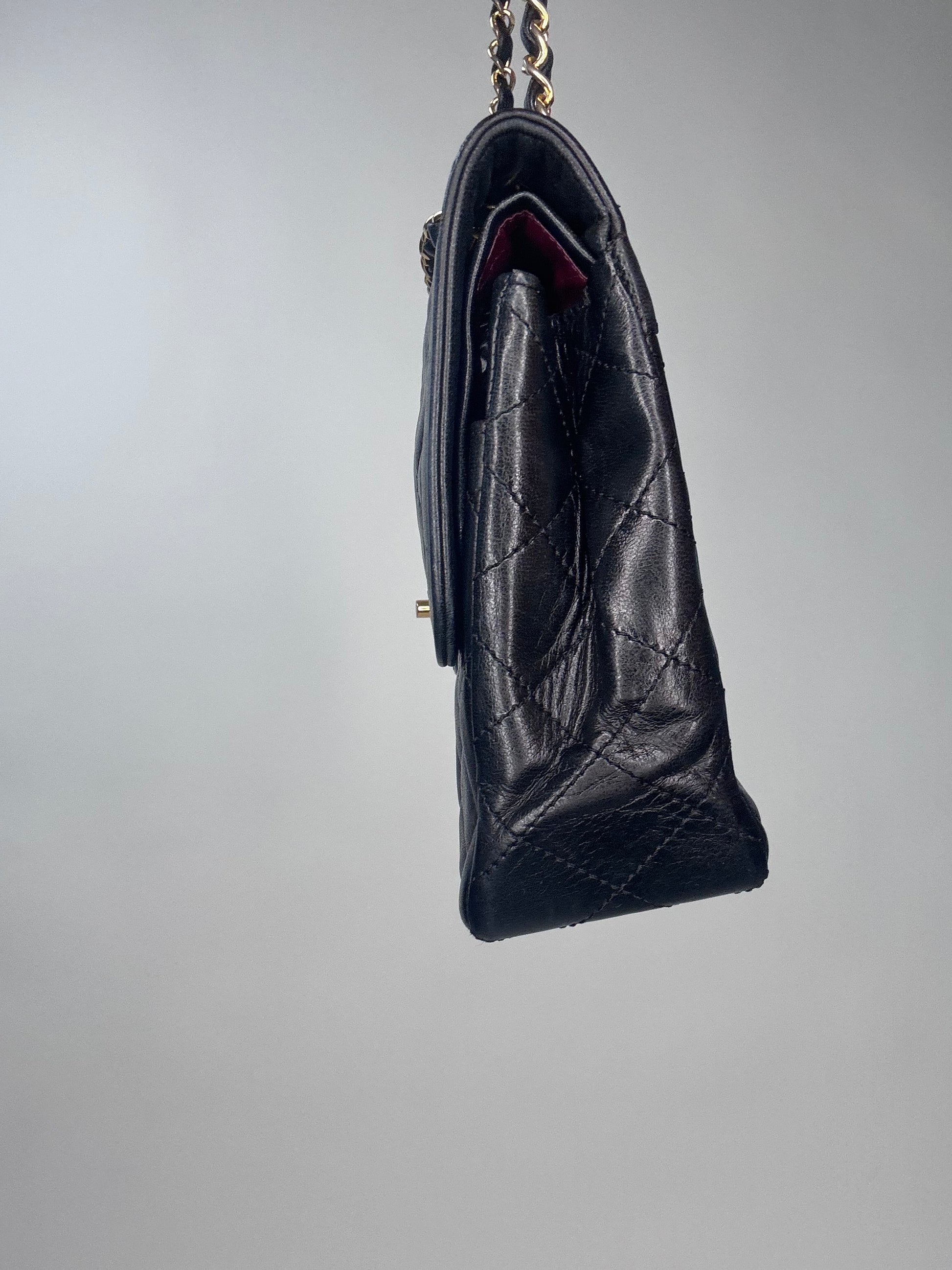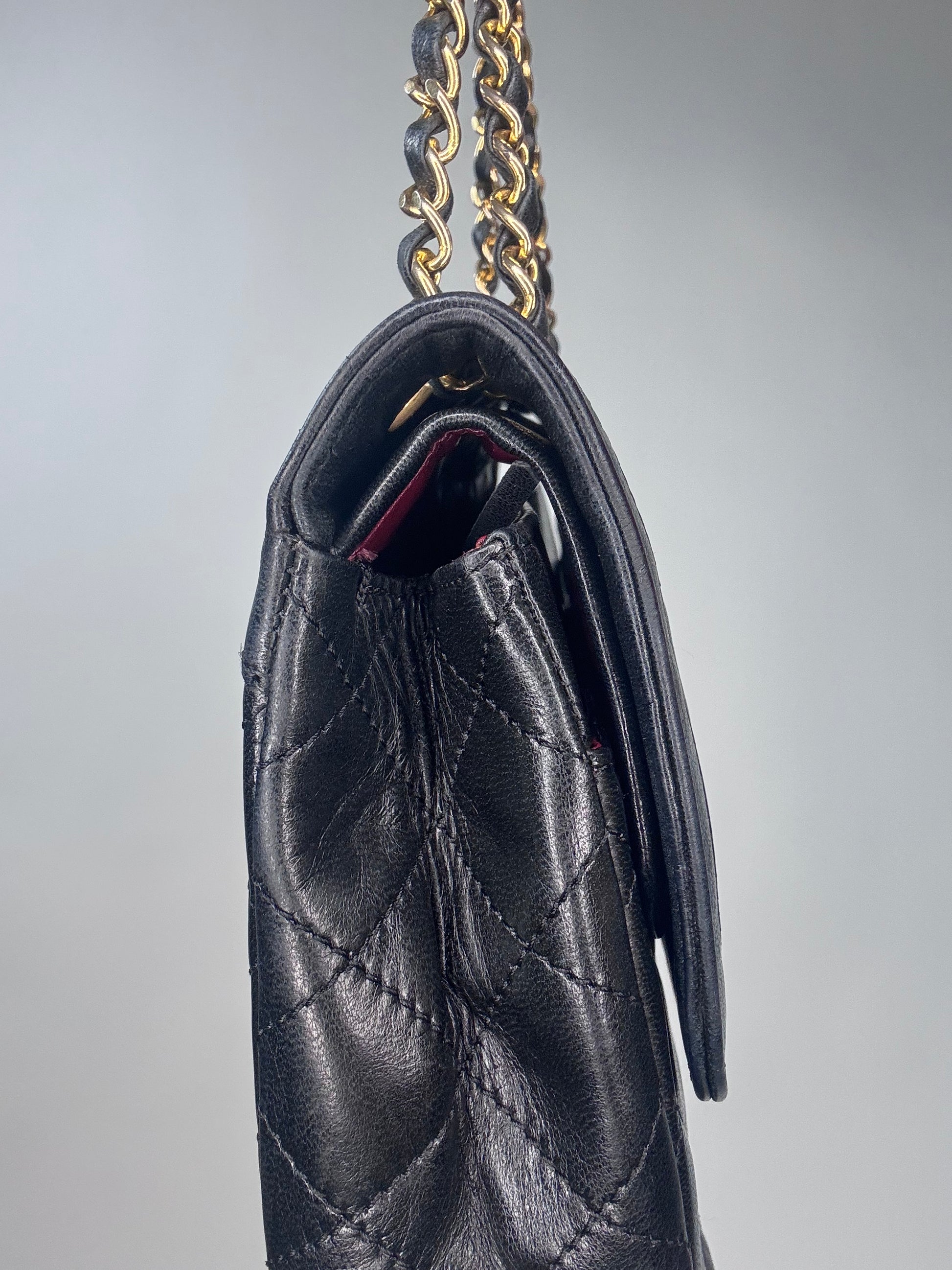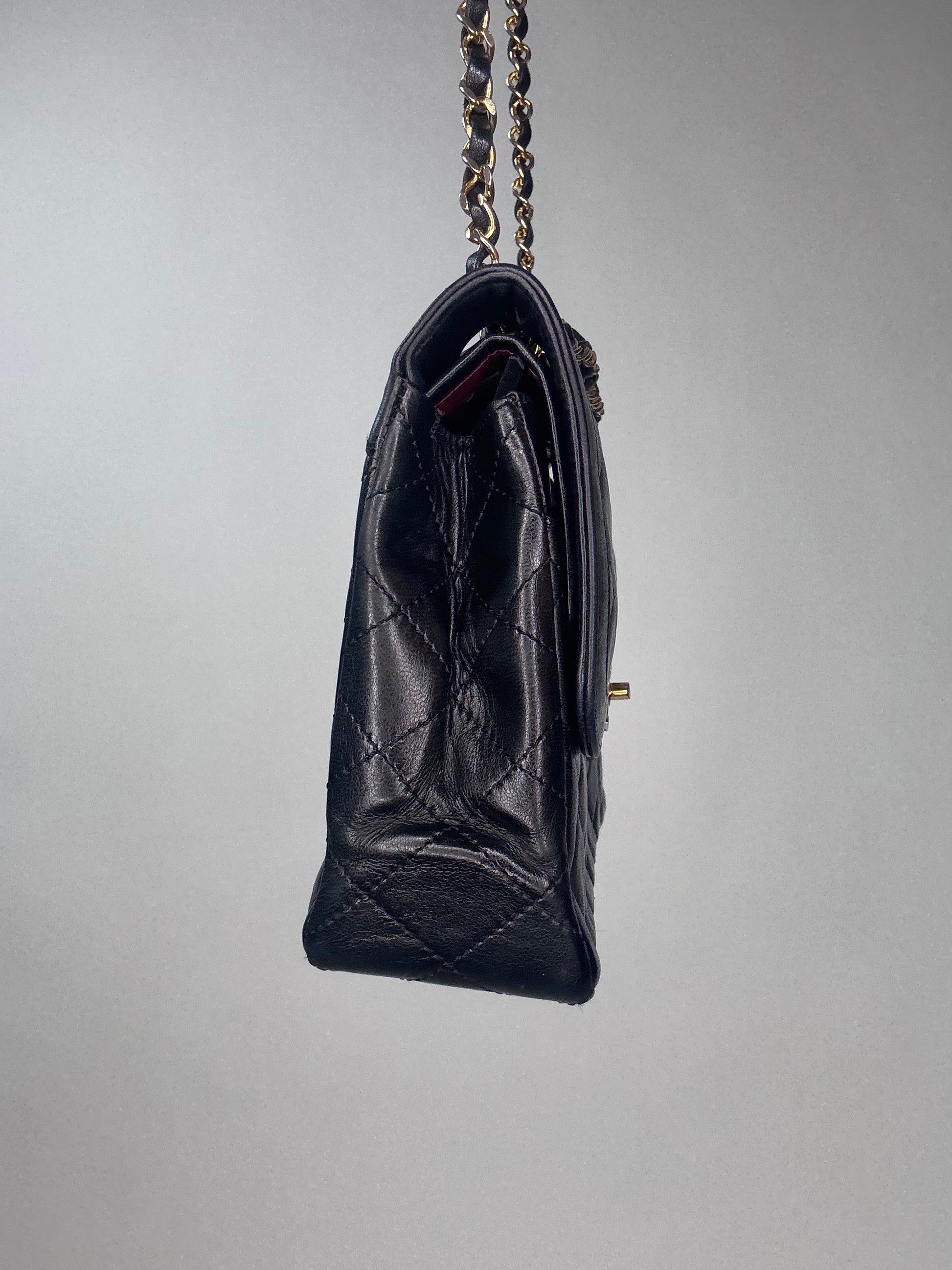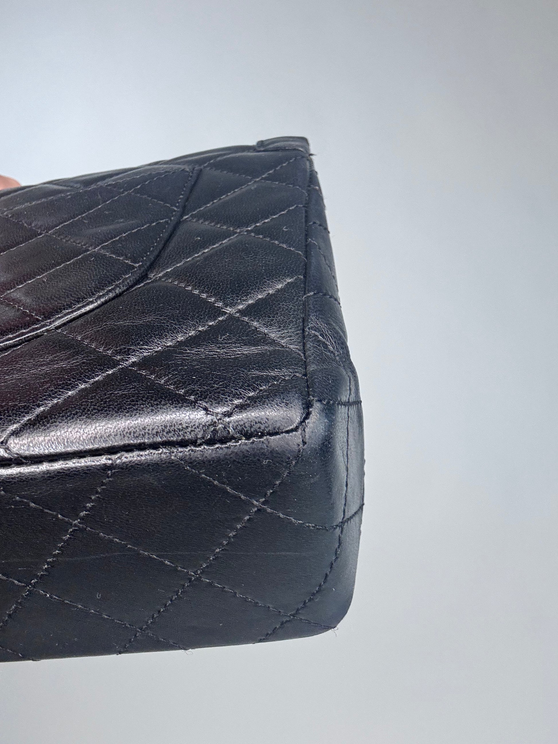 This vintage preowned Chanel Quilted Lambskin Paris Limited Edition Double Flap Bag was introduced in the early 1990's. Crafted in black quilted lambskin, this handbag has the double flap and the burgundy lambskin interior with 3 pockets and one that zips closed. There is an additional quilted pocket on the backside of this handbag. Chanel's classic logo is designed in silver and gold with a turn lock enclosure. The leather and gold chain strap is adjustable to also wear as a crossbody.