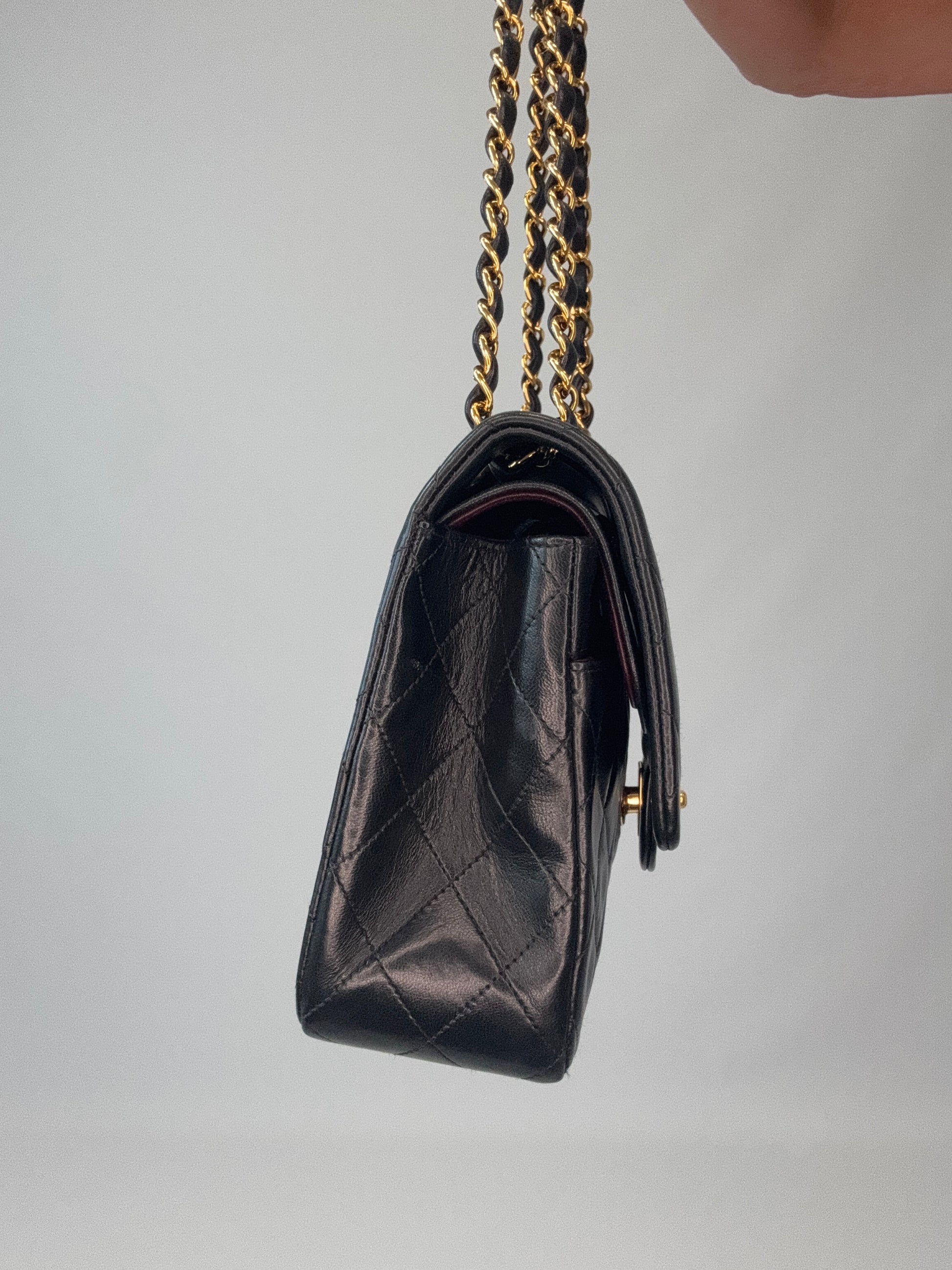 This authentic preowned CHANEL Quilted Medium Double Flap is designed in a beautiful diamond quilted lambskin leather in black. This chic shoulder bag features a rear flat pocket, a leather threaded polished gold chain link shoulder strap, and a matching 24k gold plated classic CC turn lock on the front flap. This beautiful and classic handbag opens to a zipper pocket on the main flap and an inner flap with smooth burgundy leather interior with 2 patch pockets and one additional front opening.