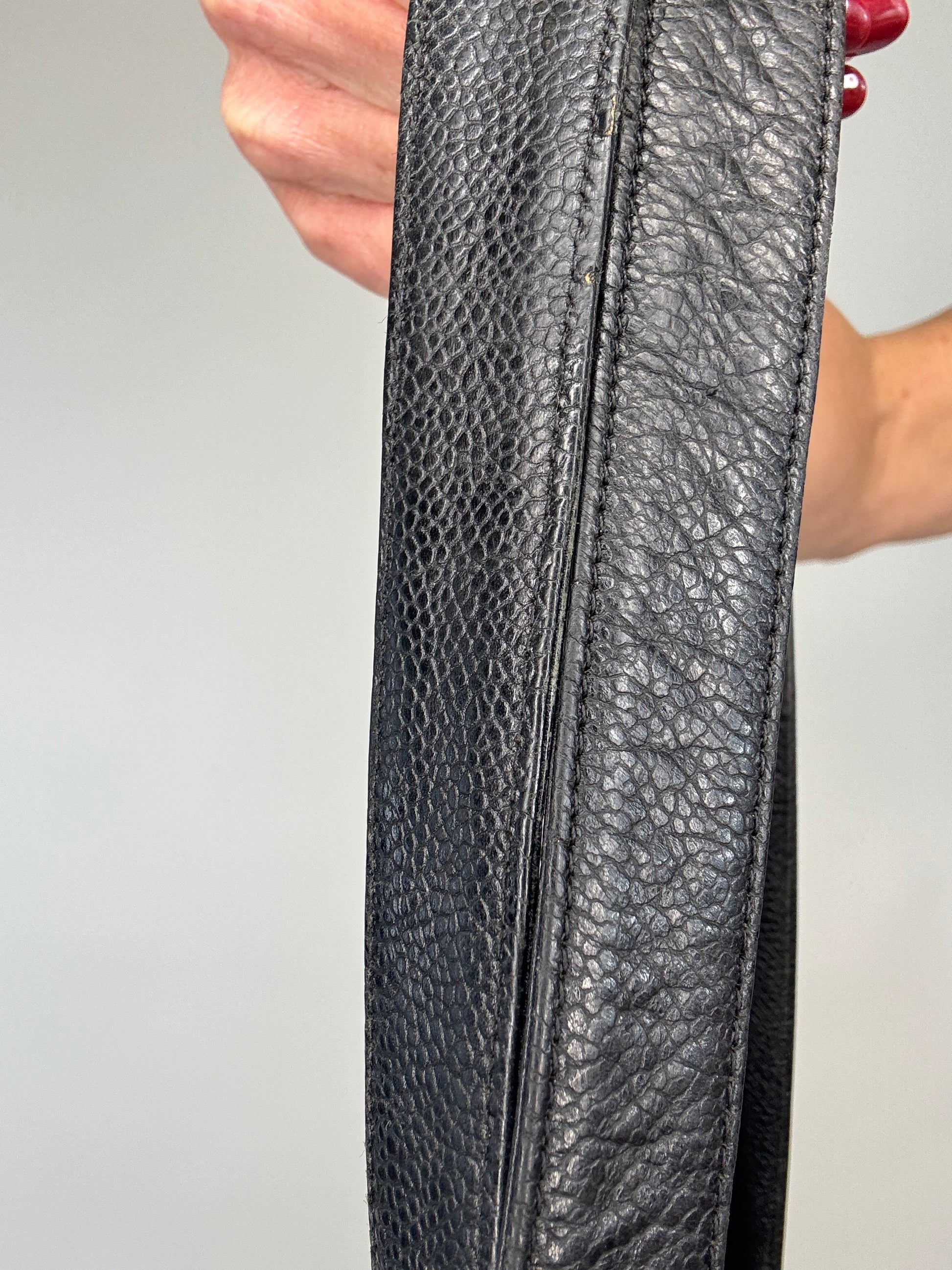 Note strap leather wear, strap leather color touch up, slight corner wear upper and lower, slight tarnish on hardware. 7/10 good vintage condition Year 1994-1994