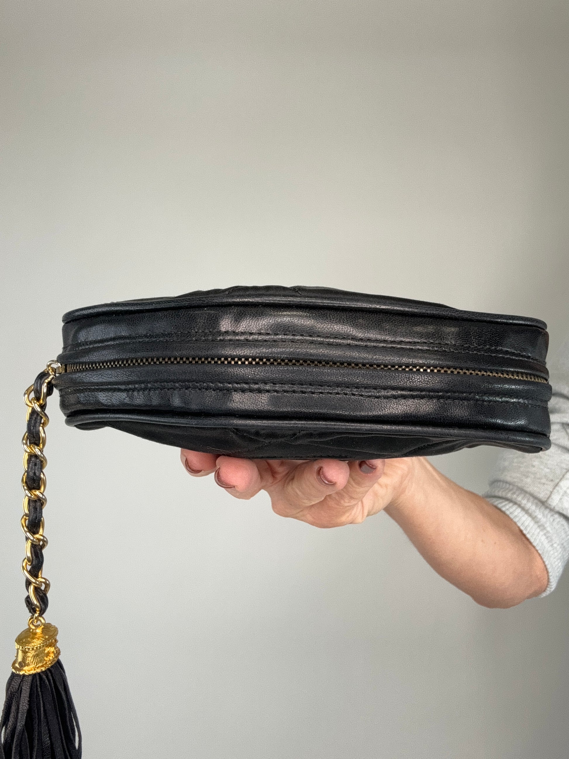 Rare Gem Chanel clutch made of satin, lambskin, 24K gold plated hardware , with an adorable lambskin tassel. This rare find is perfect for any special occasion. Fits your phone, and other small essentials .