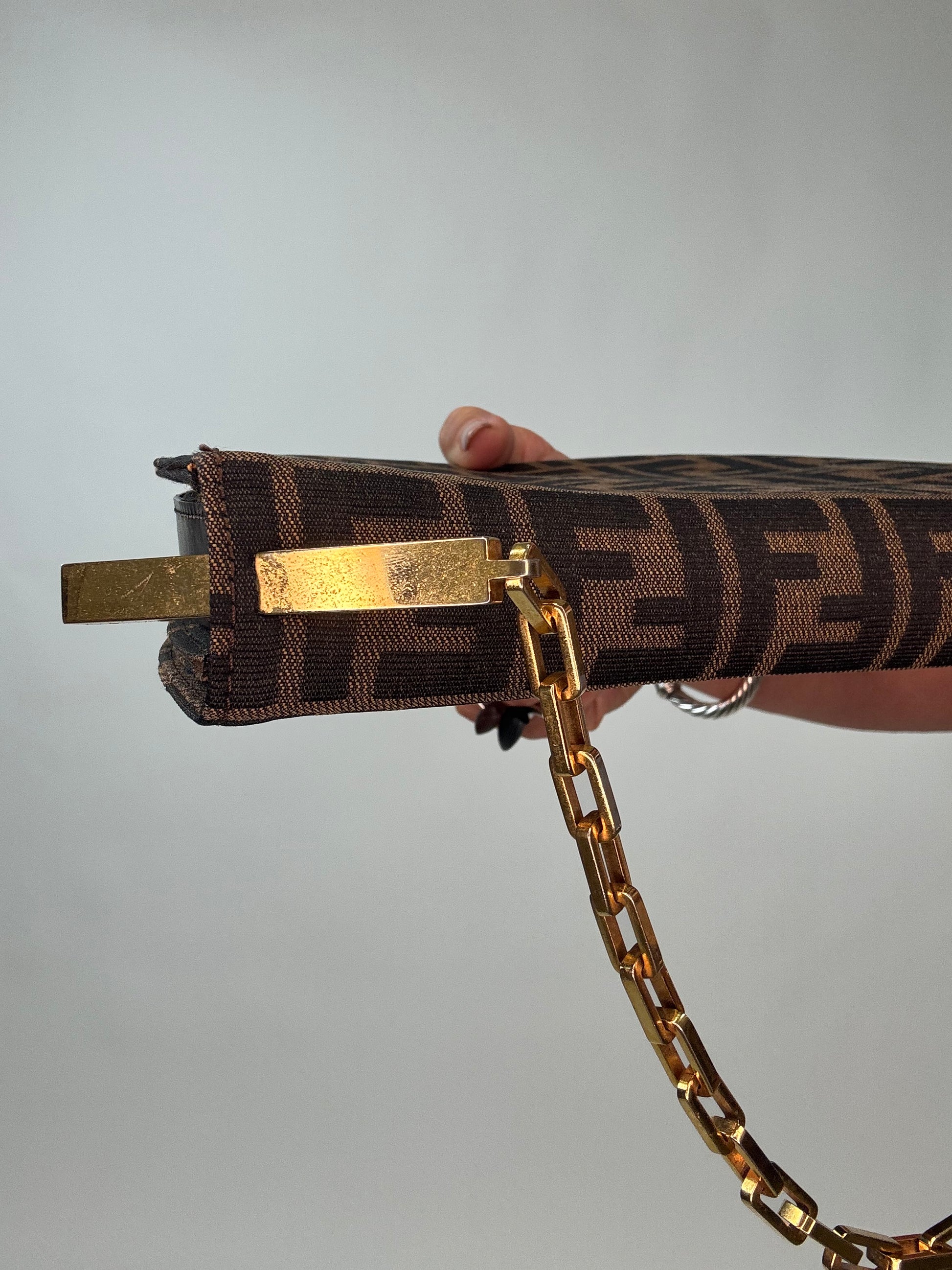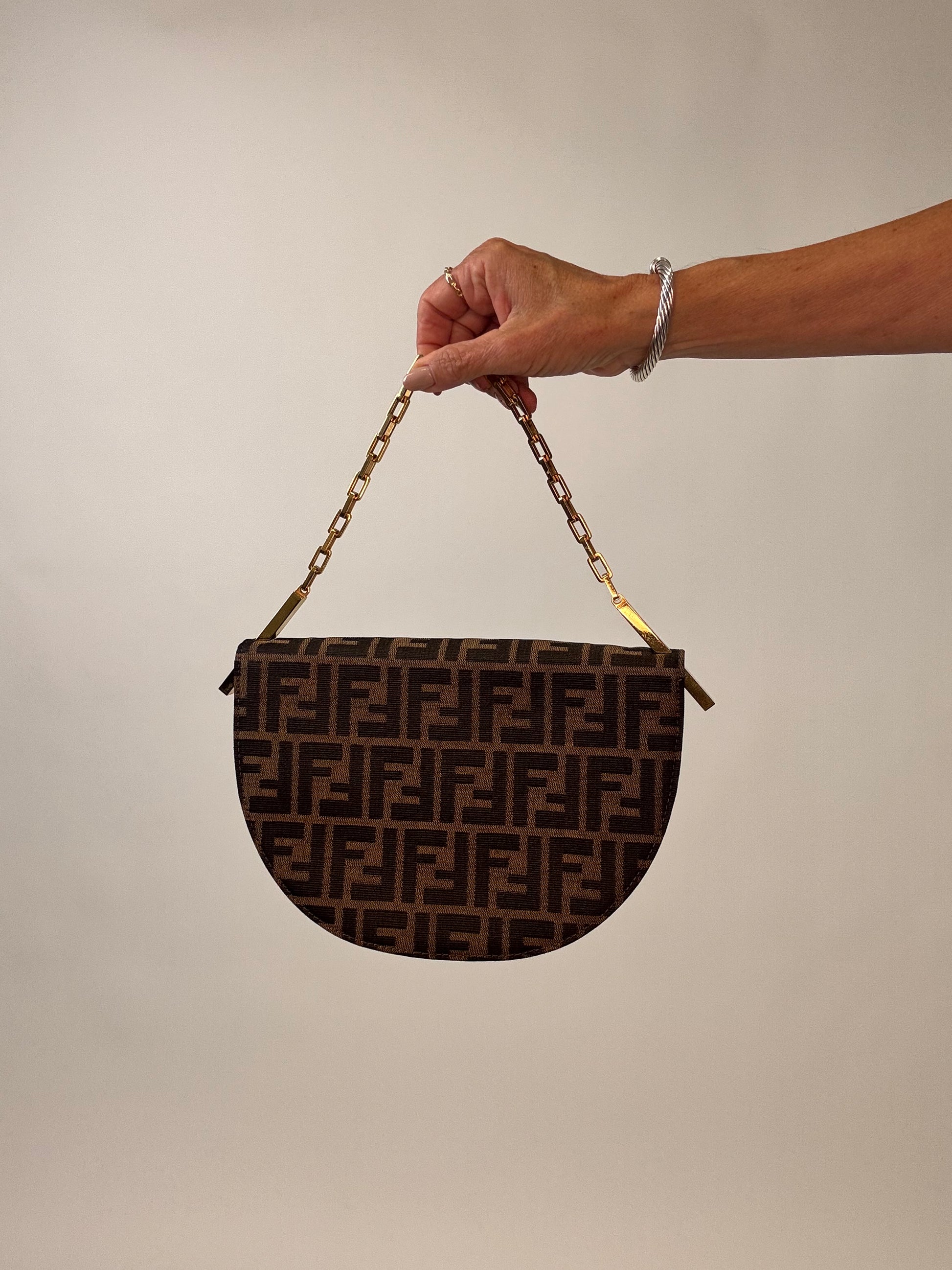 Fendi rare find!! Zucca classic, gold bar chain detail in a crescent design, fits all eveyday essentials and more. Wear on the shoulder or as top handle !