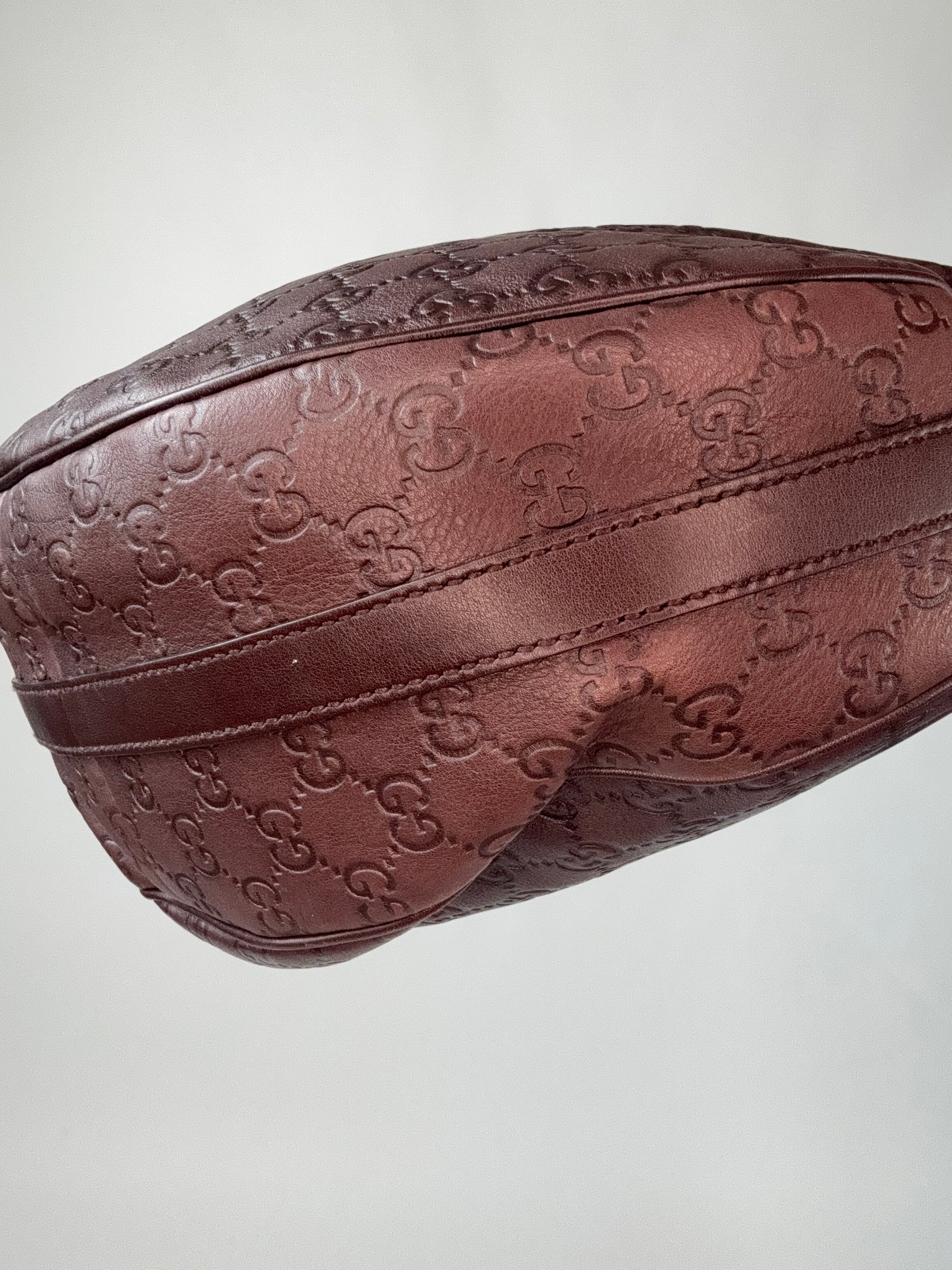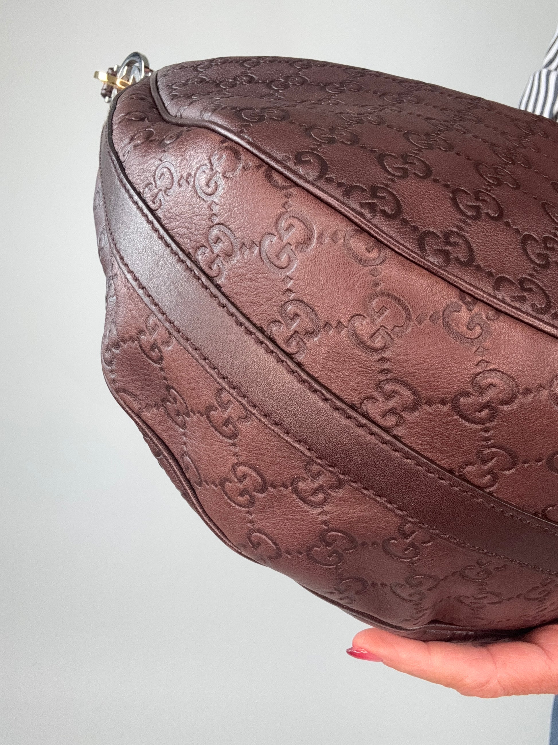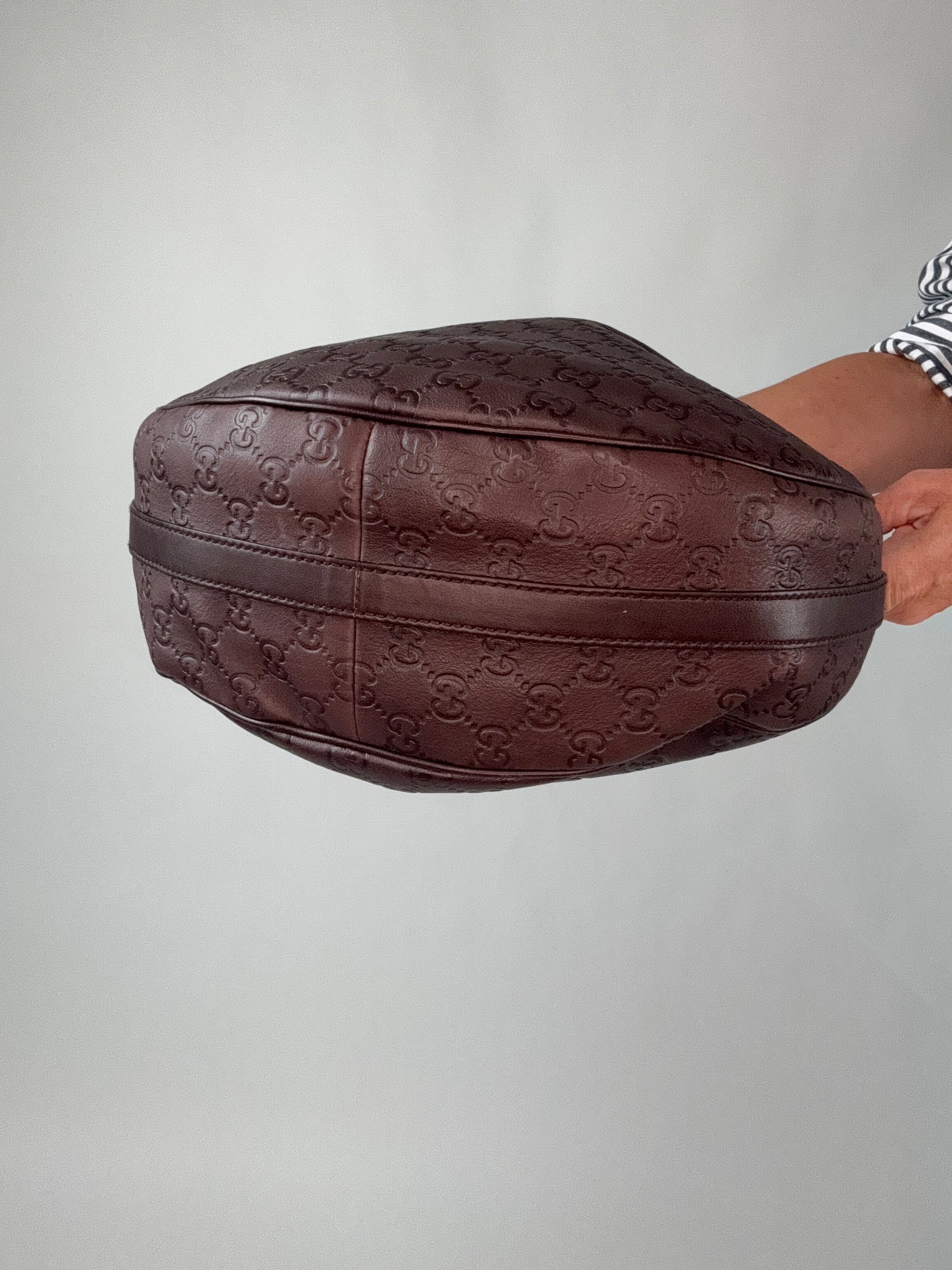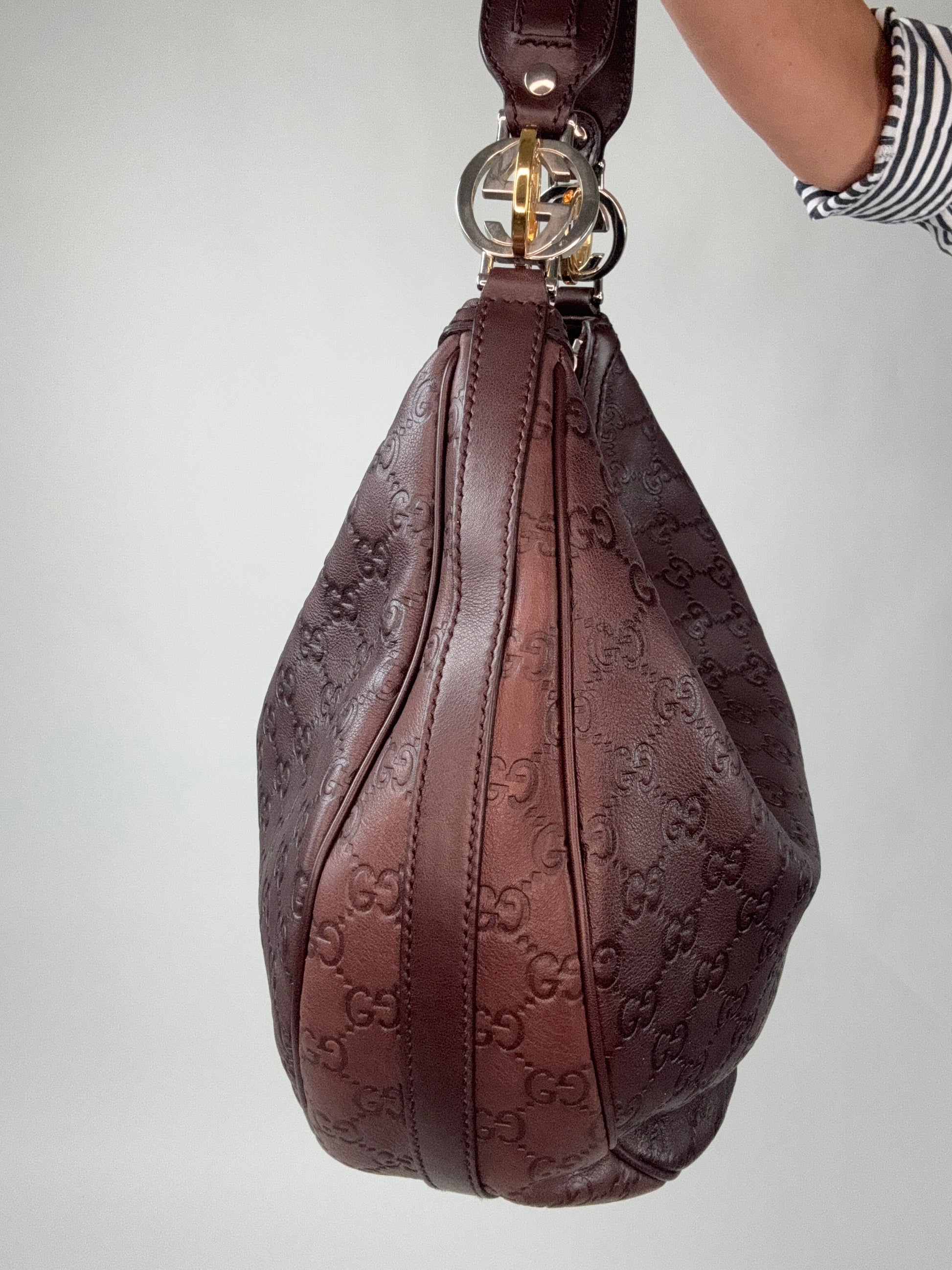Embossed monogram Gucci Hobo preowned bag , features mixed silver and gold hardware. Perfect amount of slouch, chic for everyday!