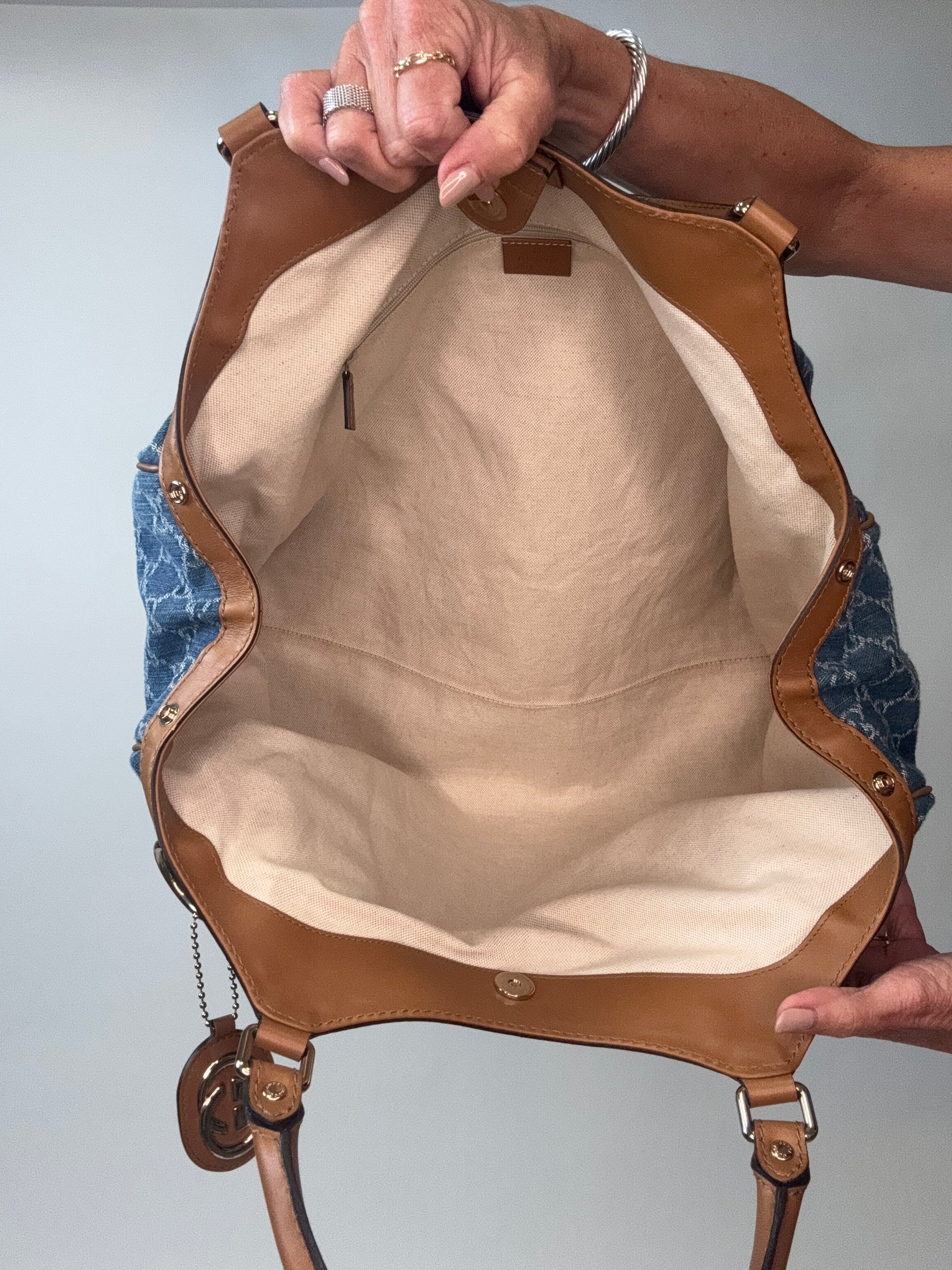 Large tote for everyday, travel, work and more. So Chic, trimmed in leather with a GG bag charm, the perfect denim color.