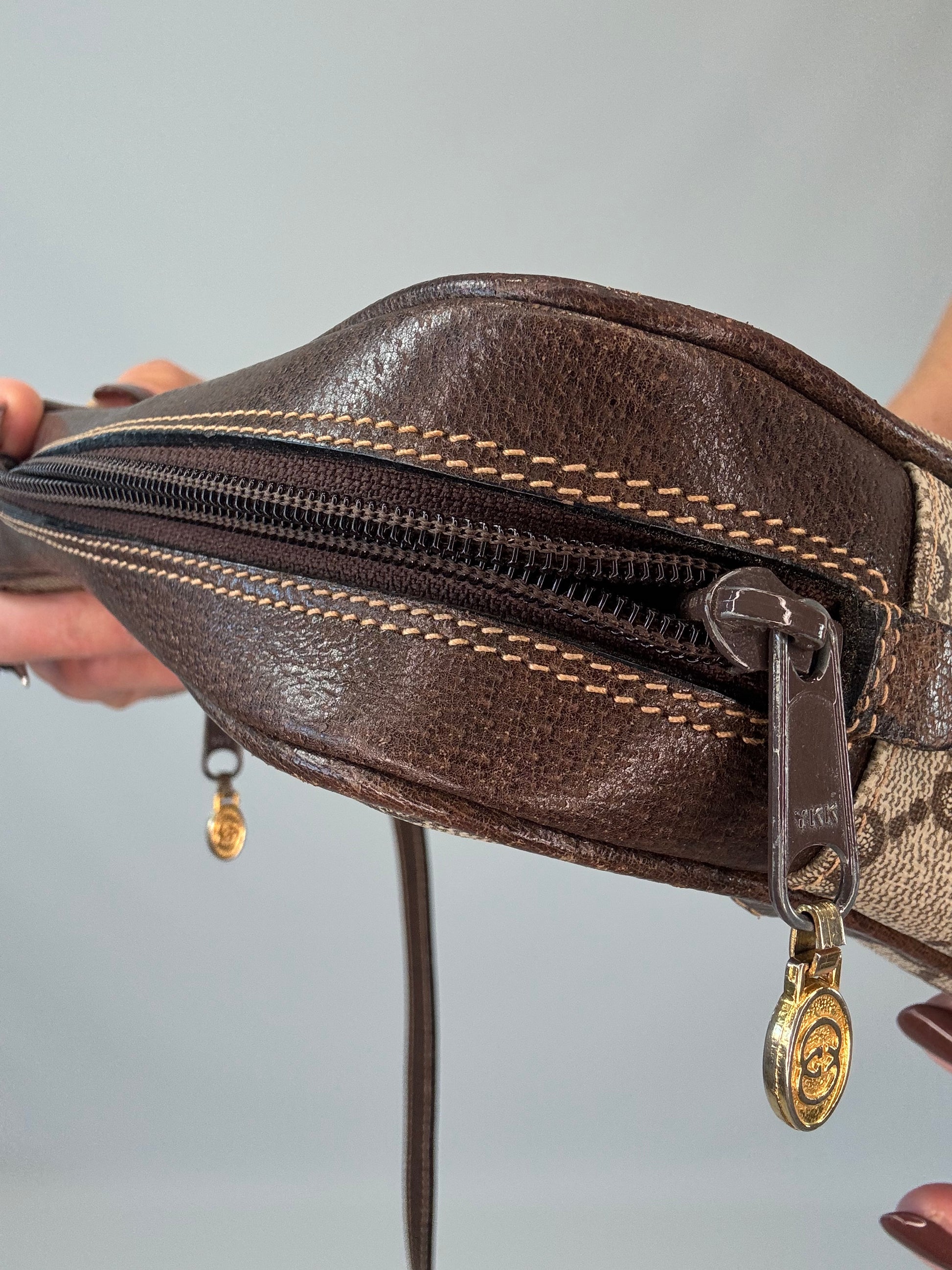 Vintage classic crossbody or shoulder bag. Always chic and always the perfect Gucci touch. Features vintage coated canvas and leather adjustable shoulder strap. Roomy enough for all everyday essentials with a front zip pocket.