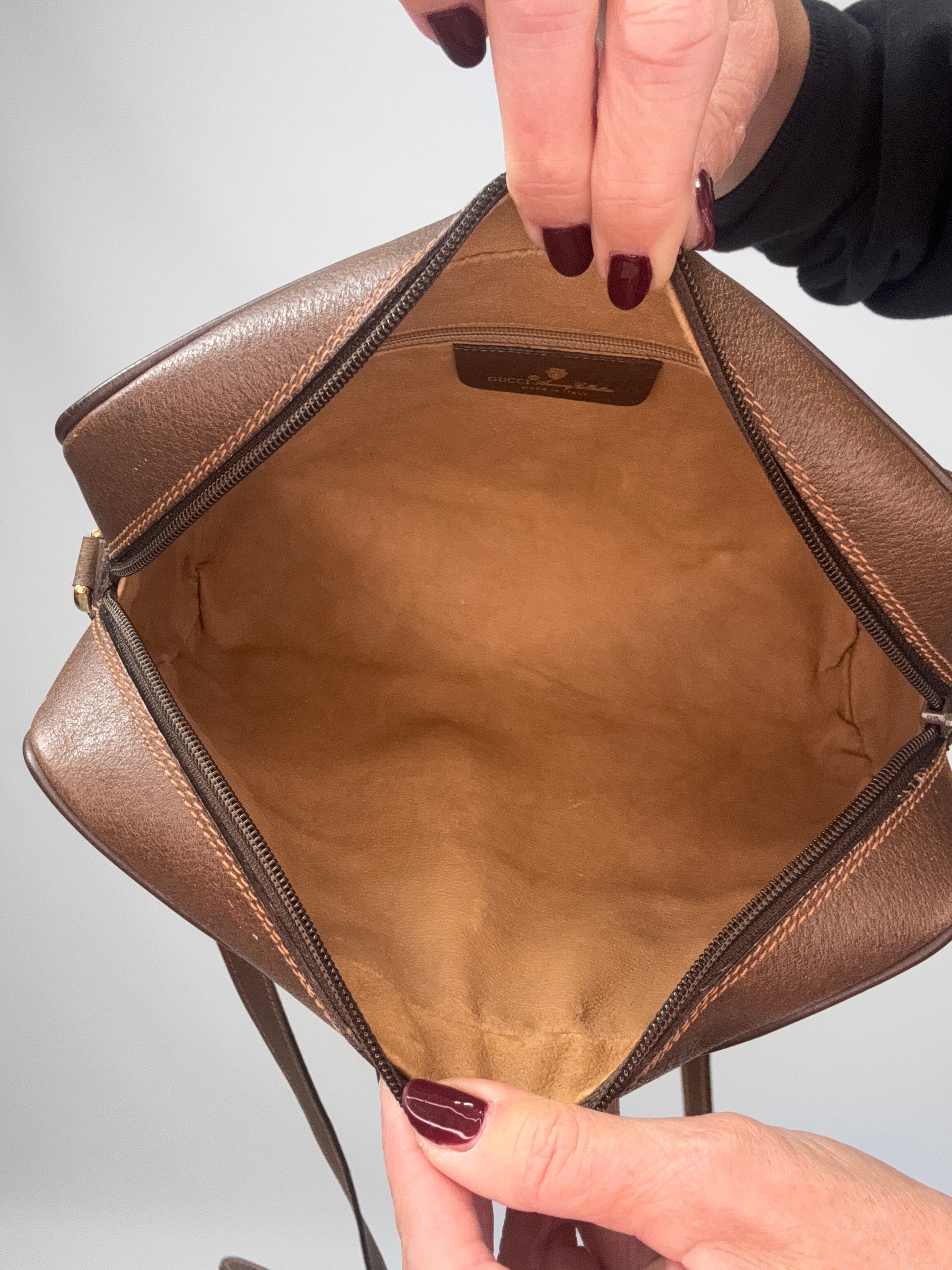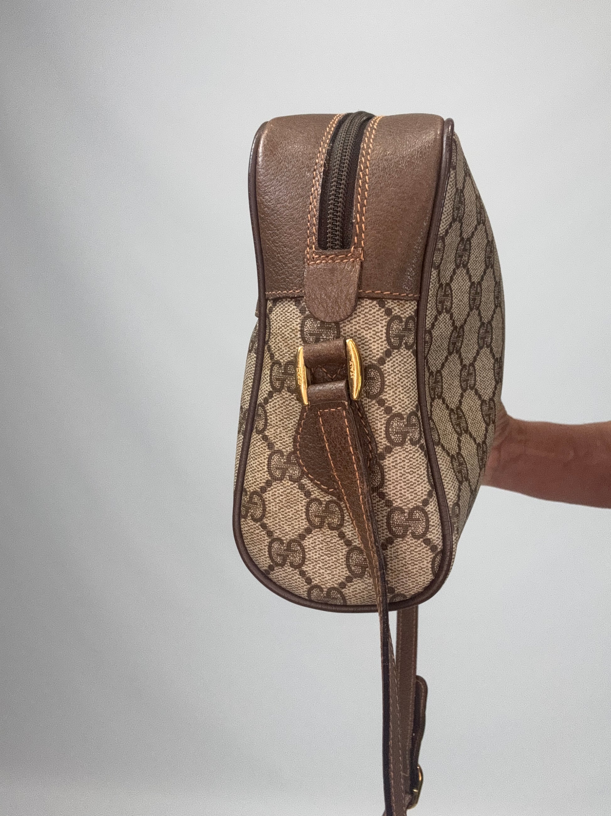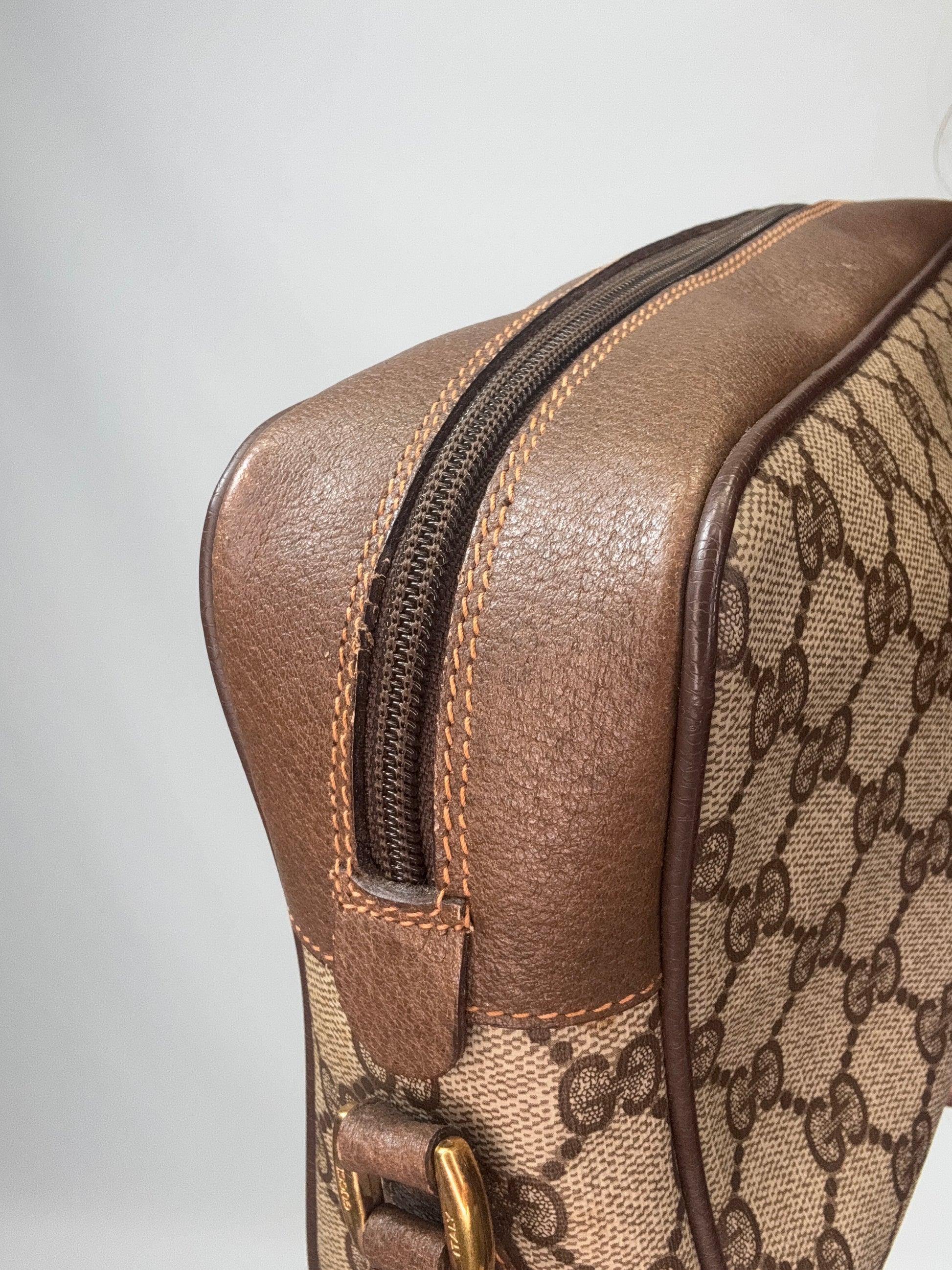 Timeless perfection, this vintage Gucci Monogram Supreme in coated canvas is trimmed in leather and adorned with 18k gold plated hardware. Wear as crossbody or shoulder bag.