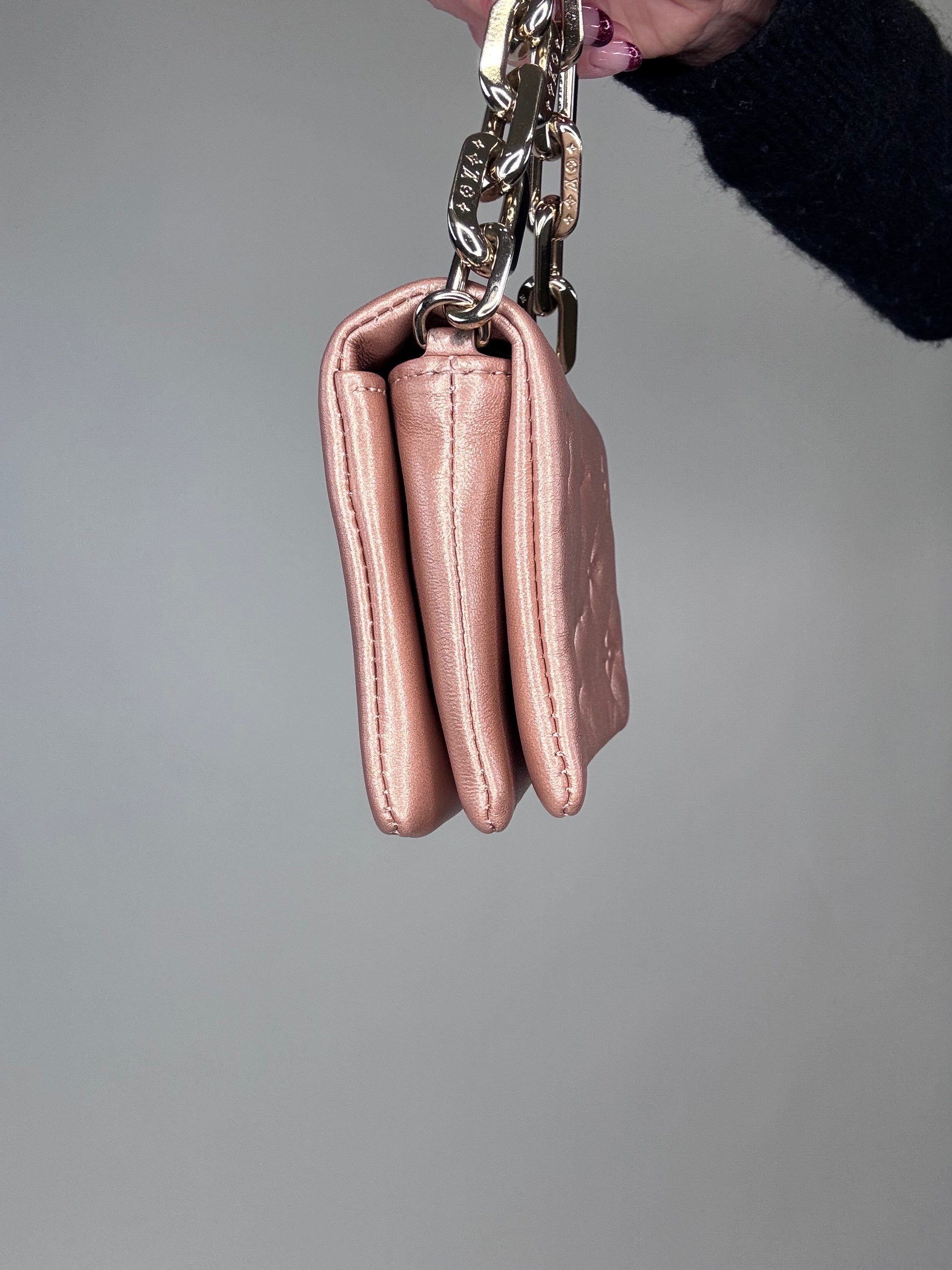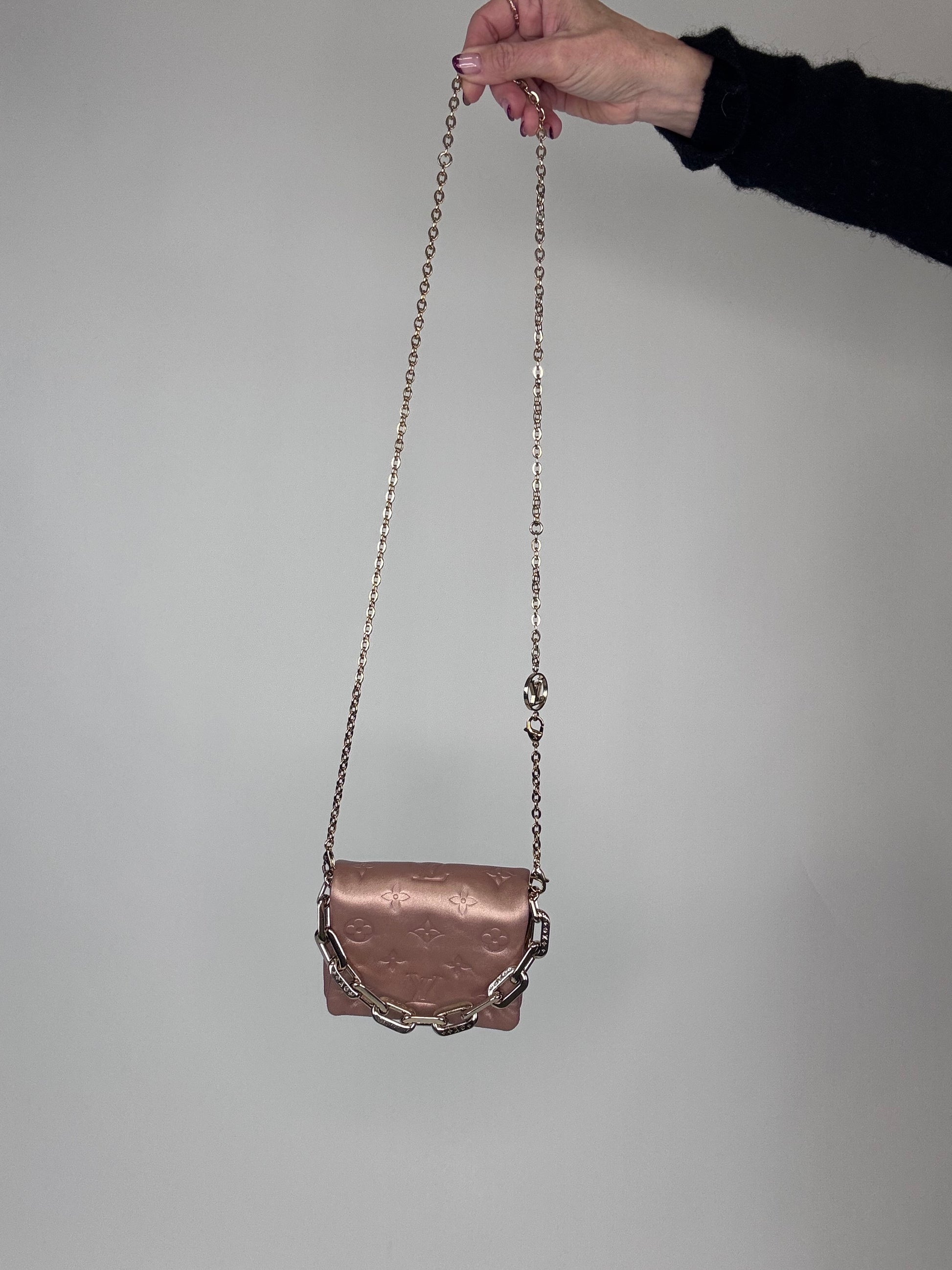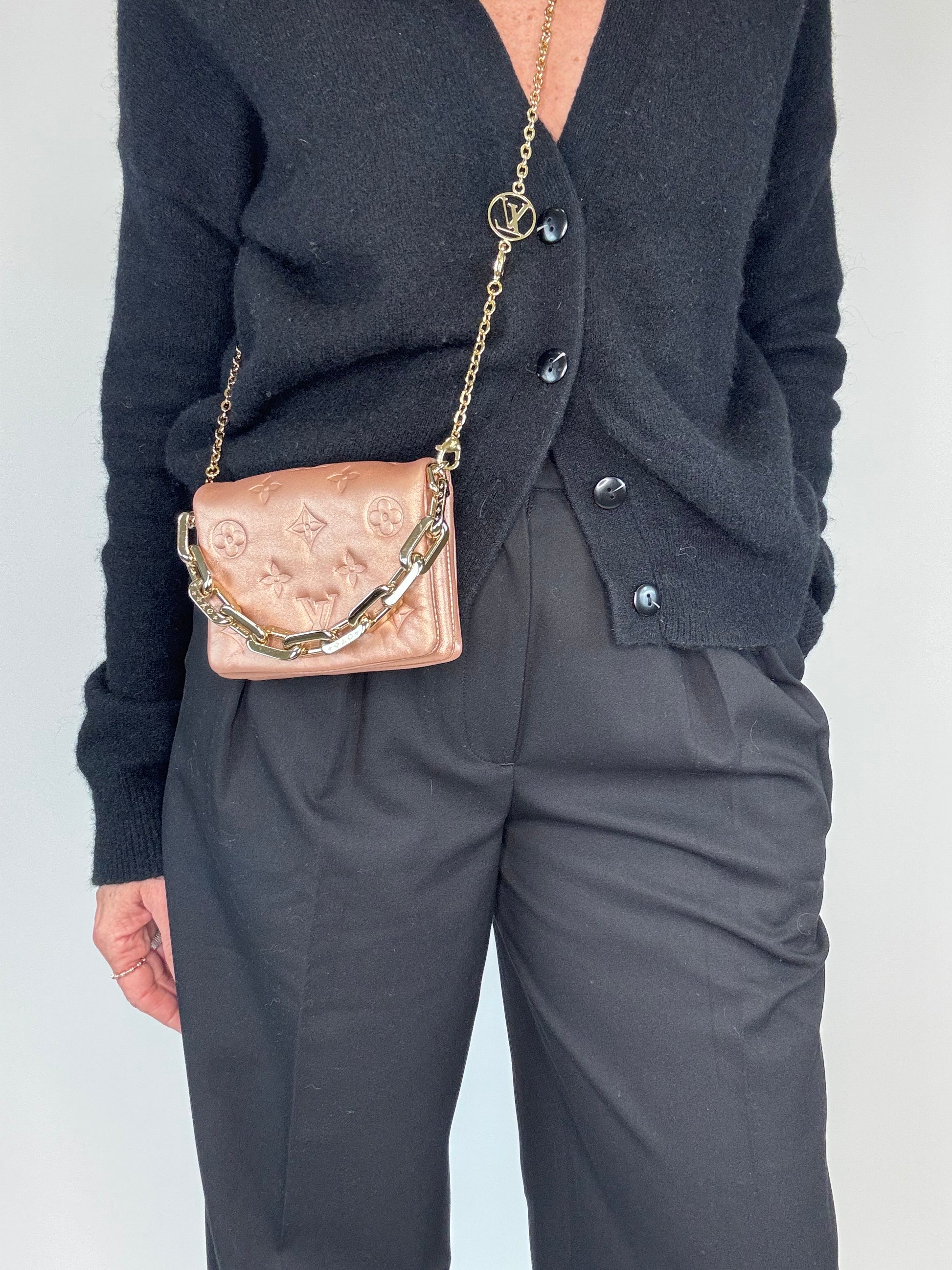 Small yet so versatile, wear as crossbody, shoulder bag, bracelet bag, and belt bag. In embossed monogram, crossbody chain is removable and adjustable. Style with casual or date night.