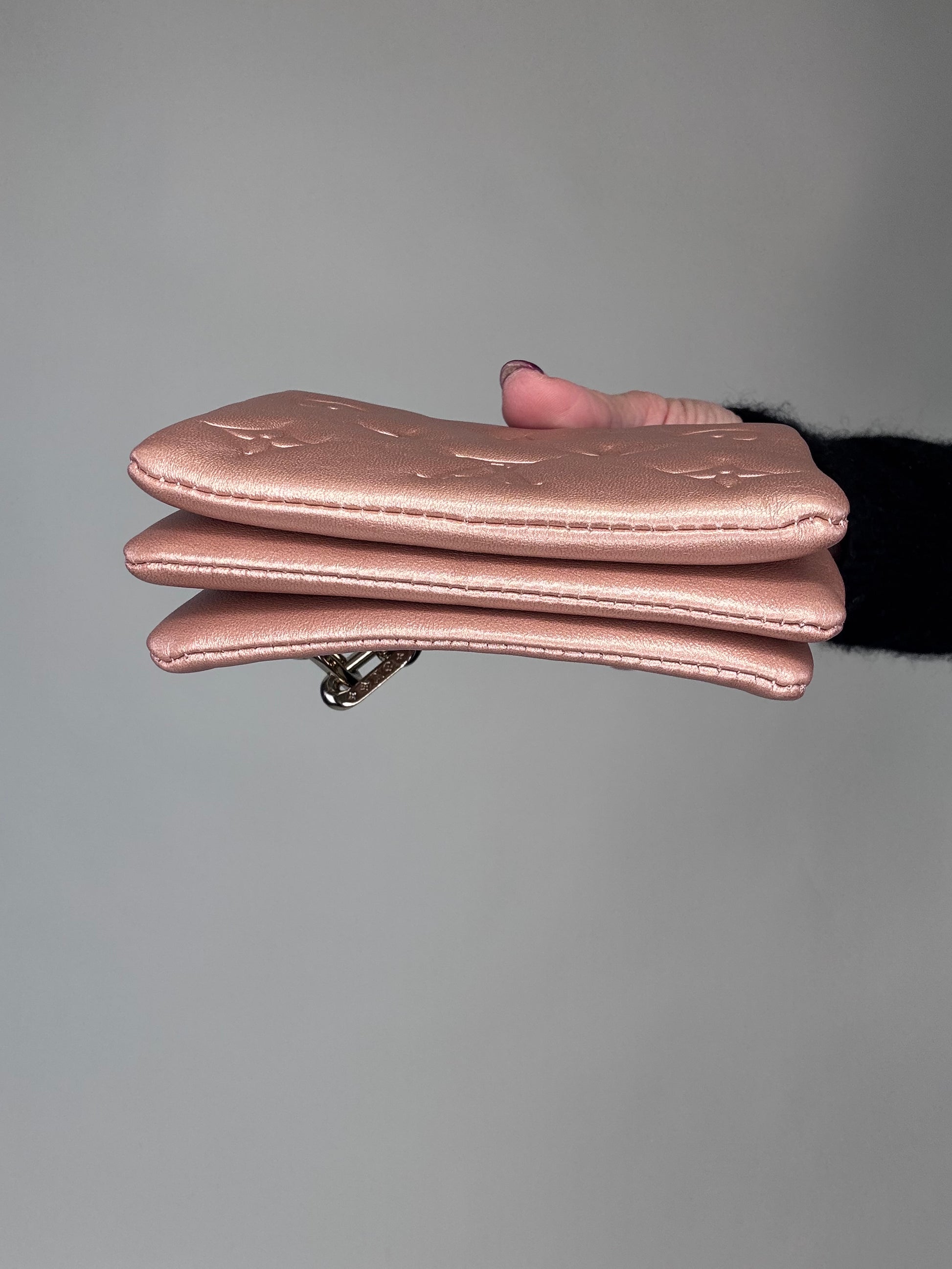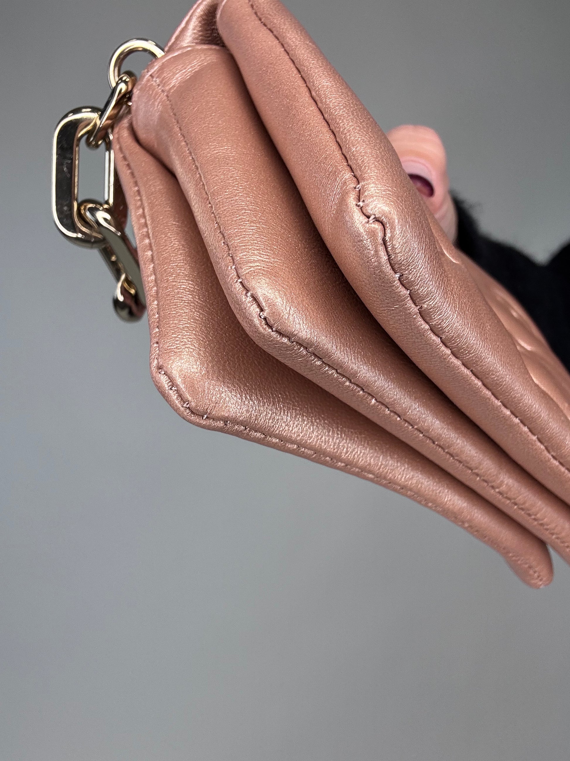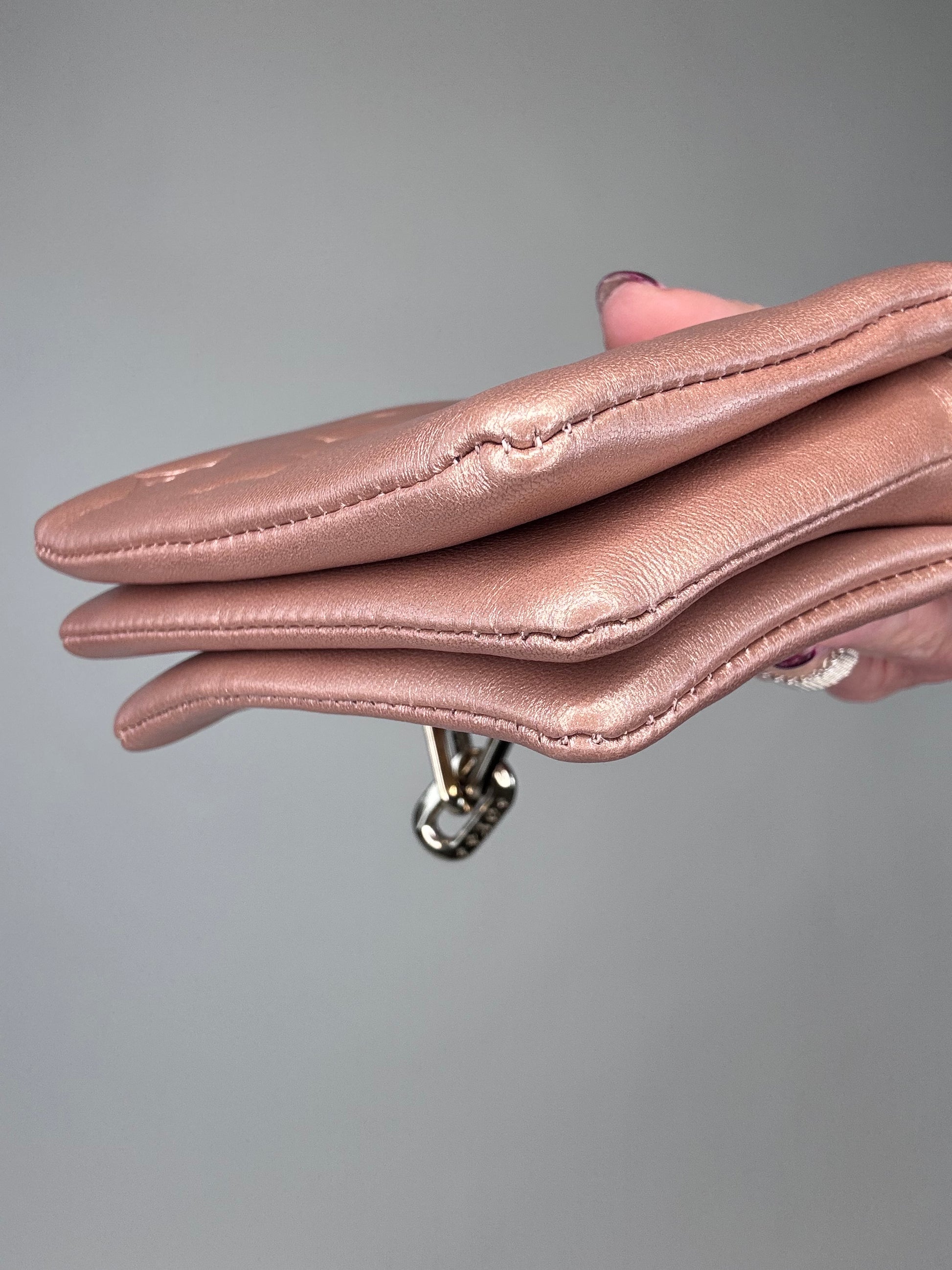 Small yet so versatile, wear as crossbody, shoulder bag, bracelet bag, and belt bag. In embossed monogram, crossbody chain is removable and adjustable. Style with casual or date night.