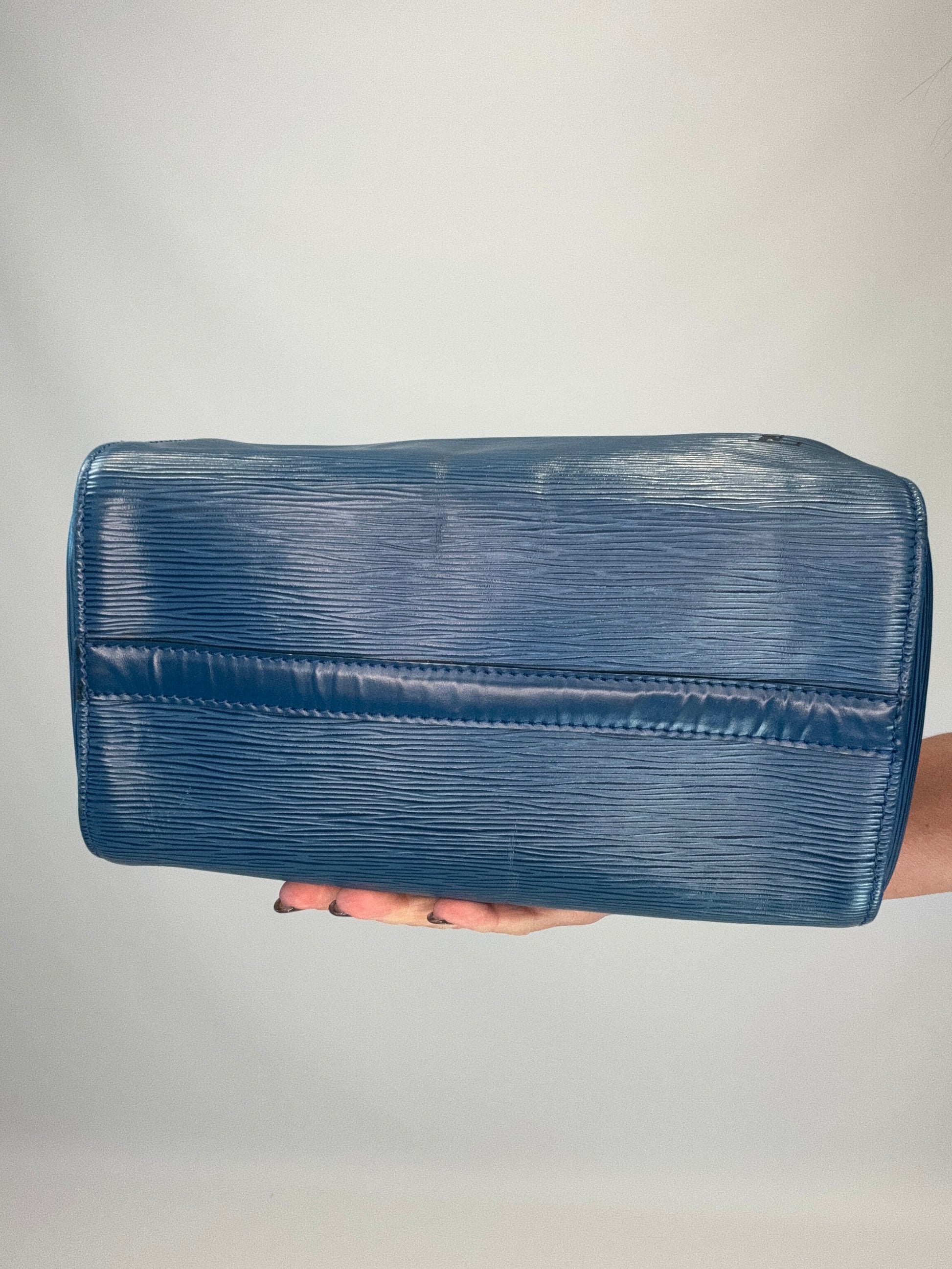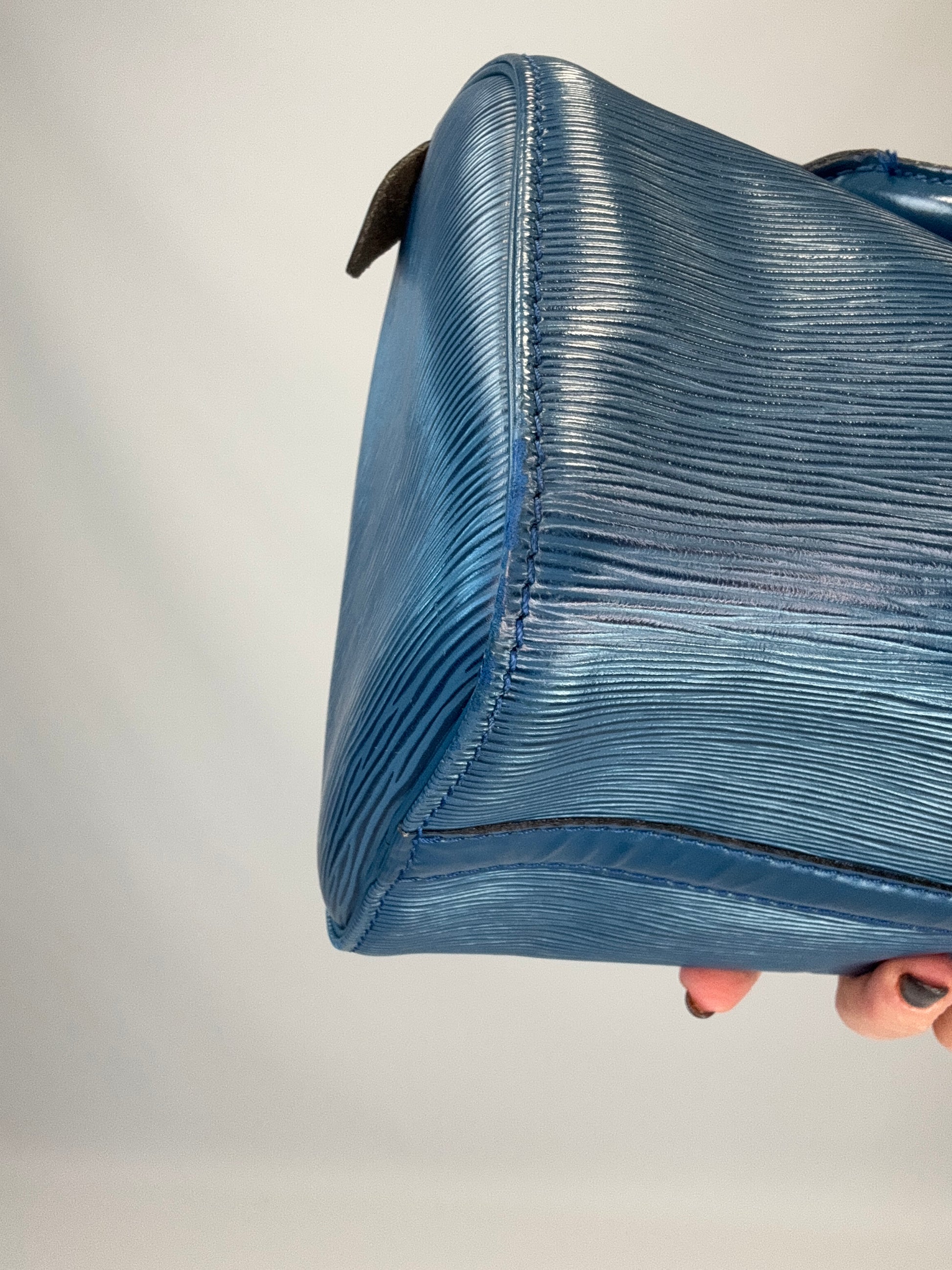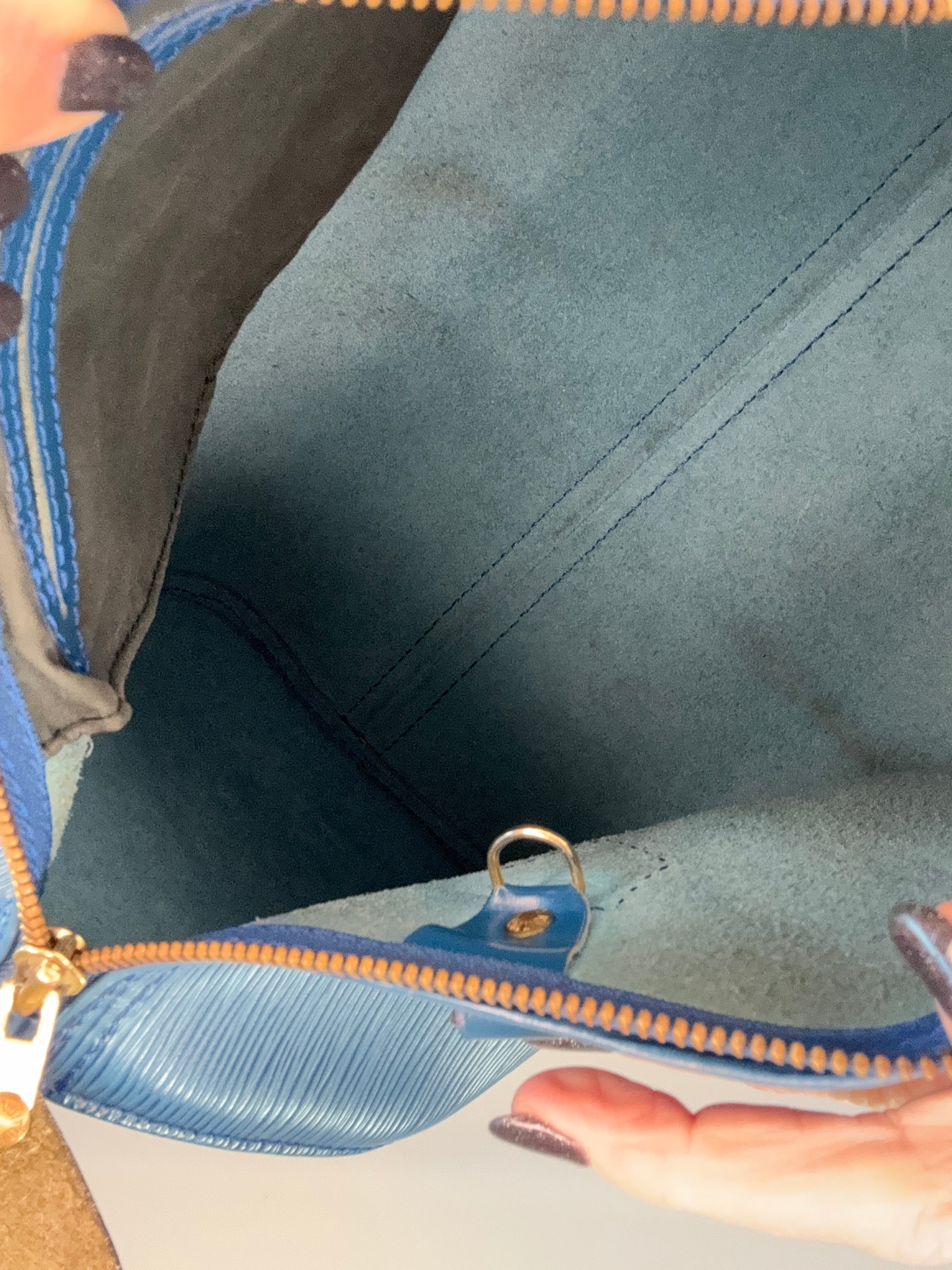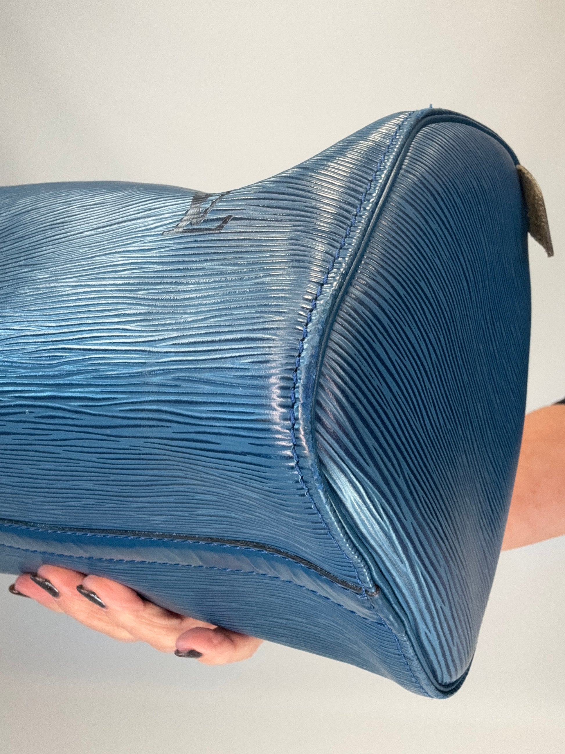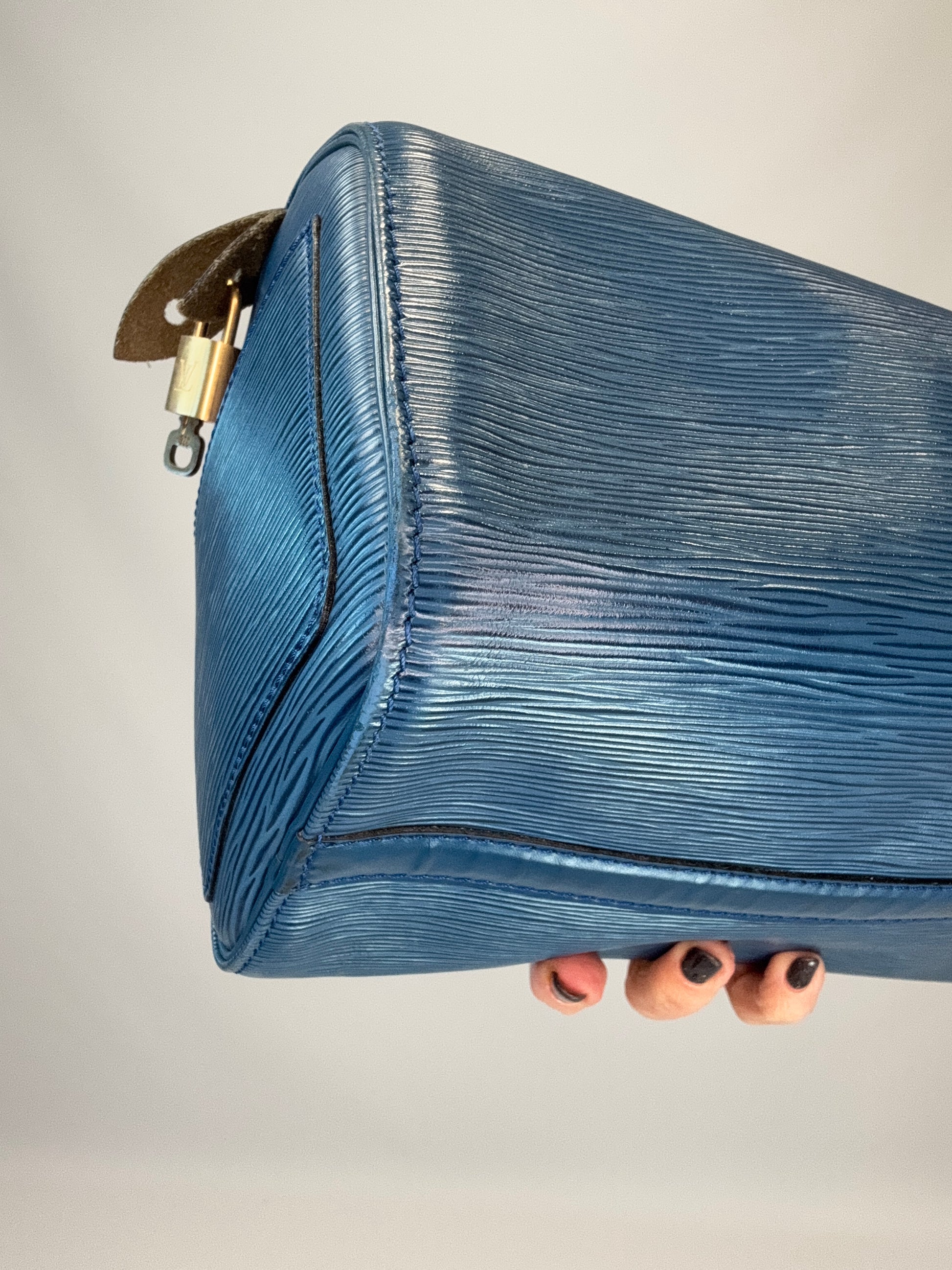This collector"s vintage speedy in Toledo blue is absolutely gorgeous and goes with all looks! The perfect bag for everyday or travel. Features their signature Epi leather and lock and key. This is a beautiful classic.