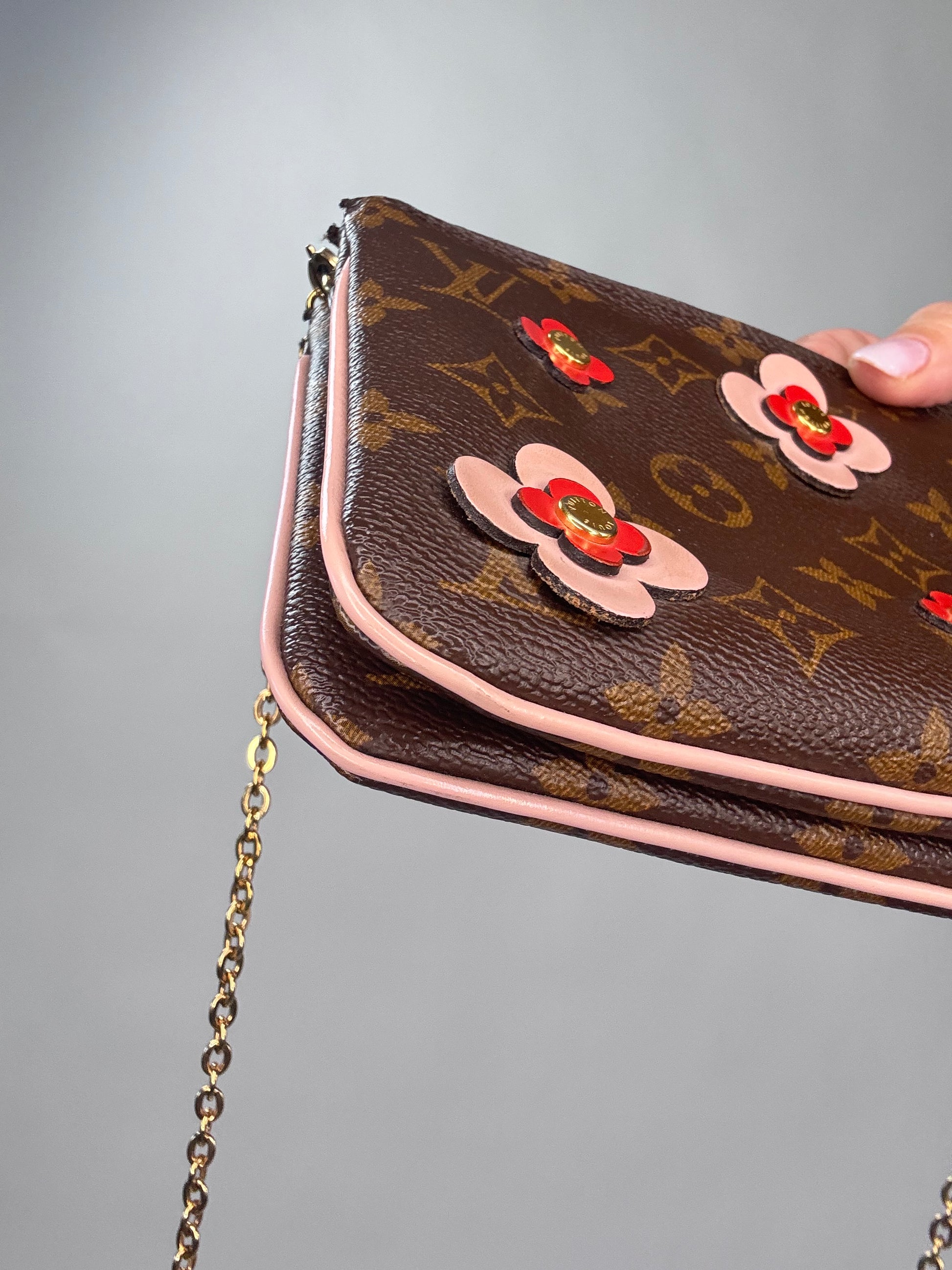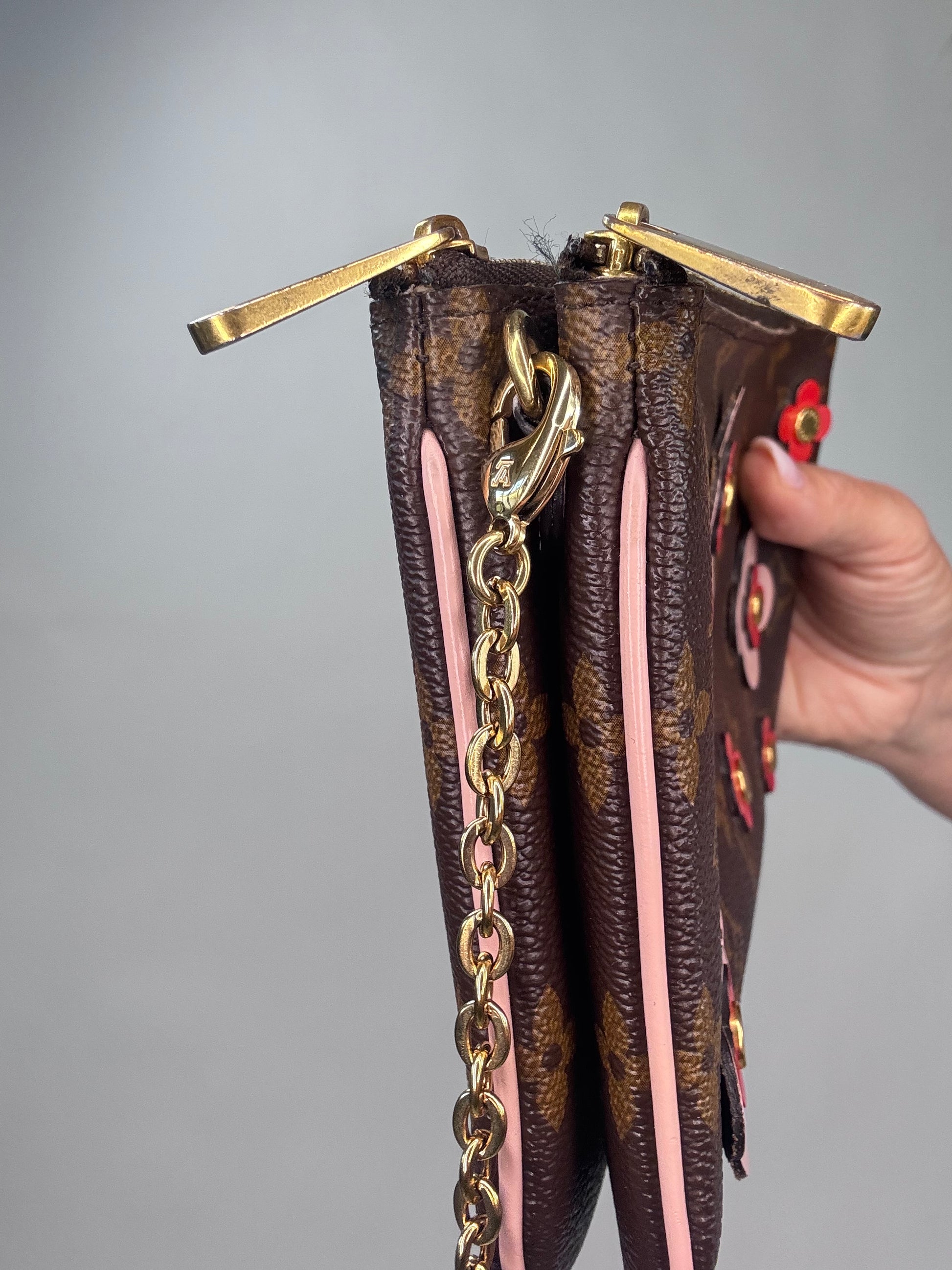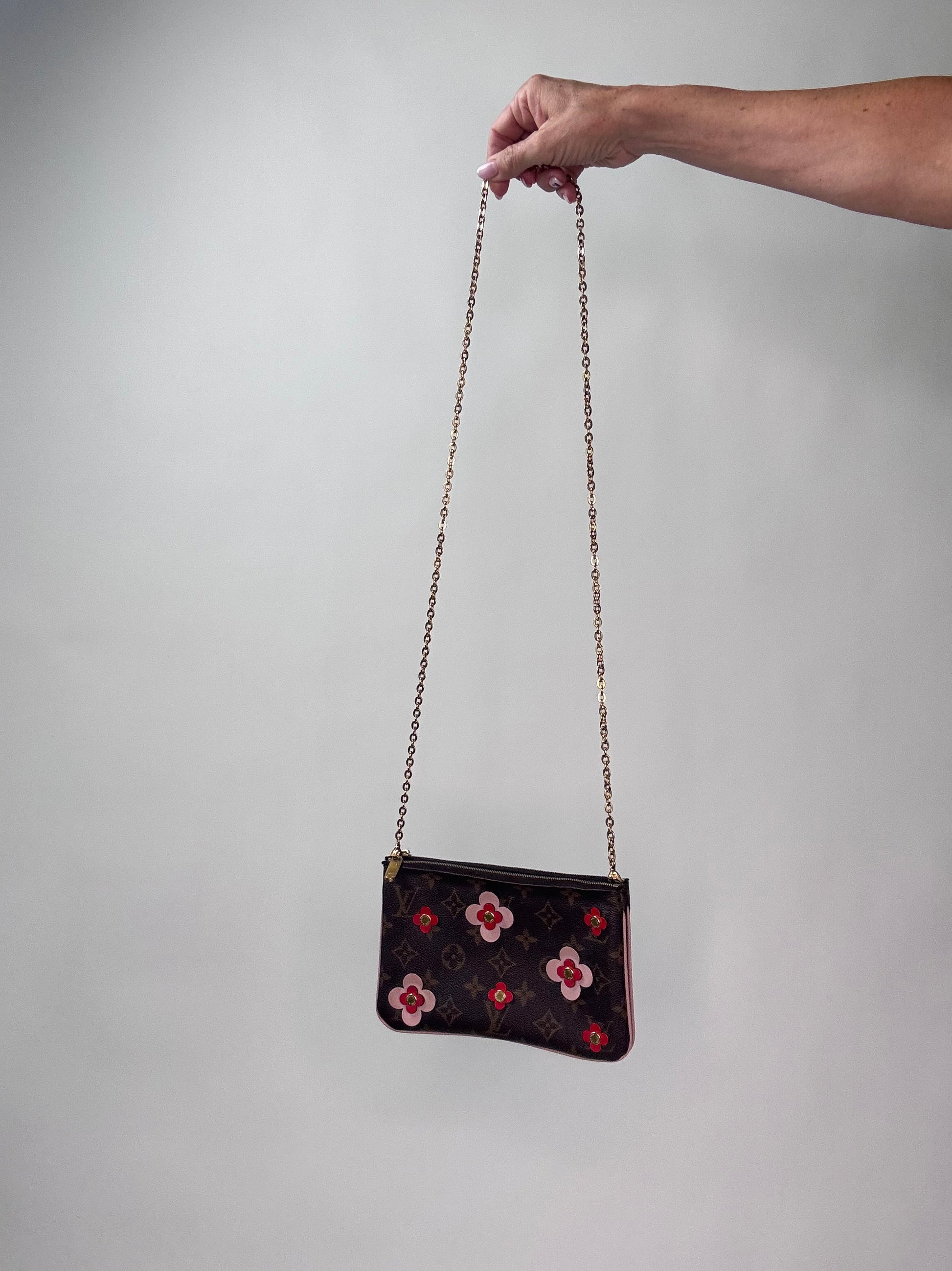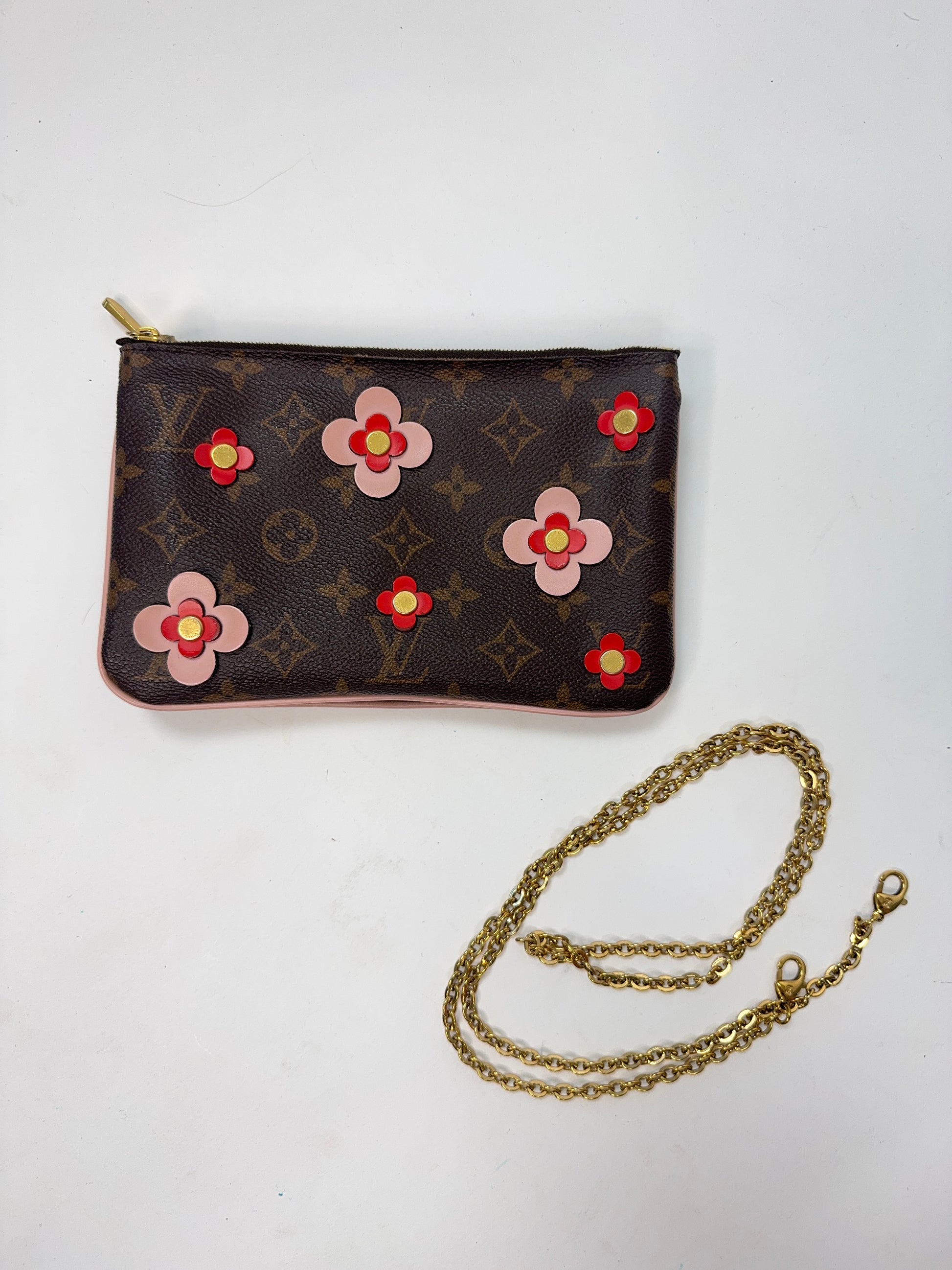 Enjoy this preowned Louis Vuitton Monogram Canvas Pochette with Blooming Flowers. This fun handbag with double sides each with its zipper compartment makes this a roomy pochette. Designed in the monogram canvas with the floral design on one side and pink leather trim and pink microfiber interior, this pochette also features a removable gold chain strap. Wear as shoulder bag, crossbody, or clutch.