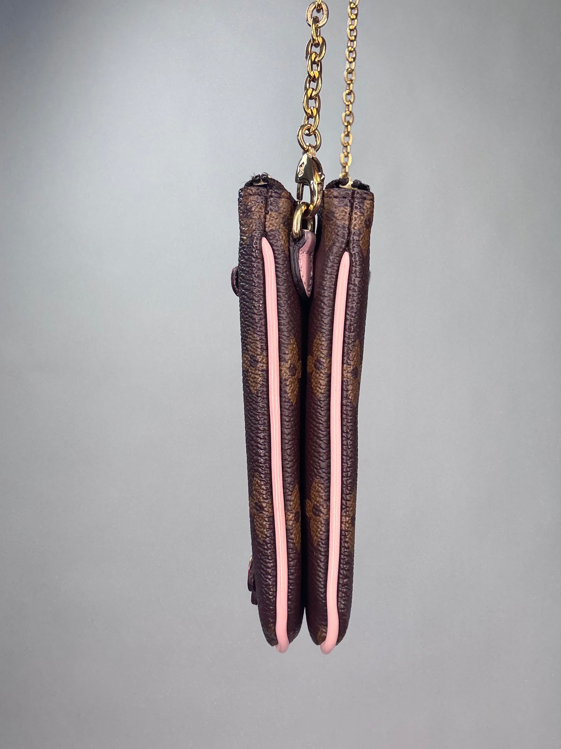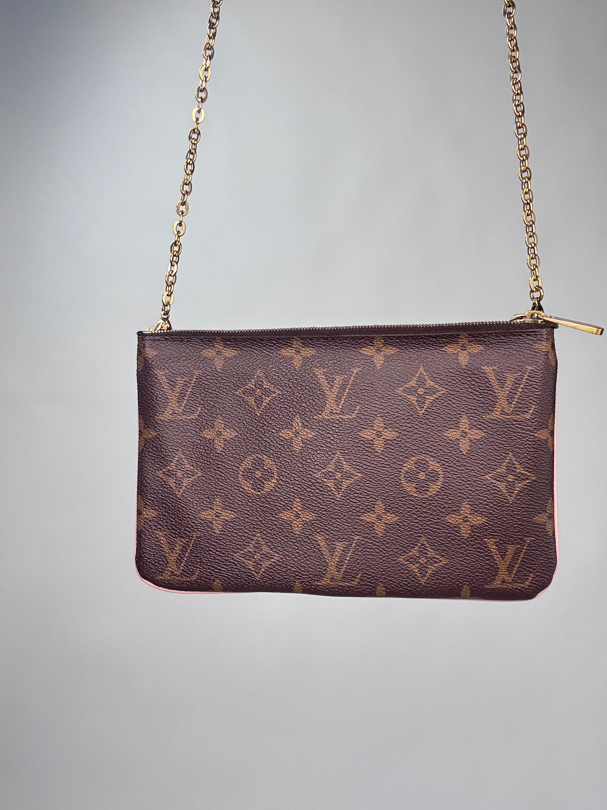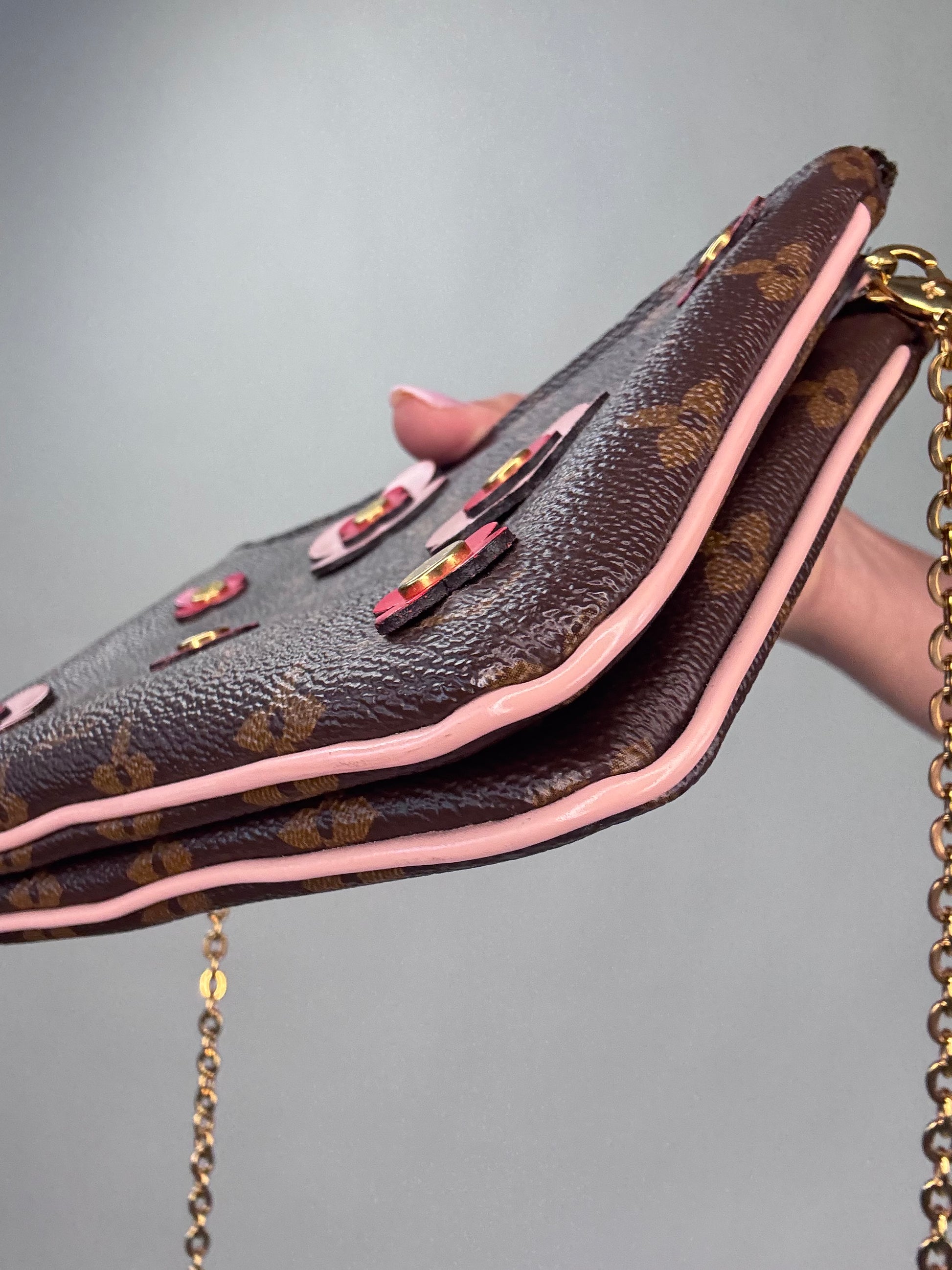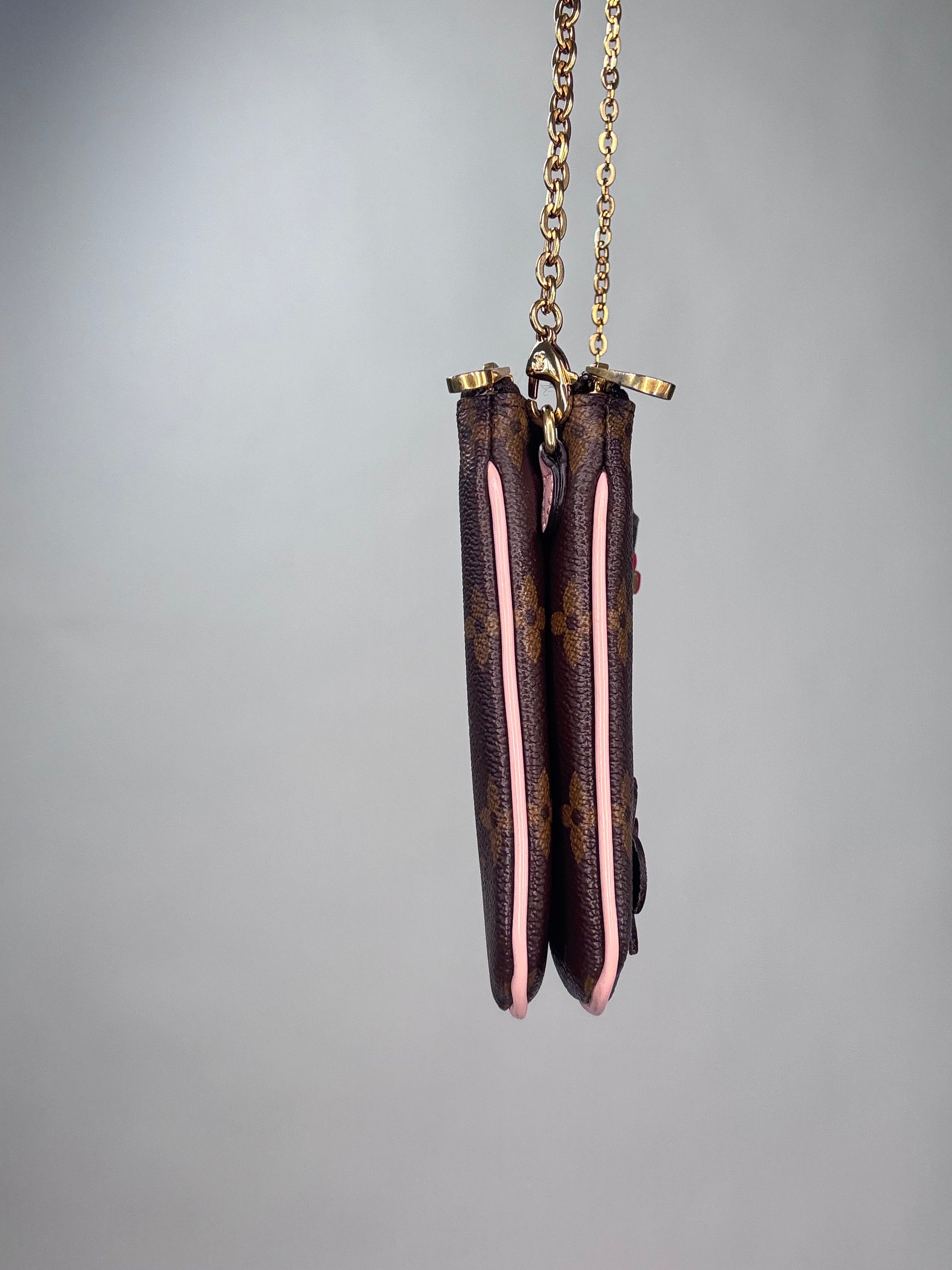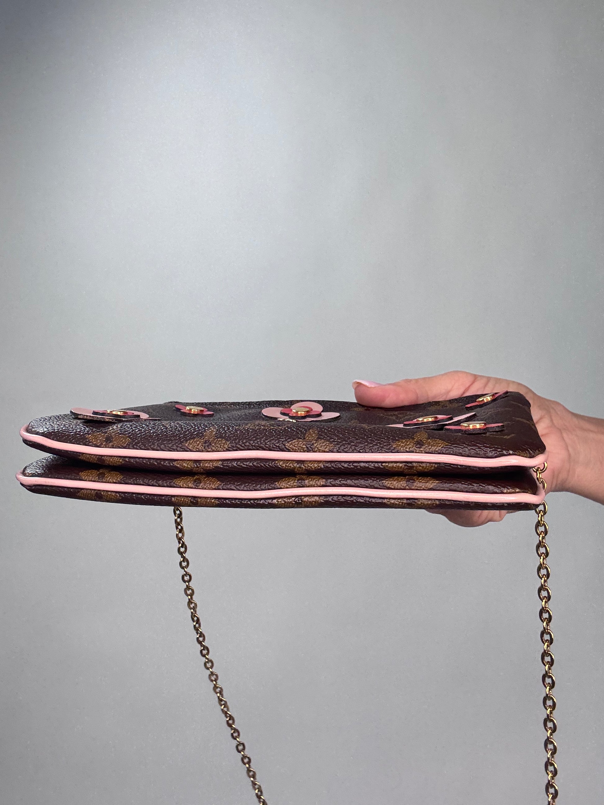 Enjoy this preowned Louis Vuitton Monogram Canvas Pochette with Blooming Flowers. This fun handbag with double sides each with its zipper compartment makes this a roomy pochette. Designed in the monogram canvas with the floral design on one side and pink leather trim and pink microfiber interior, this pochette also features a removable gold chain strap. Wear as shoulder bag, crossbody, or clutch.