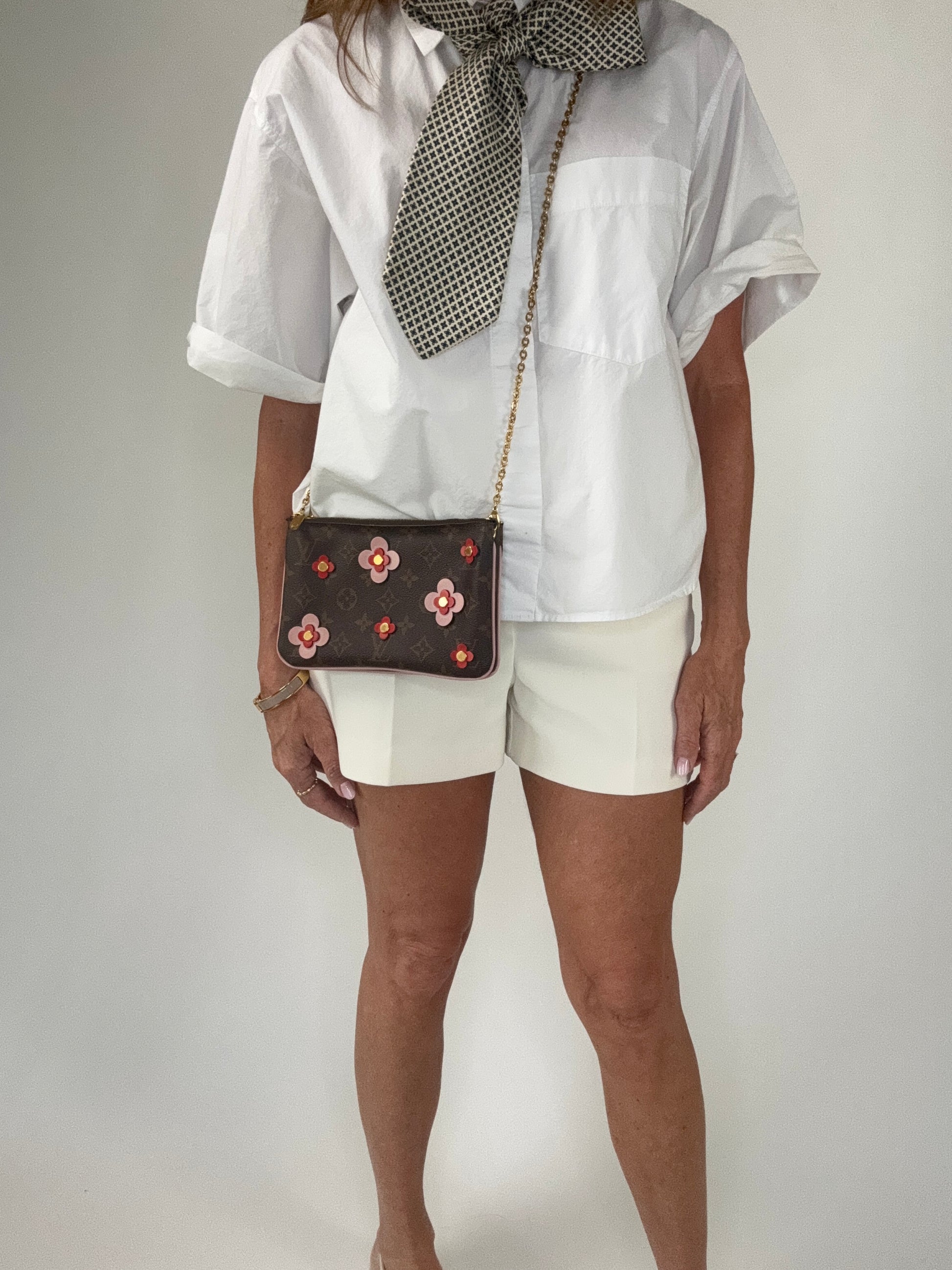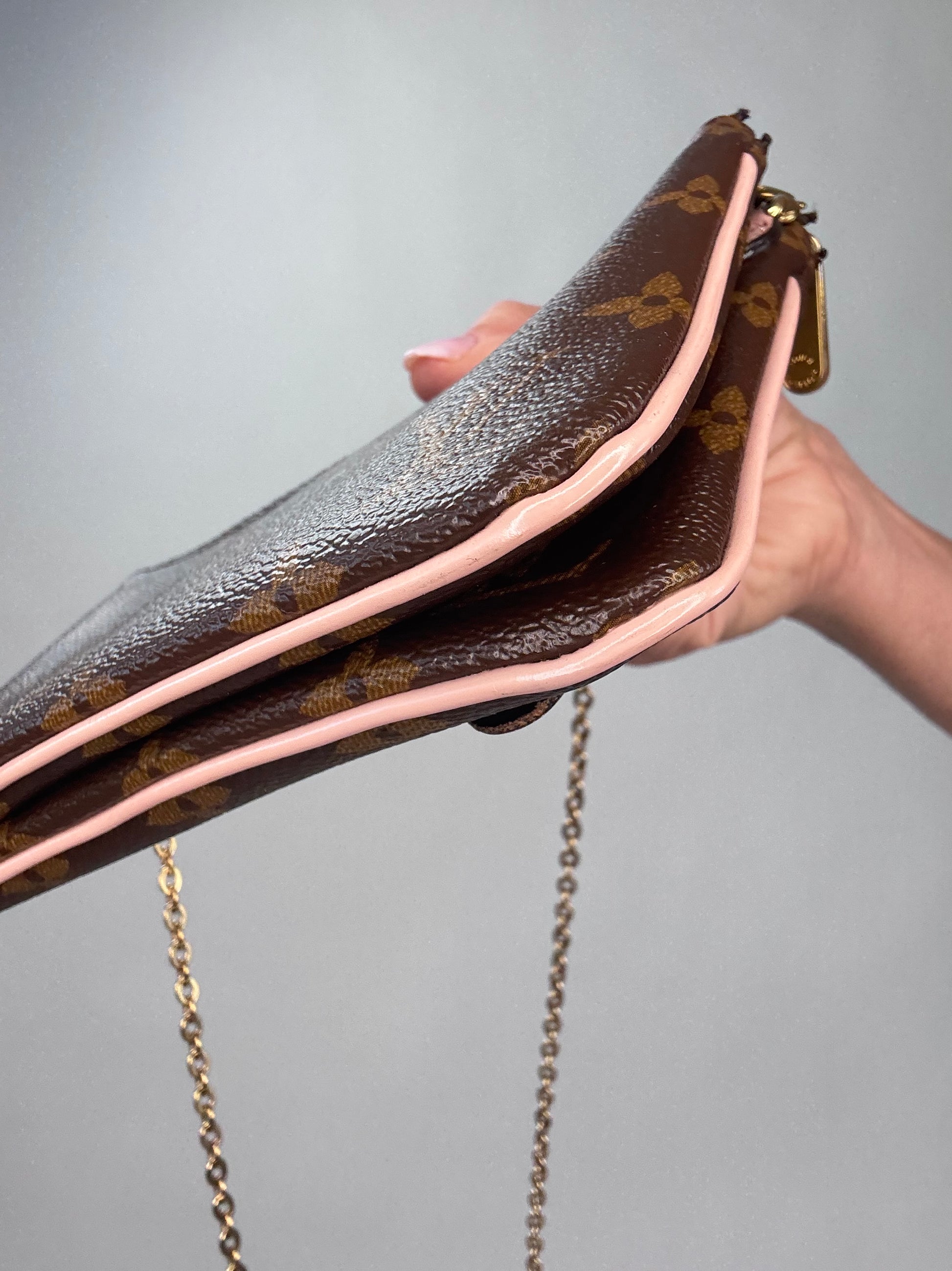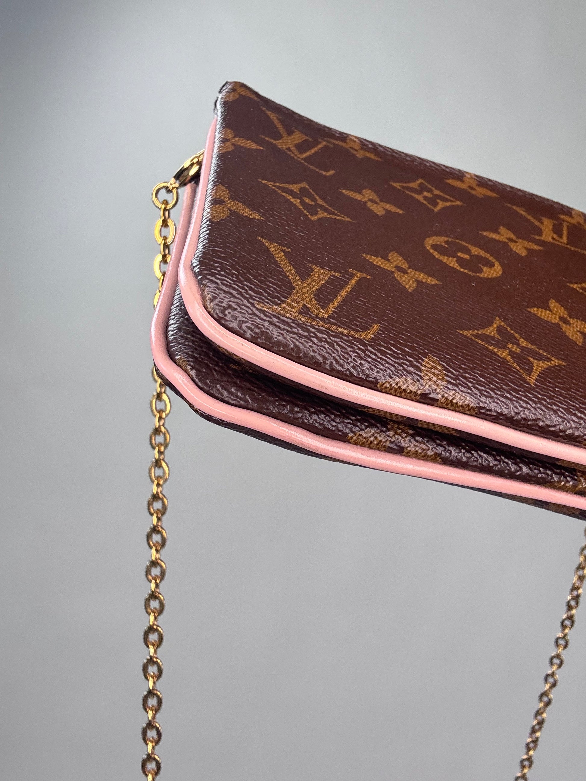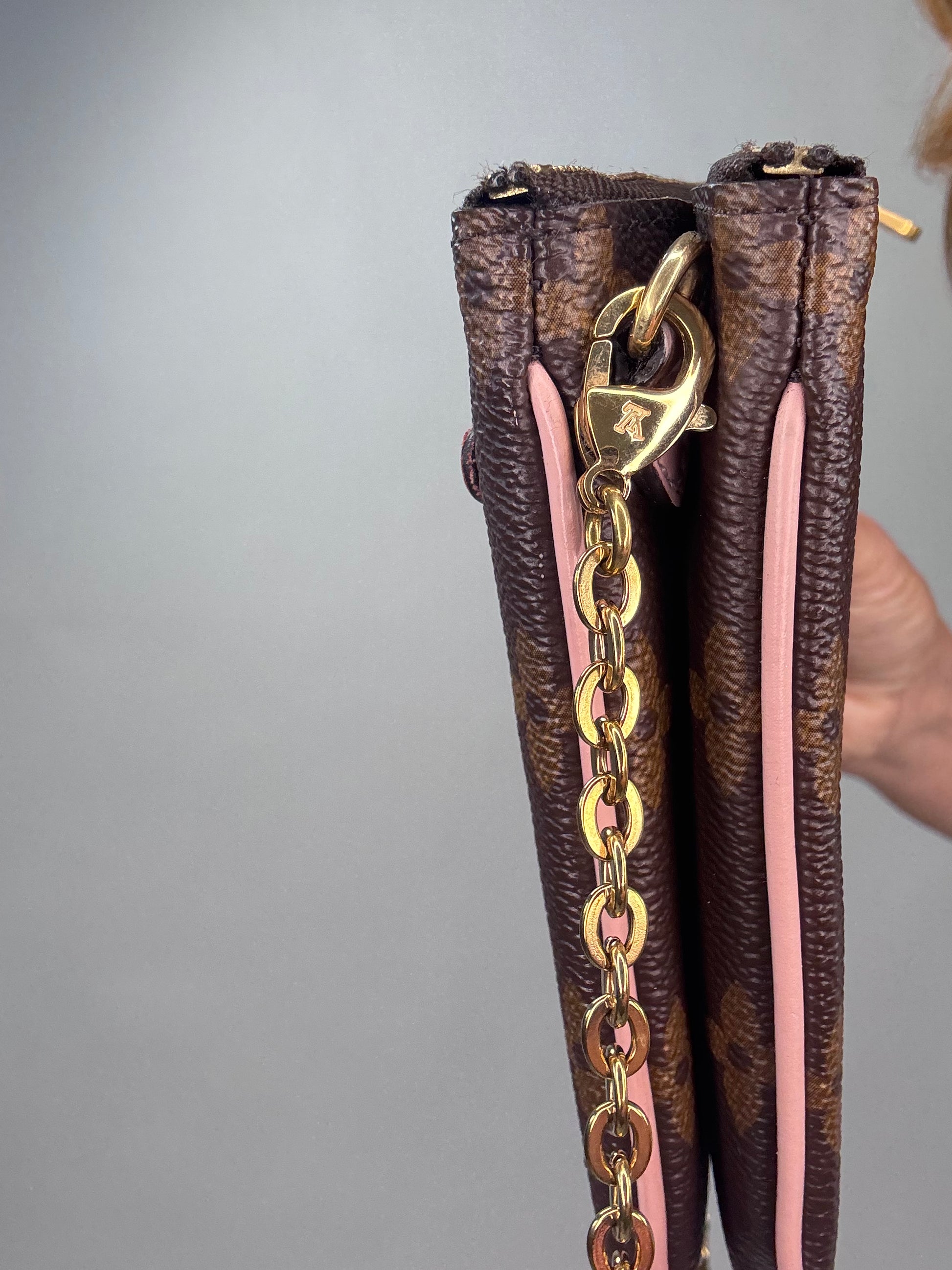 Enjoy this preowned Louis Vuitton Monogram Canvas Pochette with Blooming Flowers. This fun handbag with double sides each with its zipper compartment makes this a roomy pochette. Designed in the monogram canvas with the floral design on one side and pink leather trim and pink microfiber interior, this pochette also features a removable gold chain strap. Wear as shoulder bag, crossbody, or clutch.
