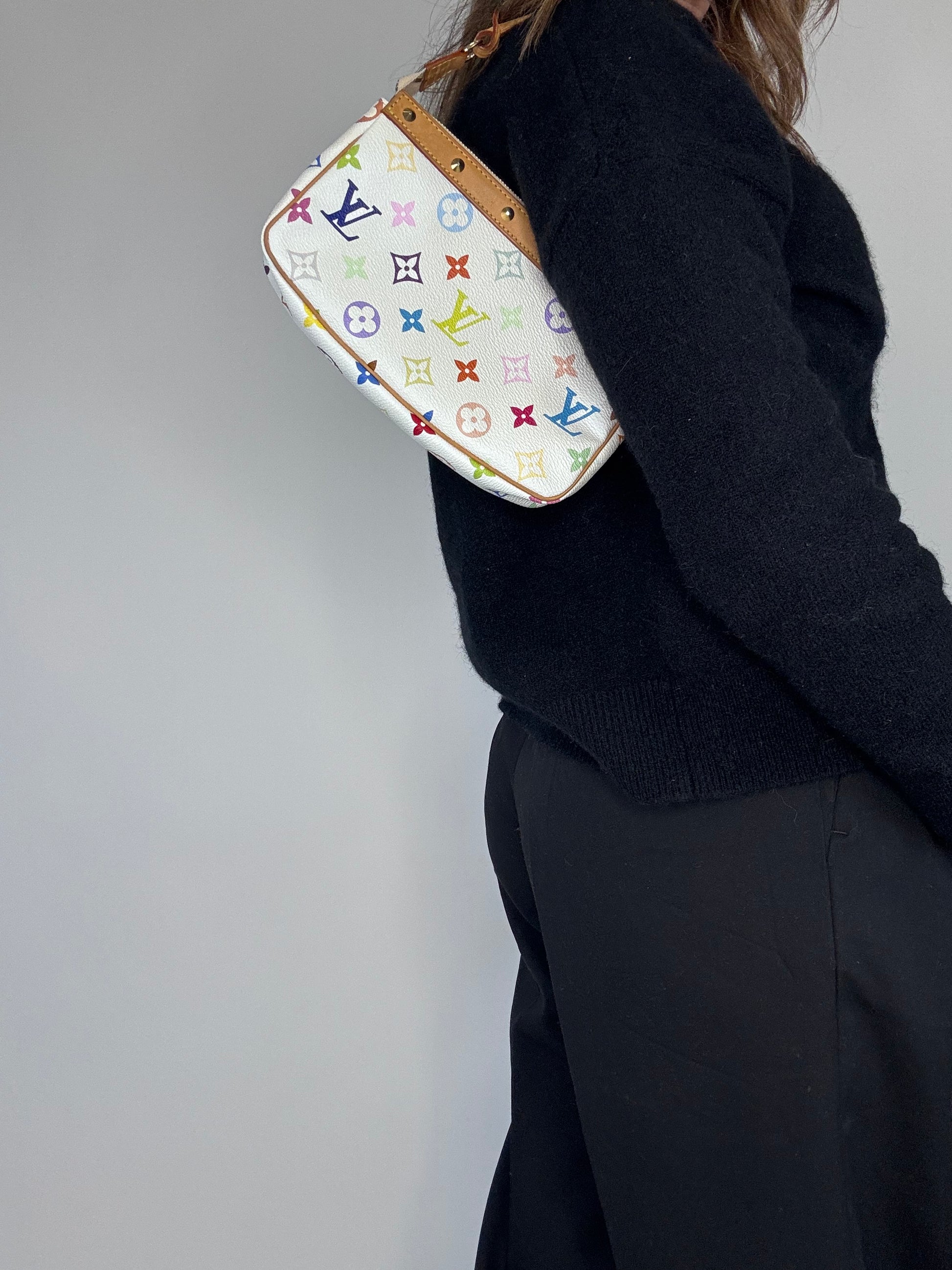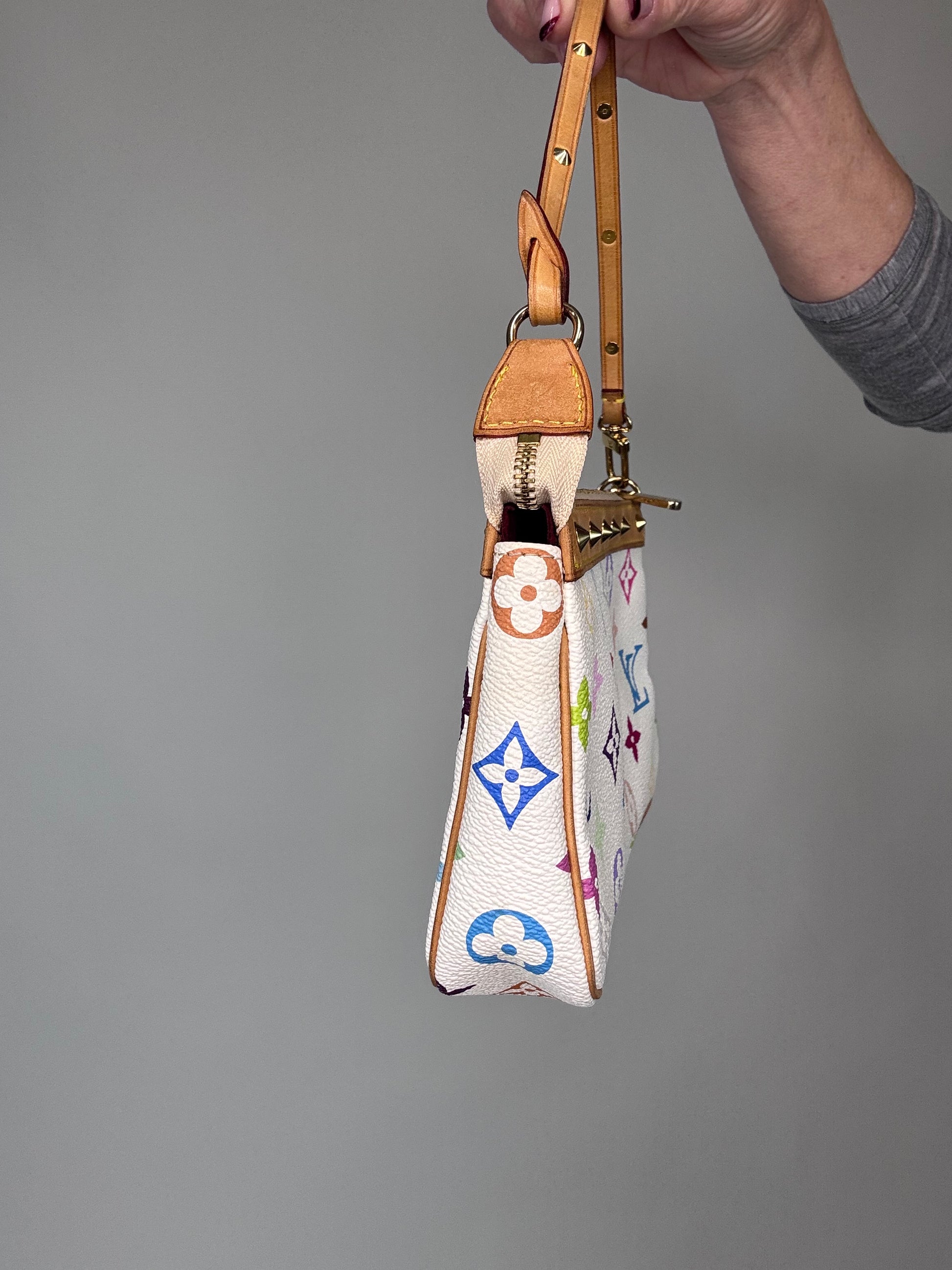 Multi color pochette in white styles with every look . Wear as a shoulder, wristlet or add a longer strap for crossbody. This is the perfect style bag fits all your small essentials.