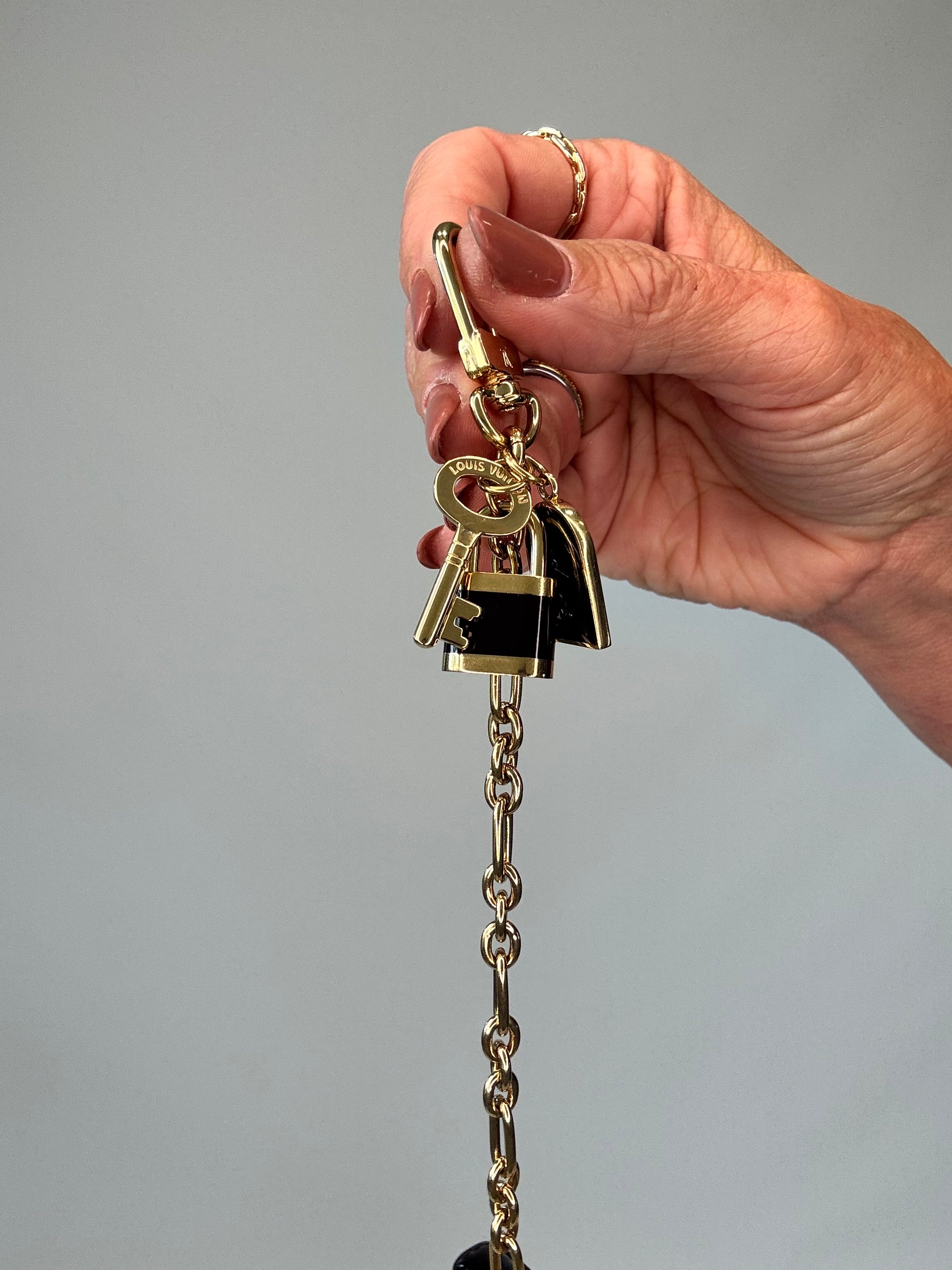 Preowned and adorable vernis bag charm, key chain , or attach it to the inside of your bag!! Features gold hardware, with added lock/key and loco charms.