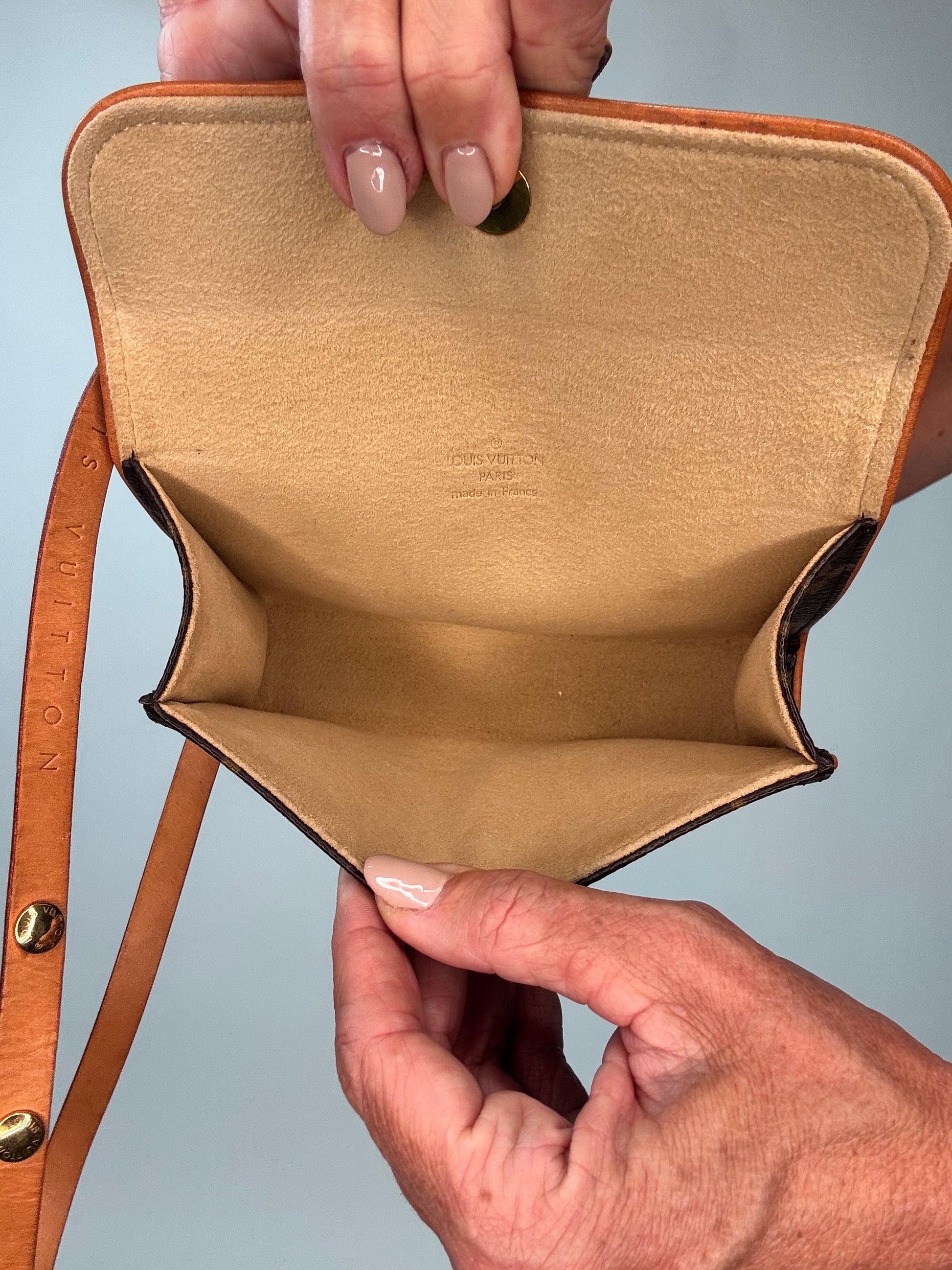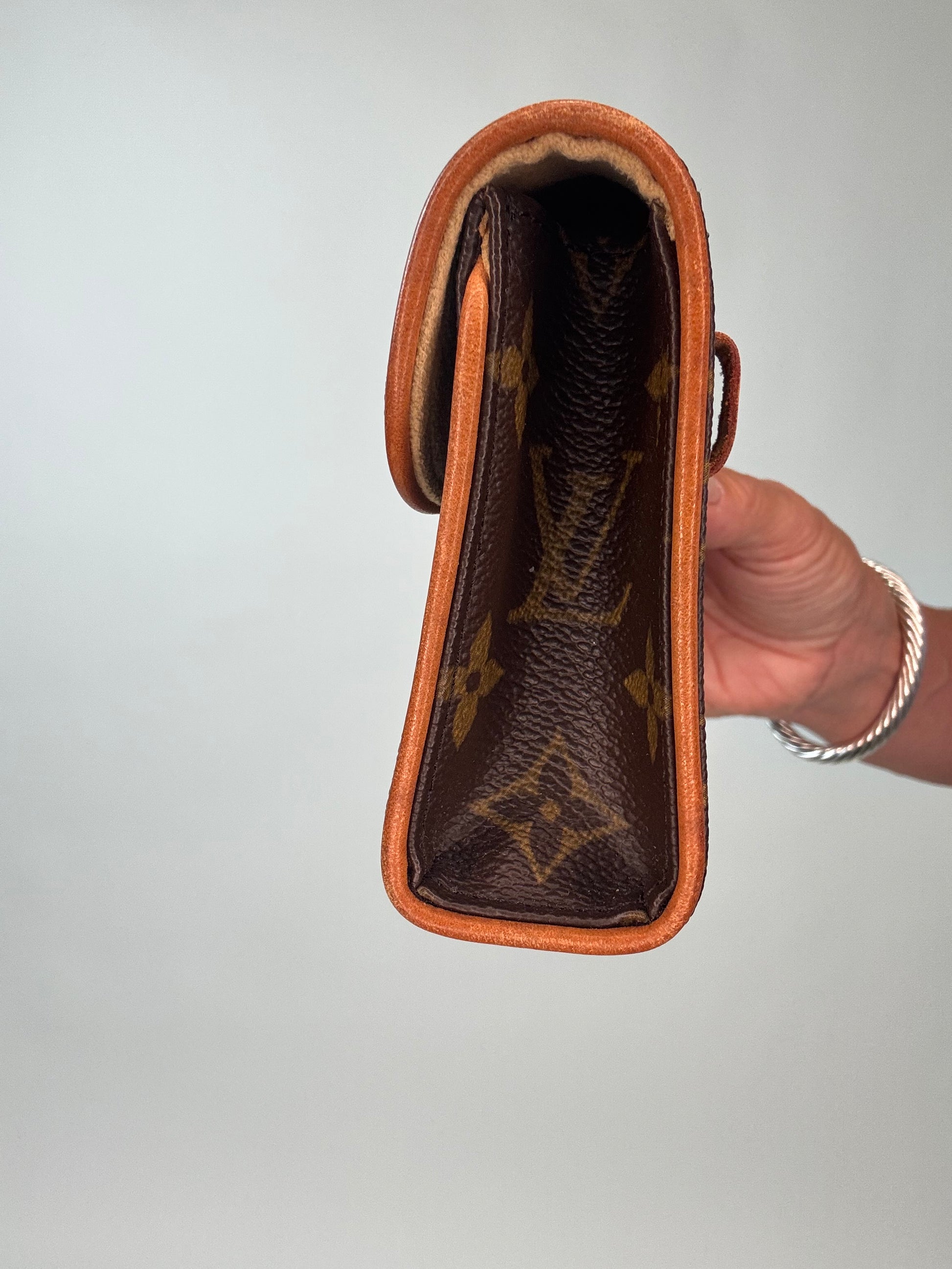 This authentic preowned Louis Vuitton Monogram Pochette Florentine S is designed to be worn as a belt bag. Crafted in the signature monogram canvas with vachetta leather and gold hardware, this versatile handbag can also be worn as a crossbody or shoulder bag. The beige microfiber interior is just the right size for your phone and a few essentials.