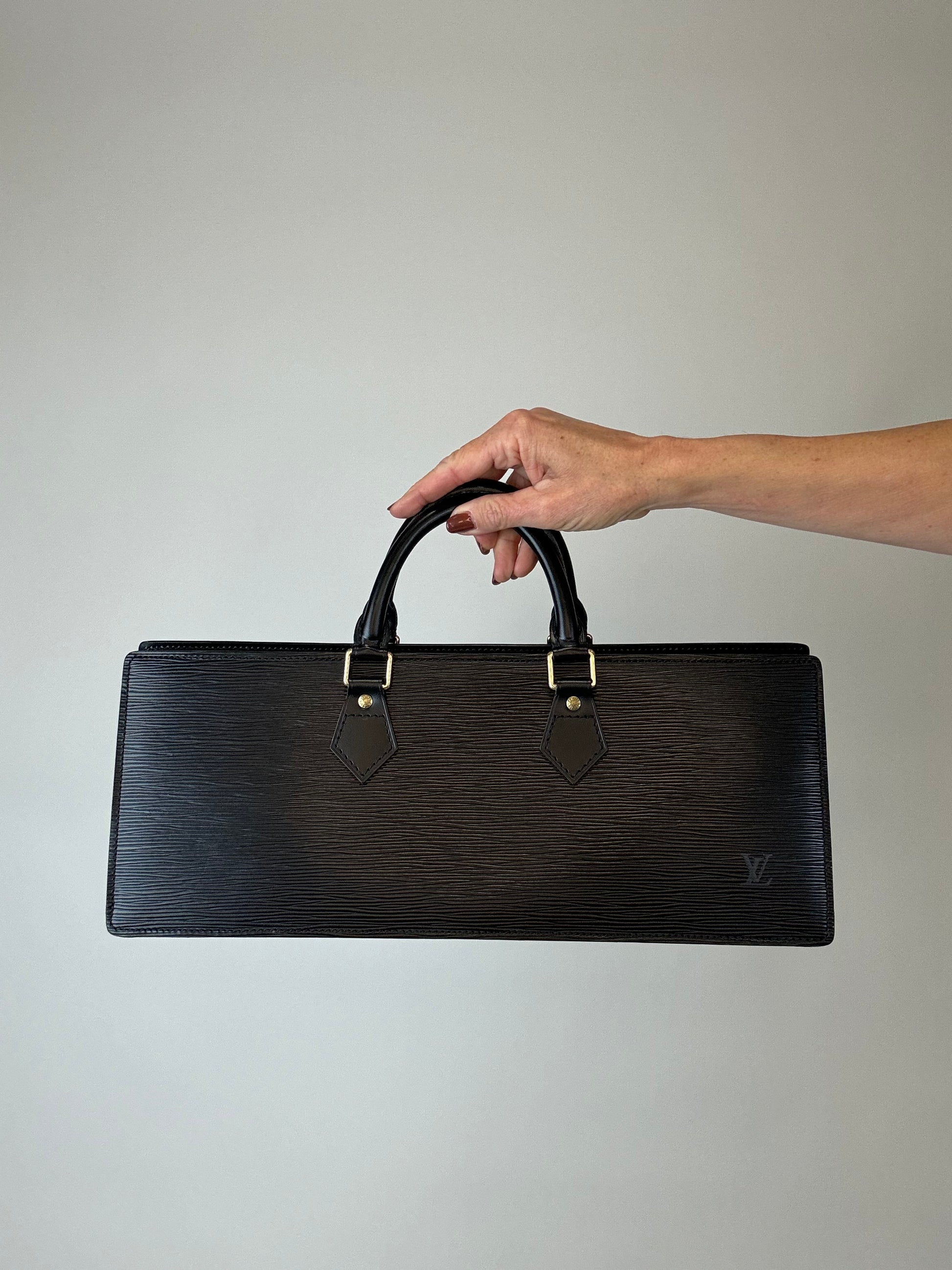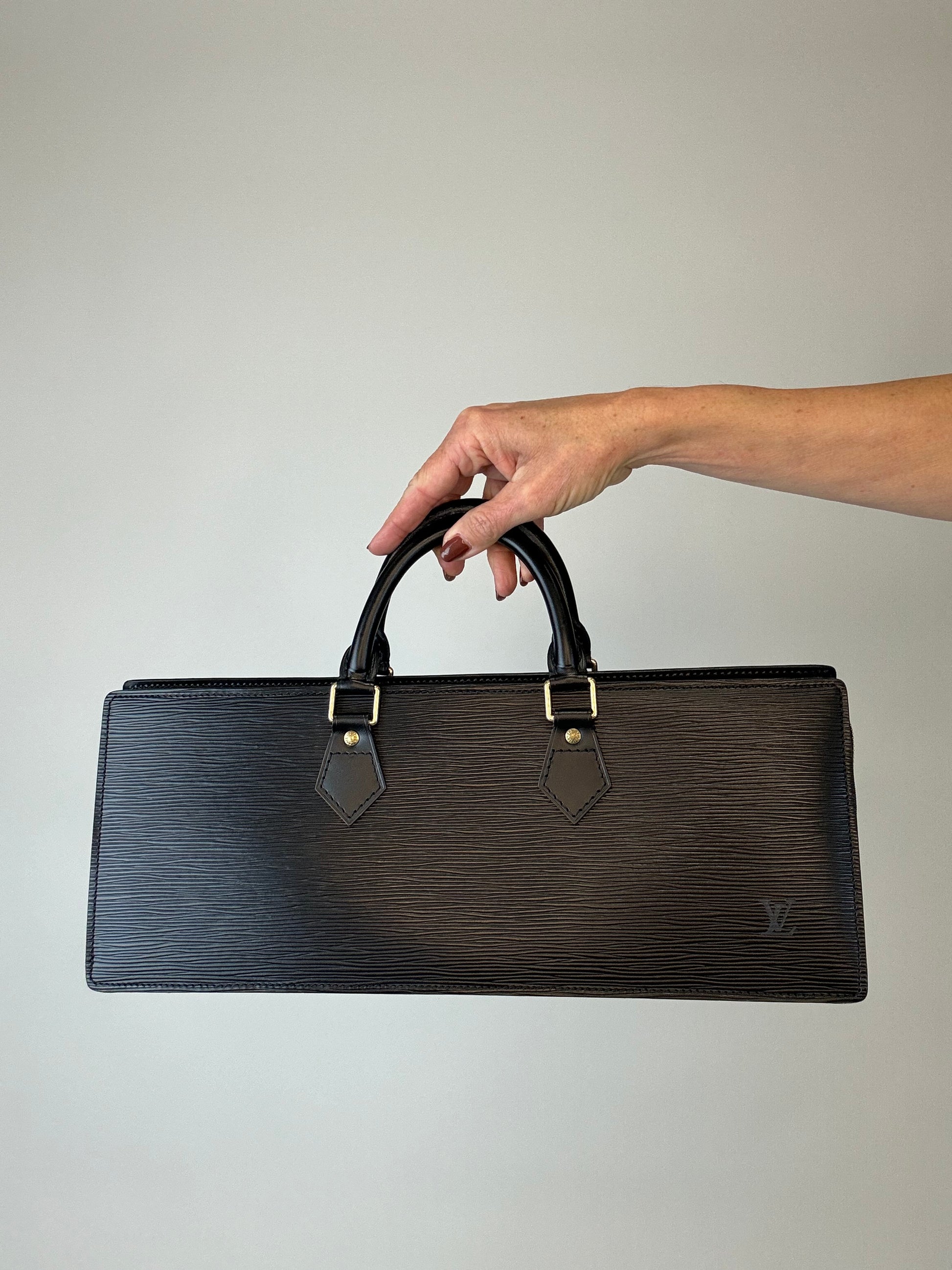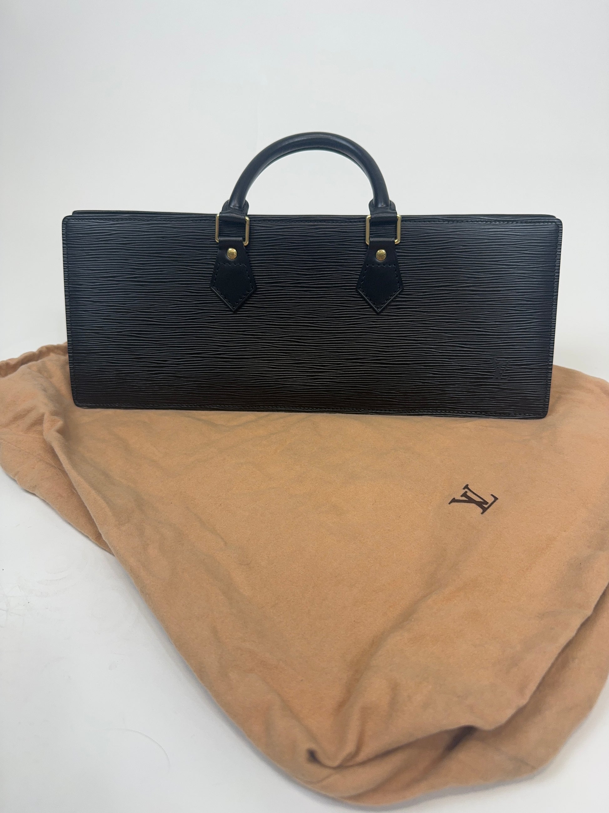 Black Epi Triangle Sac Rare East to West bag, this is a vibe for sure! Fits all your everyday goodies and more, features a large side pocket , and dust bag for storage.