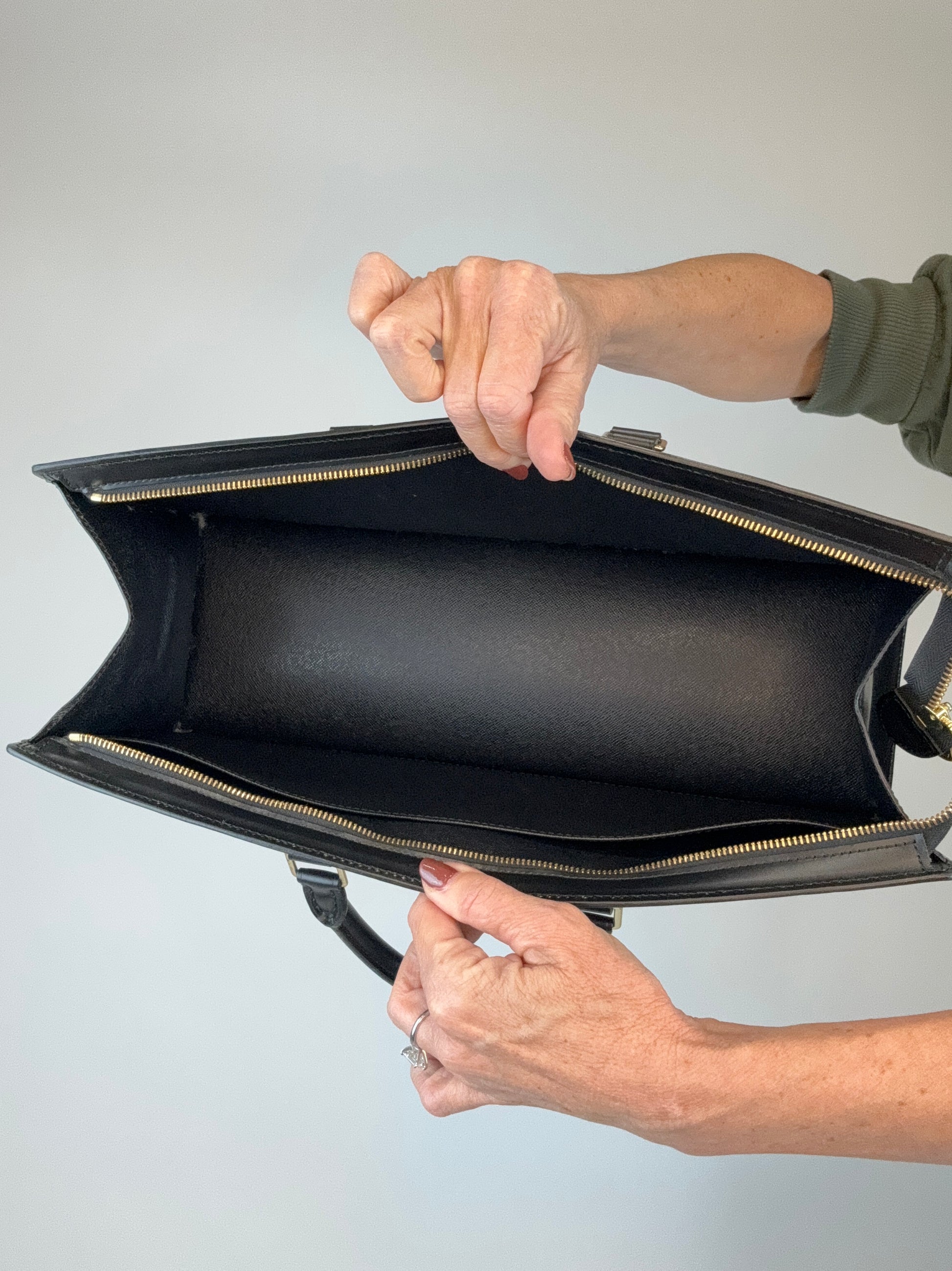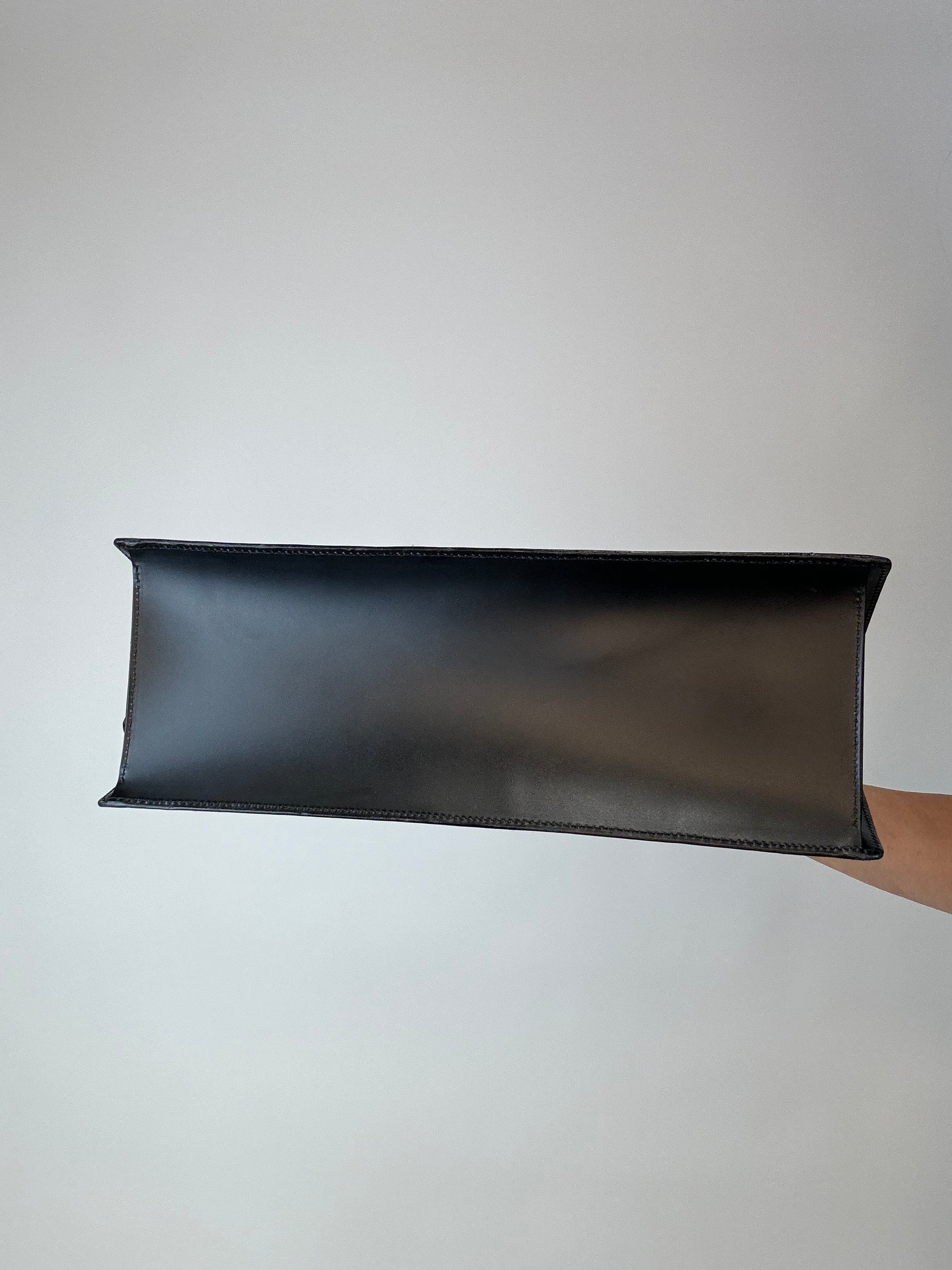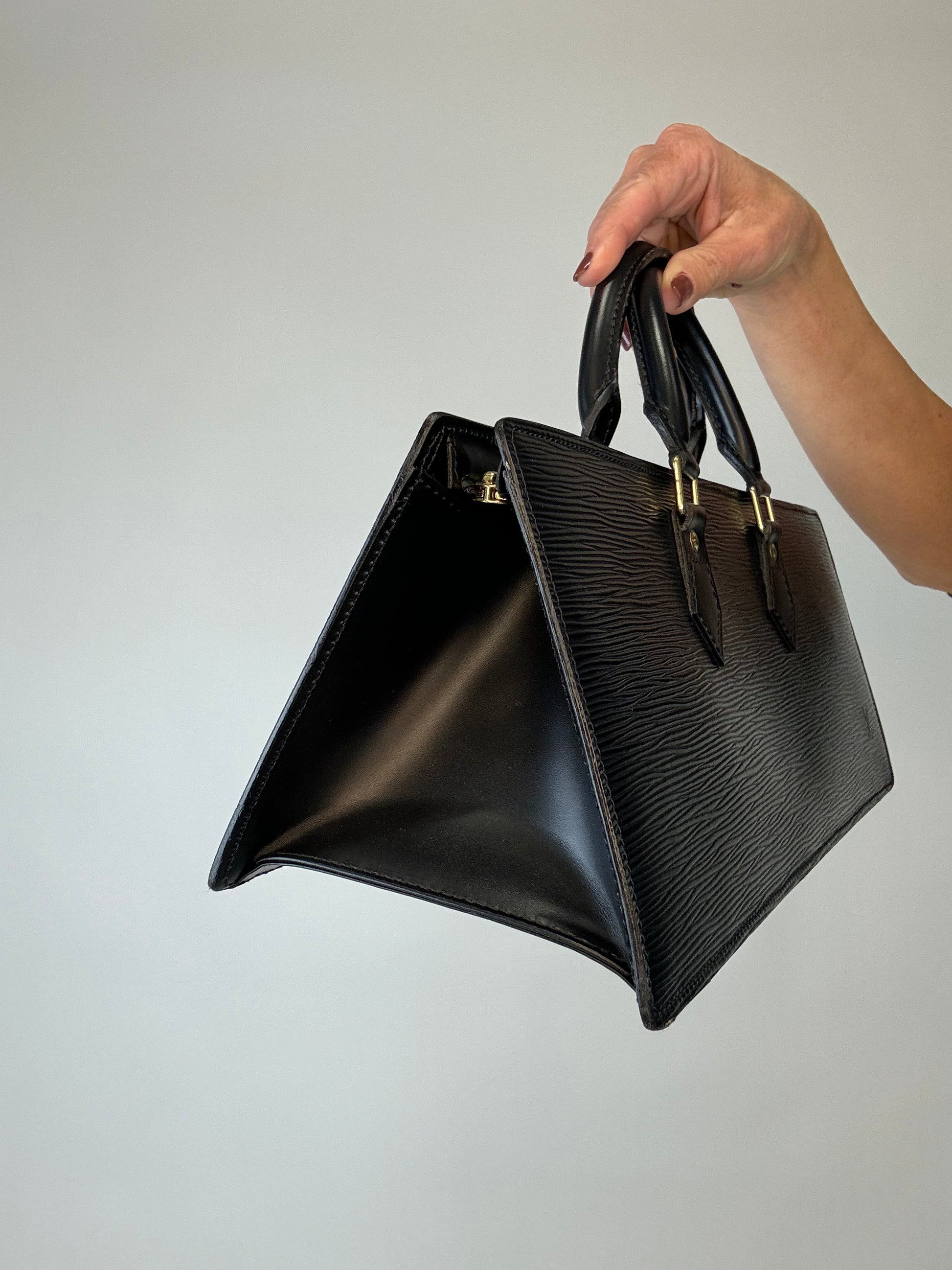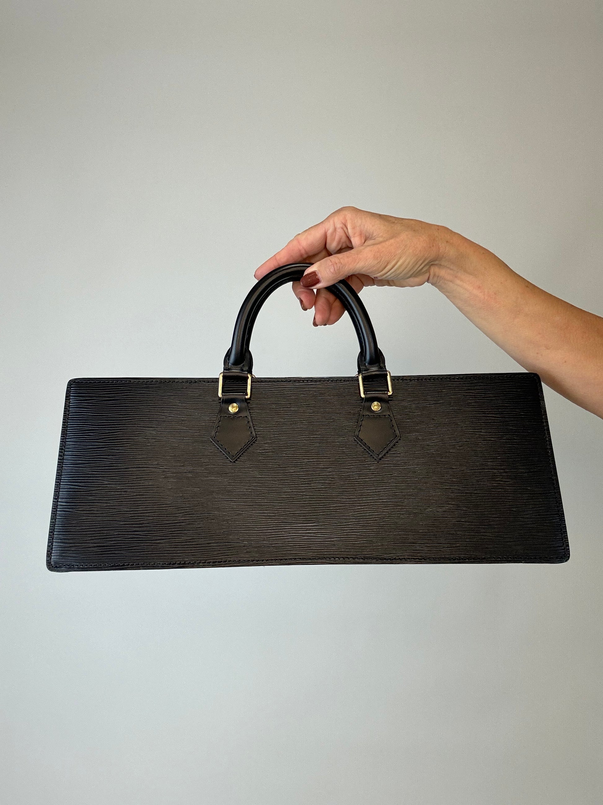 Black Epi Triangle Sac Rare East to West bag, this is a vibe for sure! Fits all your everyday goodies and more, features a large side pocket , and dust bag for storage.