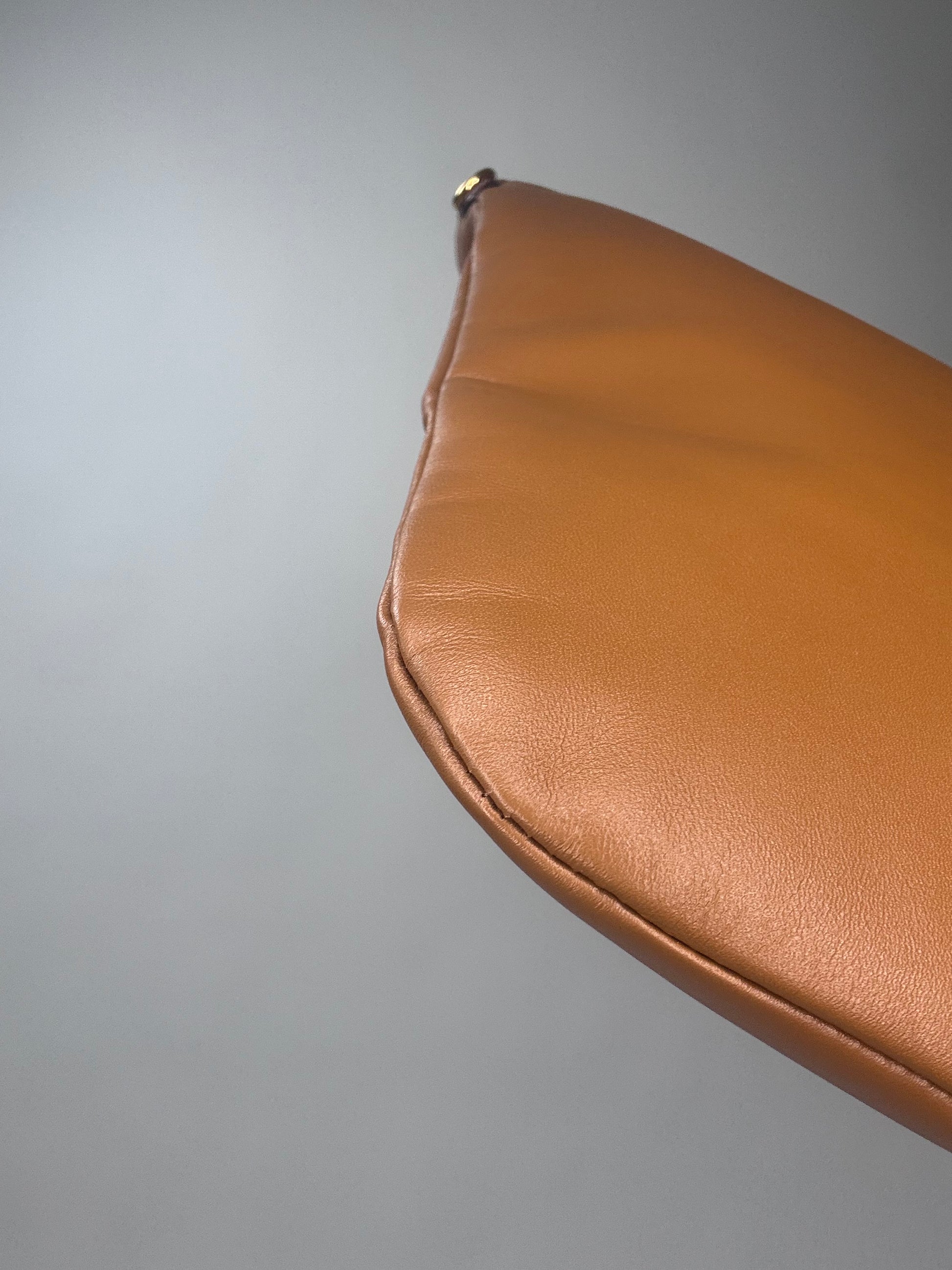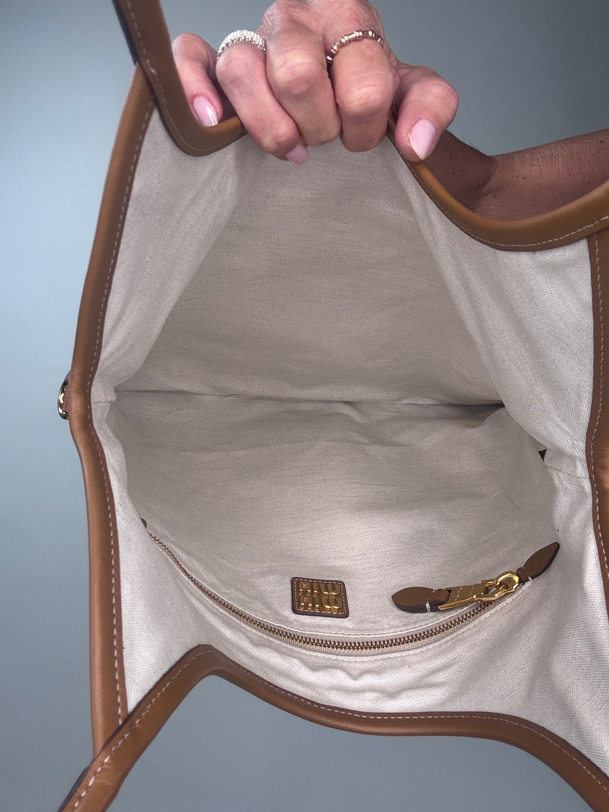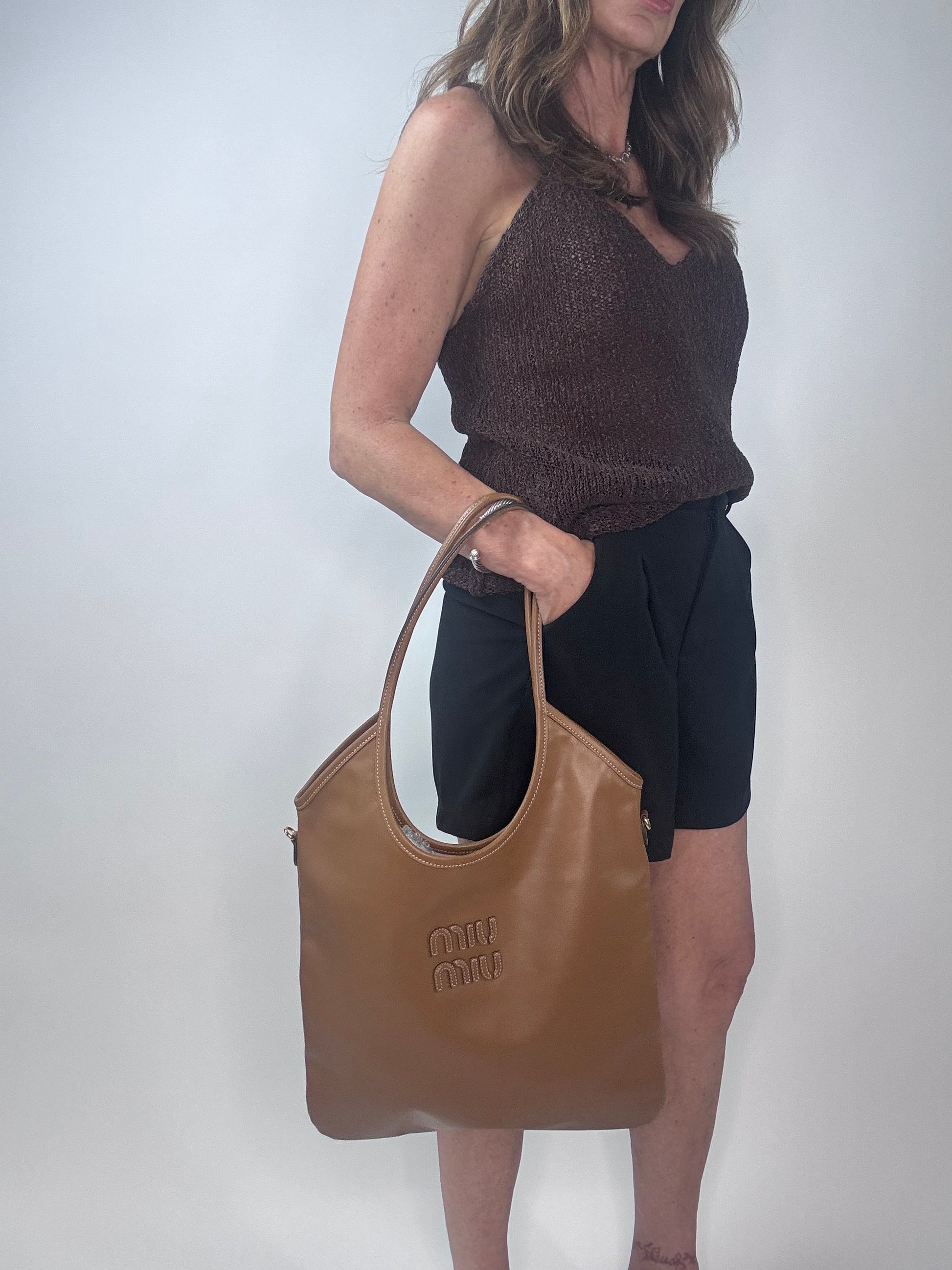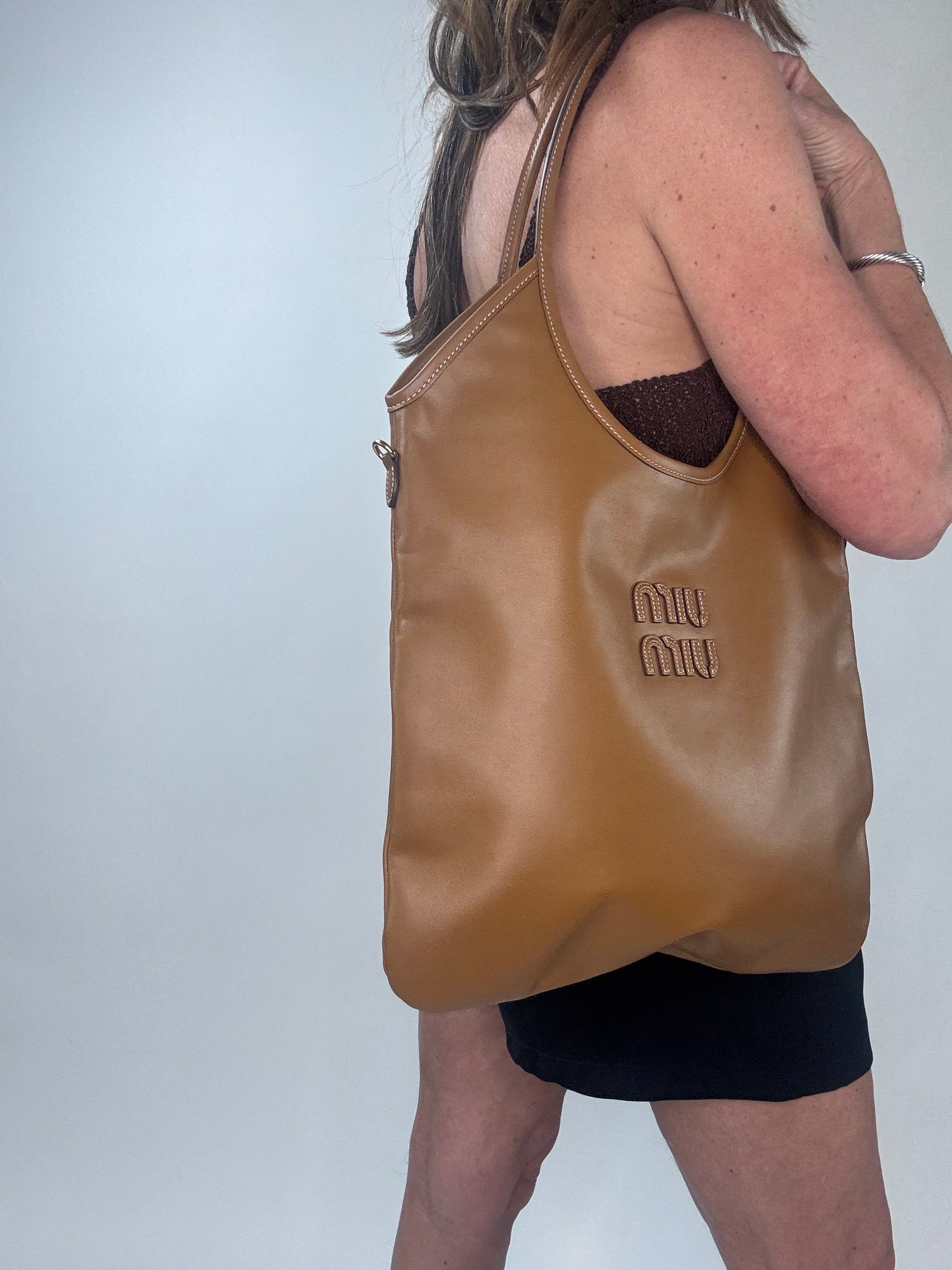 This authentic preowned Miu Miu Ivy Leather Shoulder Bag designed in beautiful light brown leather and the signature logo in stitched leather on the front. The off white interior fabric of this spacious interior, complete with a zipper pocket, gives this handbag the space of a tote with elegance.