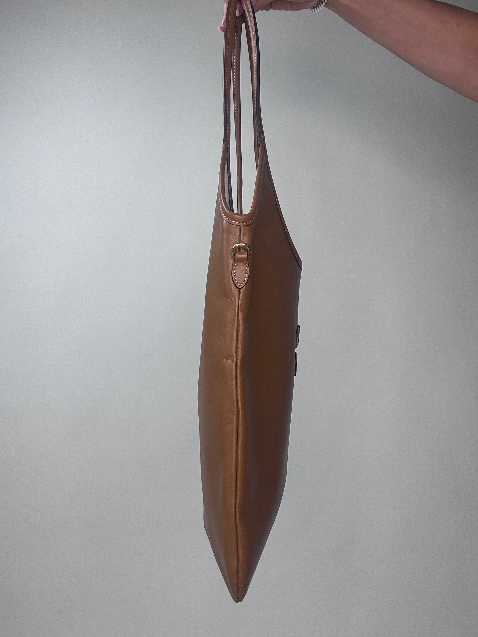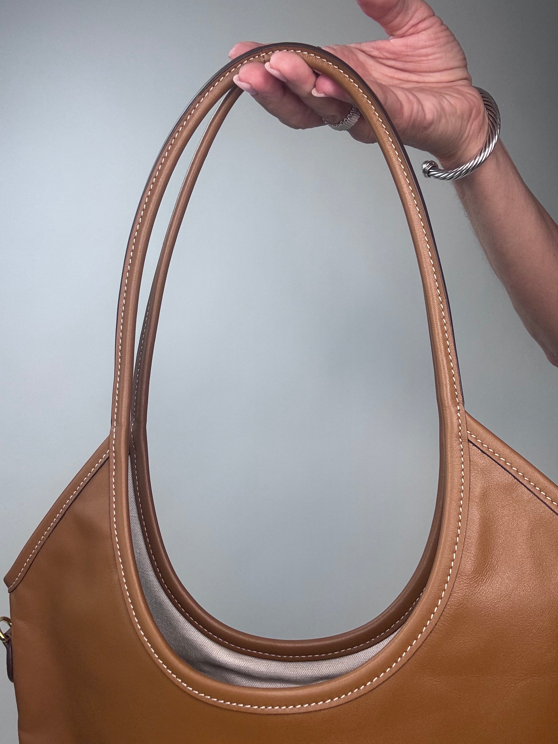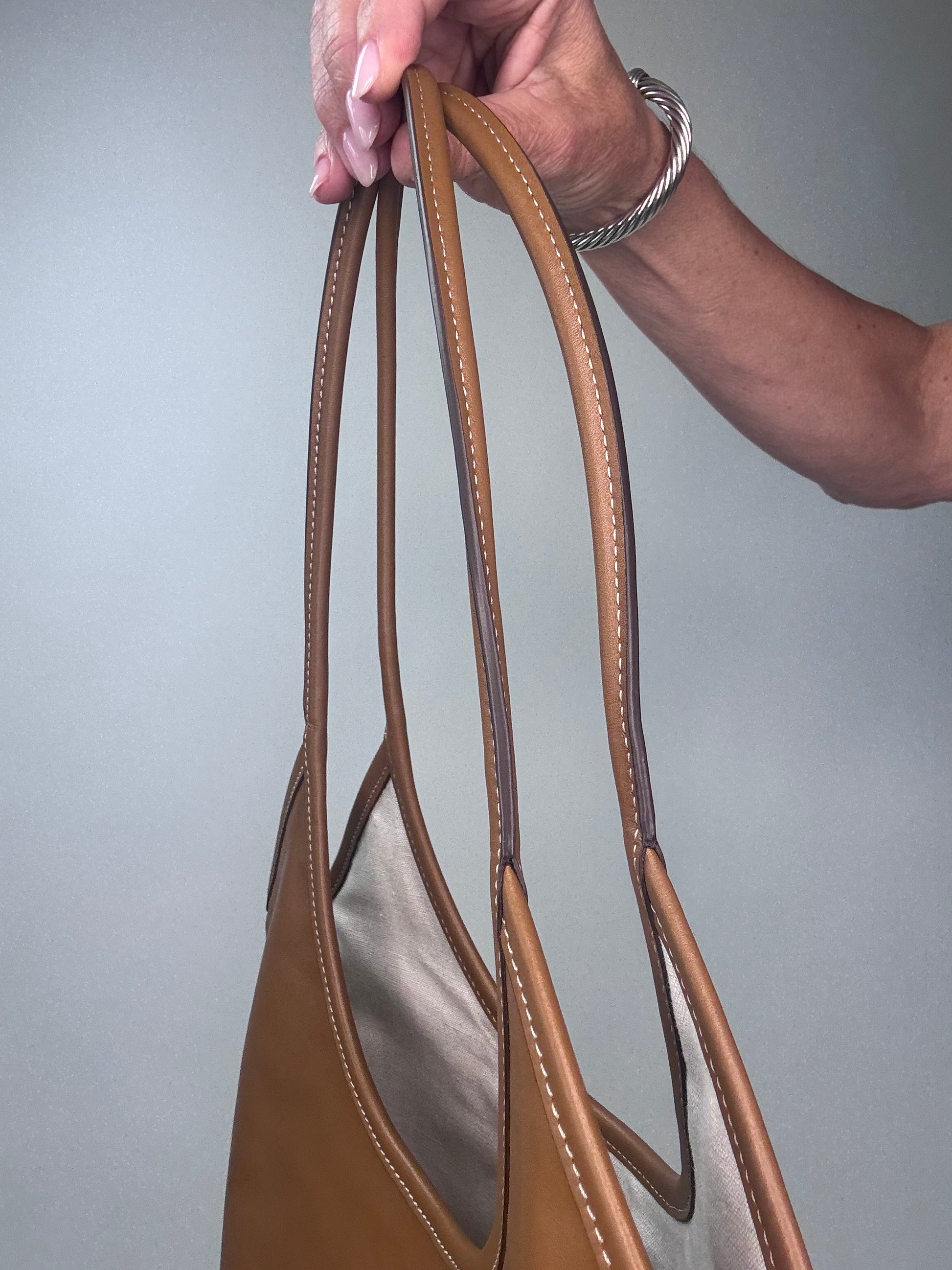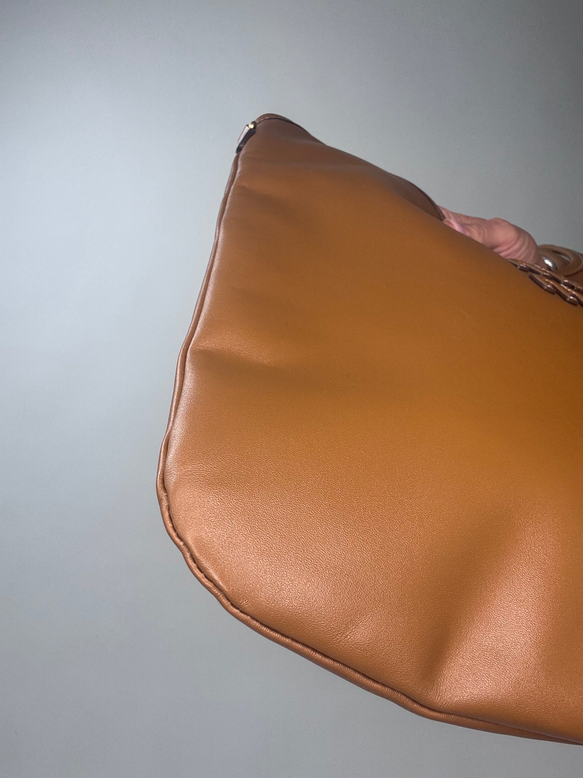 This authentic preowned Miu Miu Ivy Leather Shoulder Bag designed in beautiful light brown leather and the signature logo in stitched leather on the front. The off white interior fabric of this spacious interior, complete with a zipper pocket, gives this handbag the space of a tote with elegance.