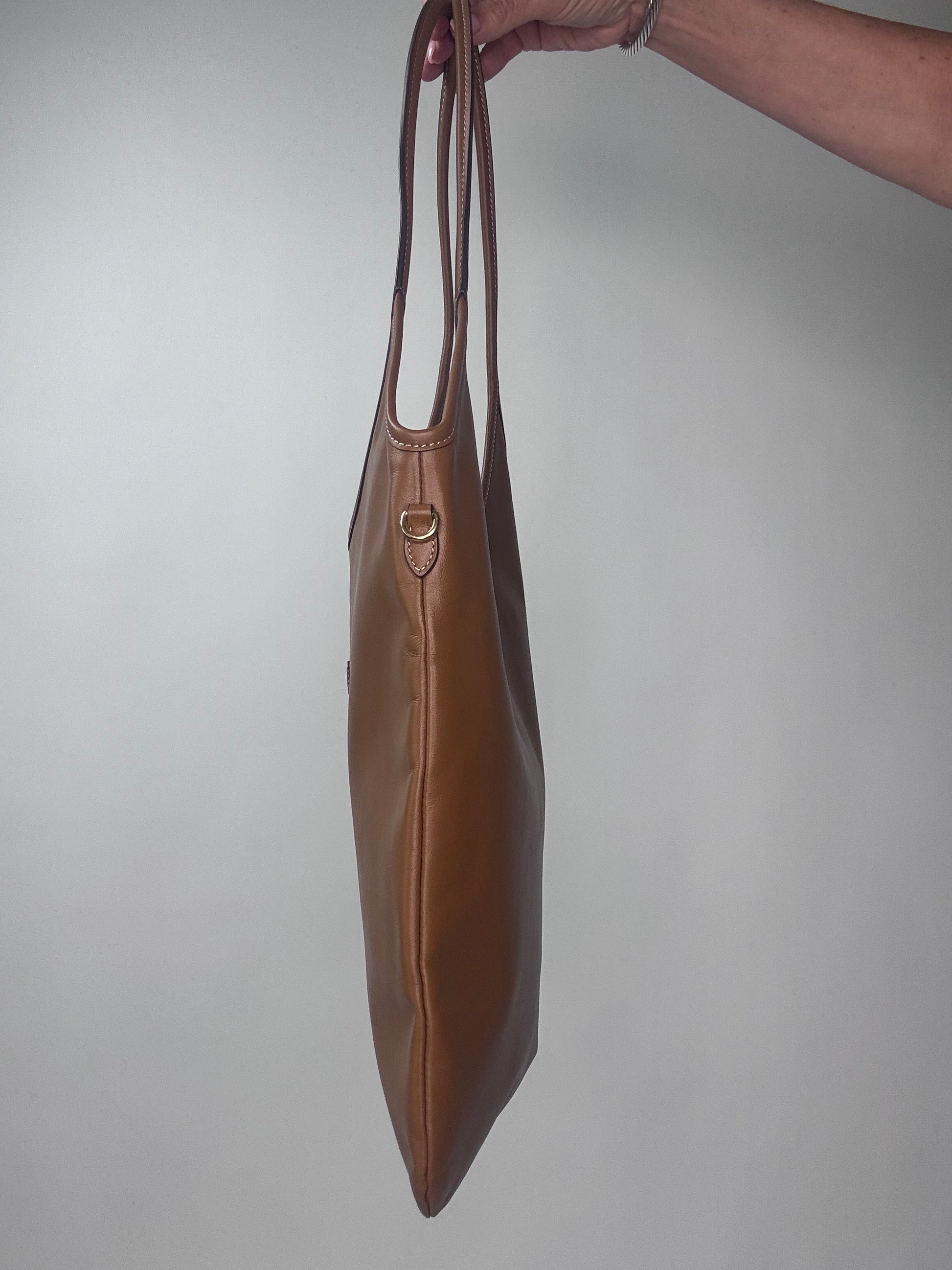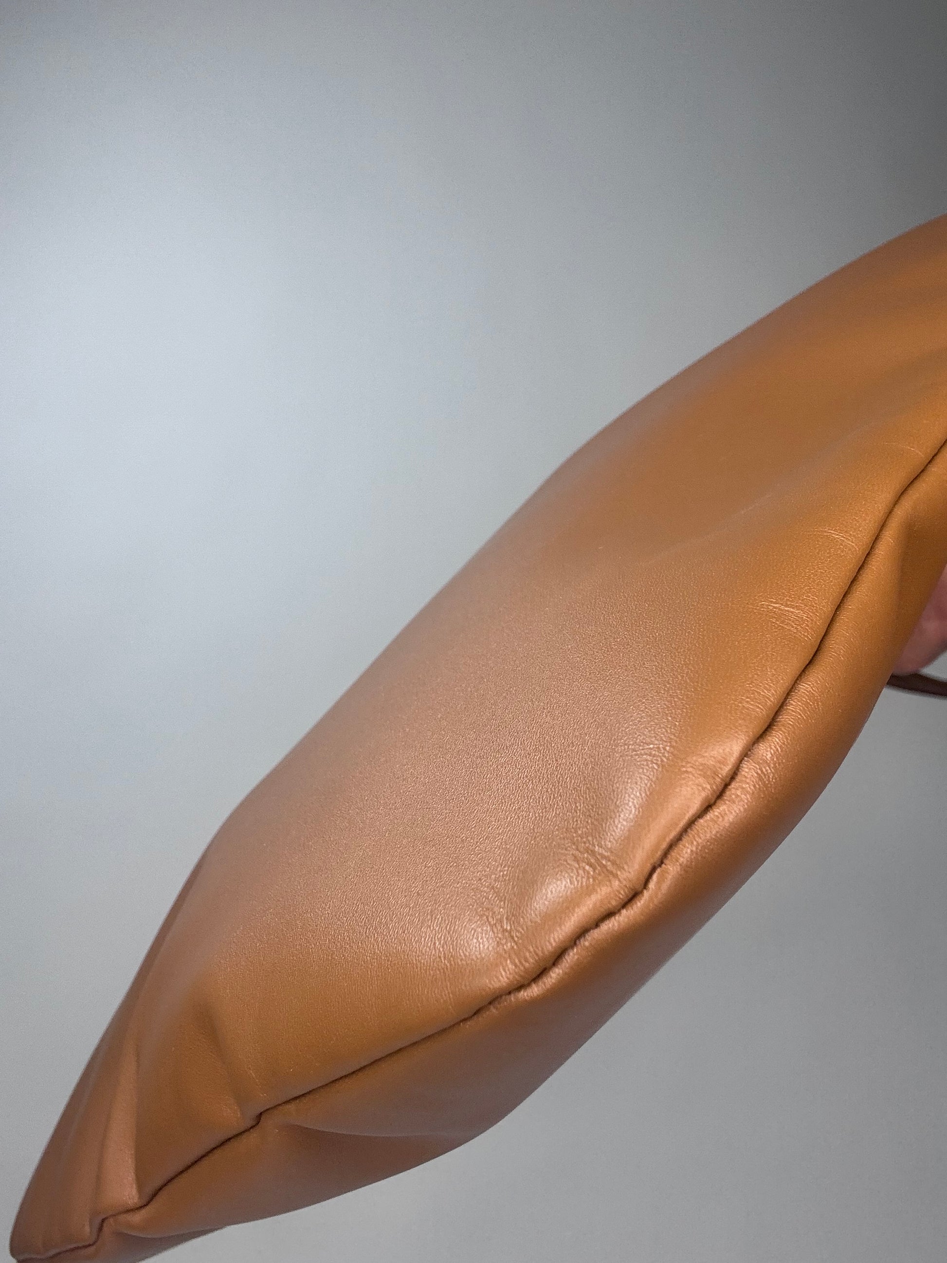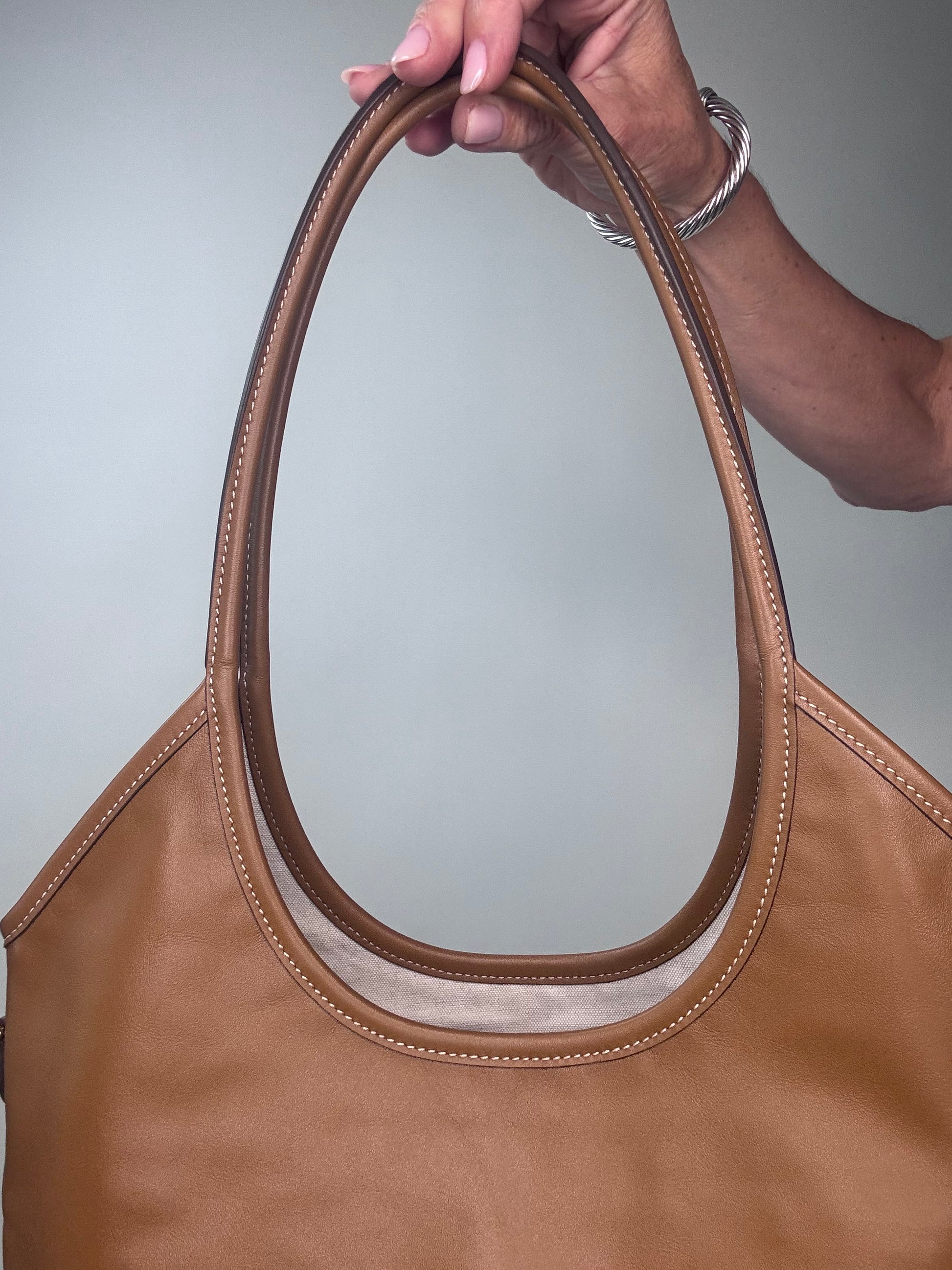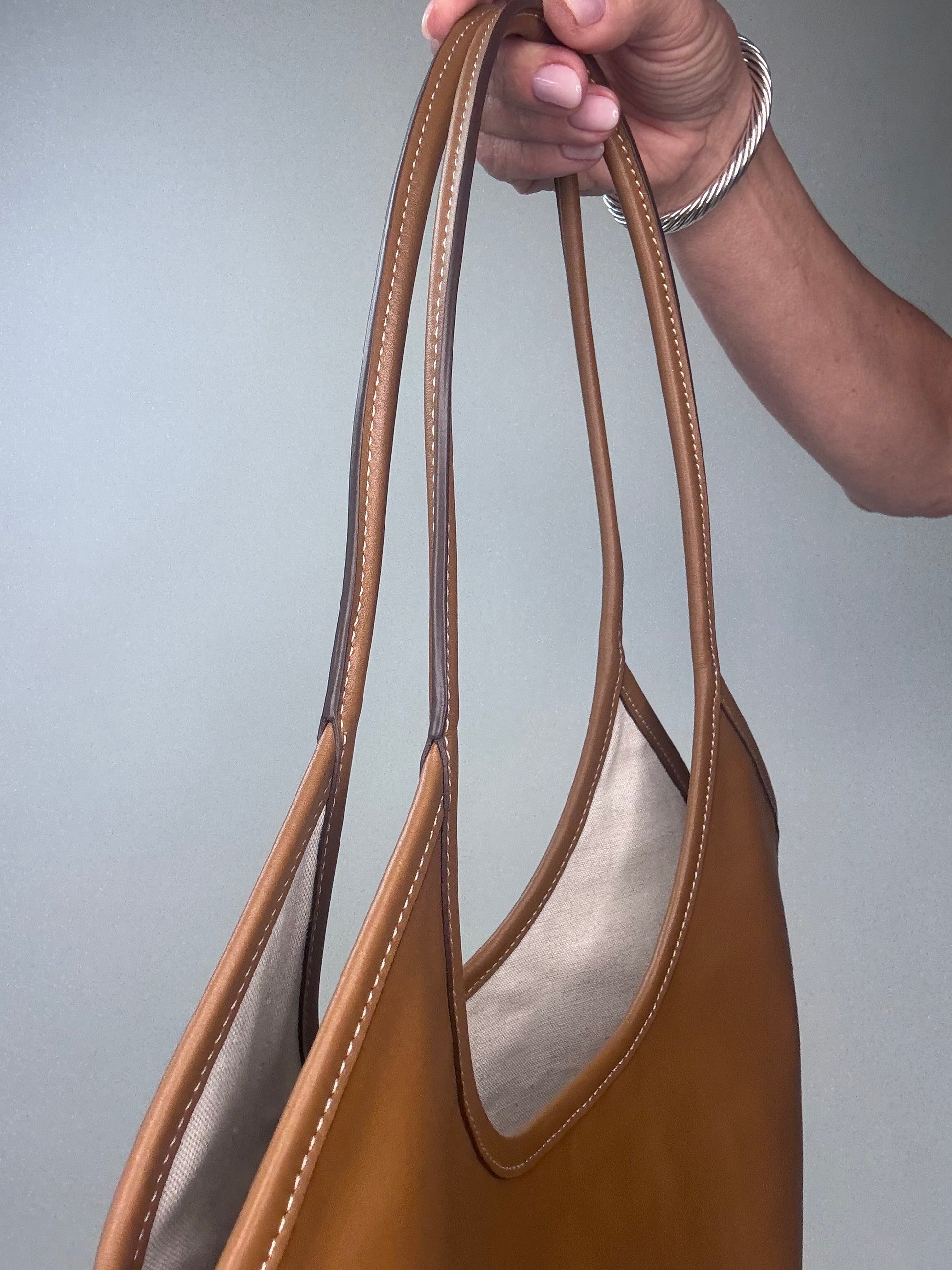 This authentic preowned Miu Miu Ivy Leather Shoulder Bag designed in beautiful light brown leather and the signature logo in stitched leather on the front. The off white interior fabric of this spacious interior, complete with a zipper pocket, gives this handbag the space of a tote with elegance.
